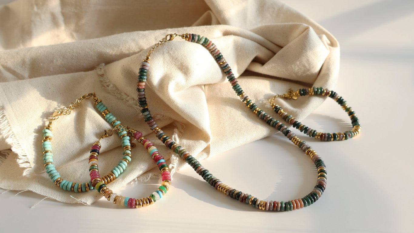 Collar ajustable en acero inoxidable con piedras naturales en varios colores tierra.