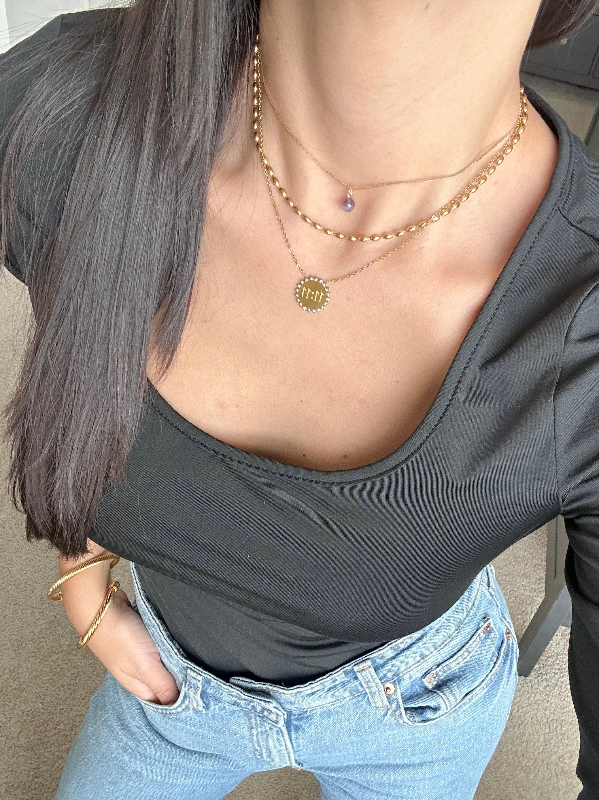 Adjustable stainless steel chain, available in gold or silver. Includes an extension chain for easy adjustment to different lengths and styles. Its durable material prevents damage or tarnishing, making it a perfect everyday essential or a great accessory to pair with your favorite necklaces.