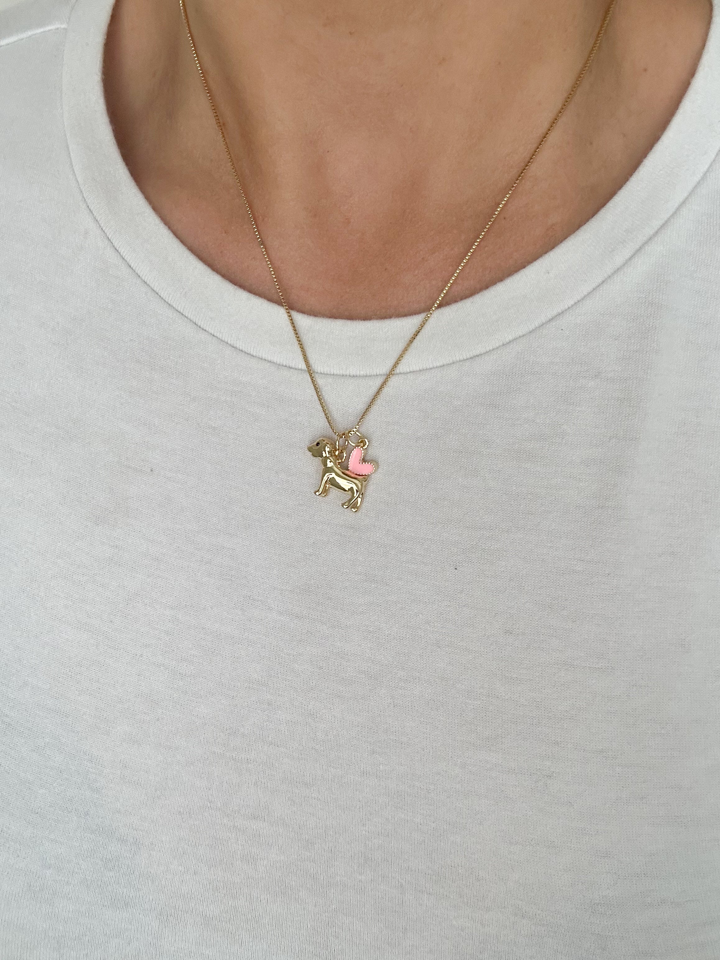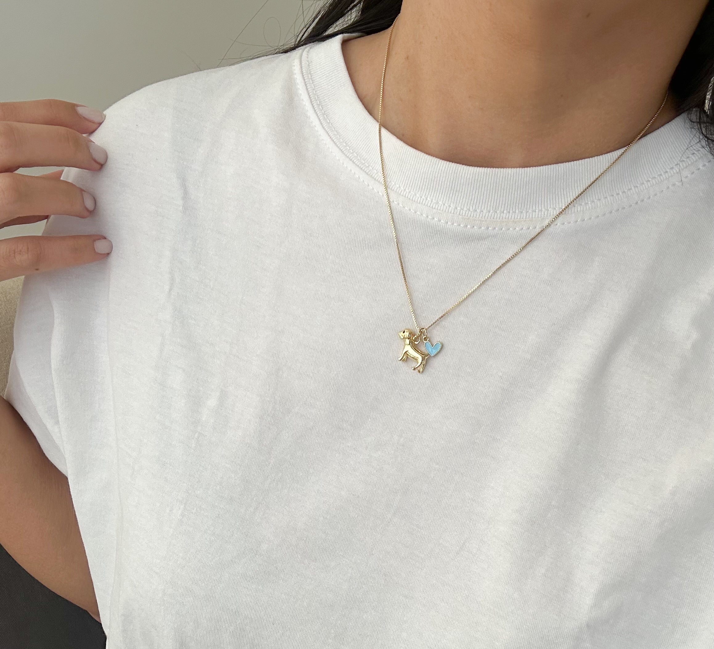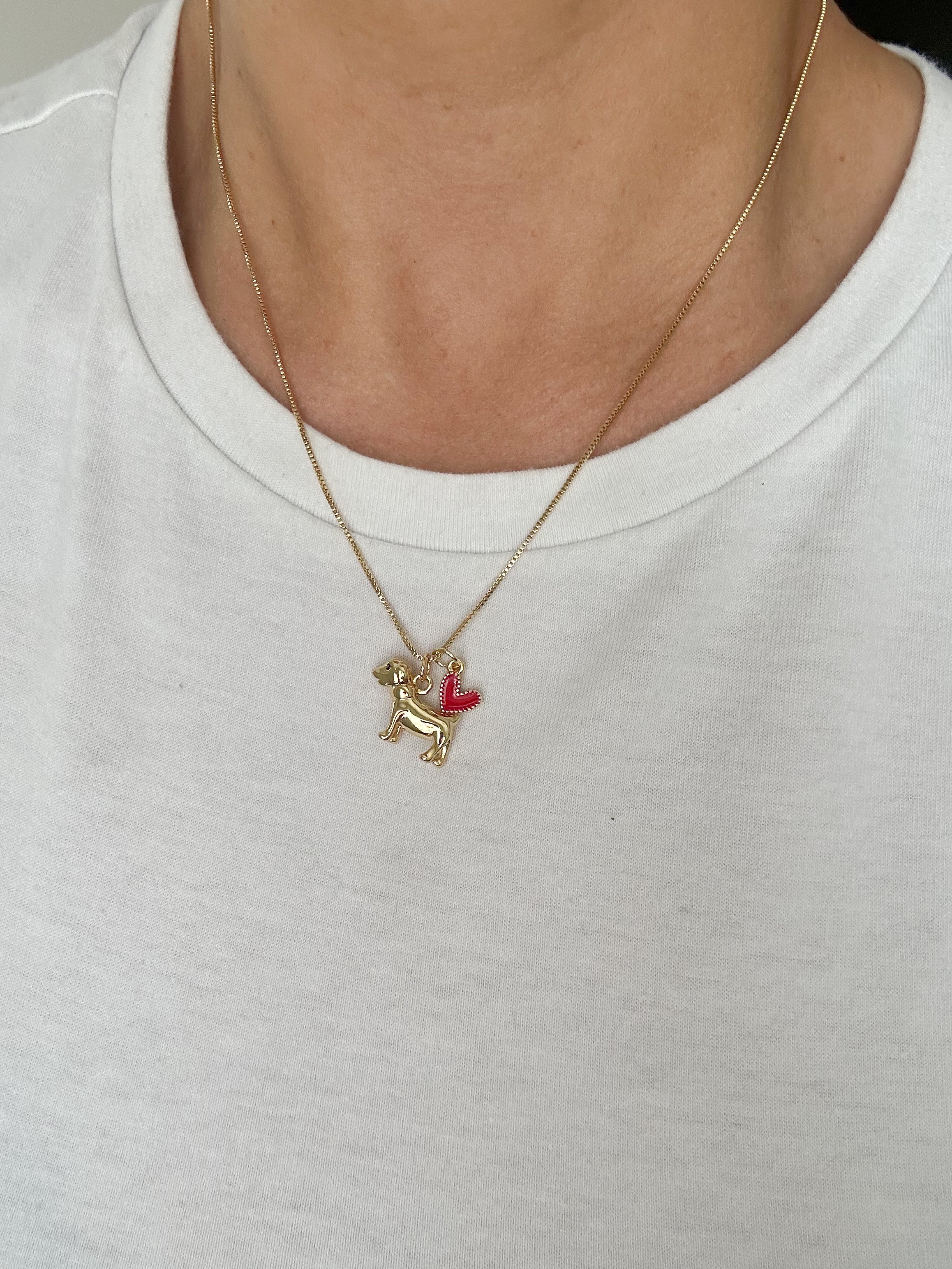 Gold-plated necklace with a dog and heart pendant, designed to add a sweet and special touch to your look. The heart is available in three different colors, allowing you to choose the one that resonates most with you. Measuring 45 cm (non-adjustable), it drapes elegantly across the chest and is perfect for wearing alone or layering with other necklaces. A delicate, modern piece full of meaning.