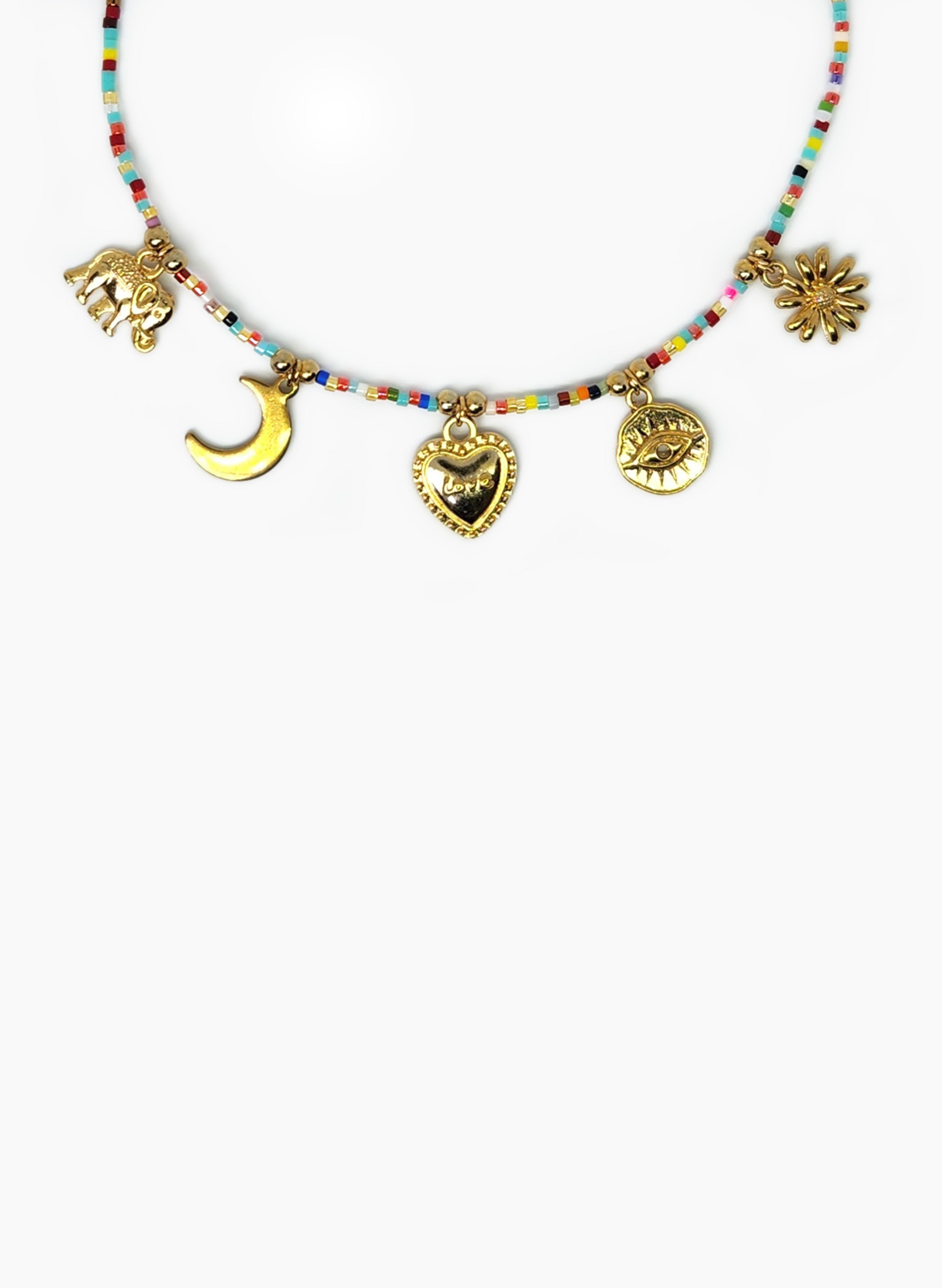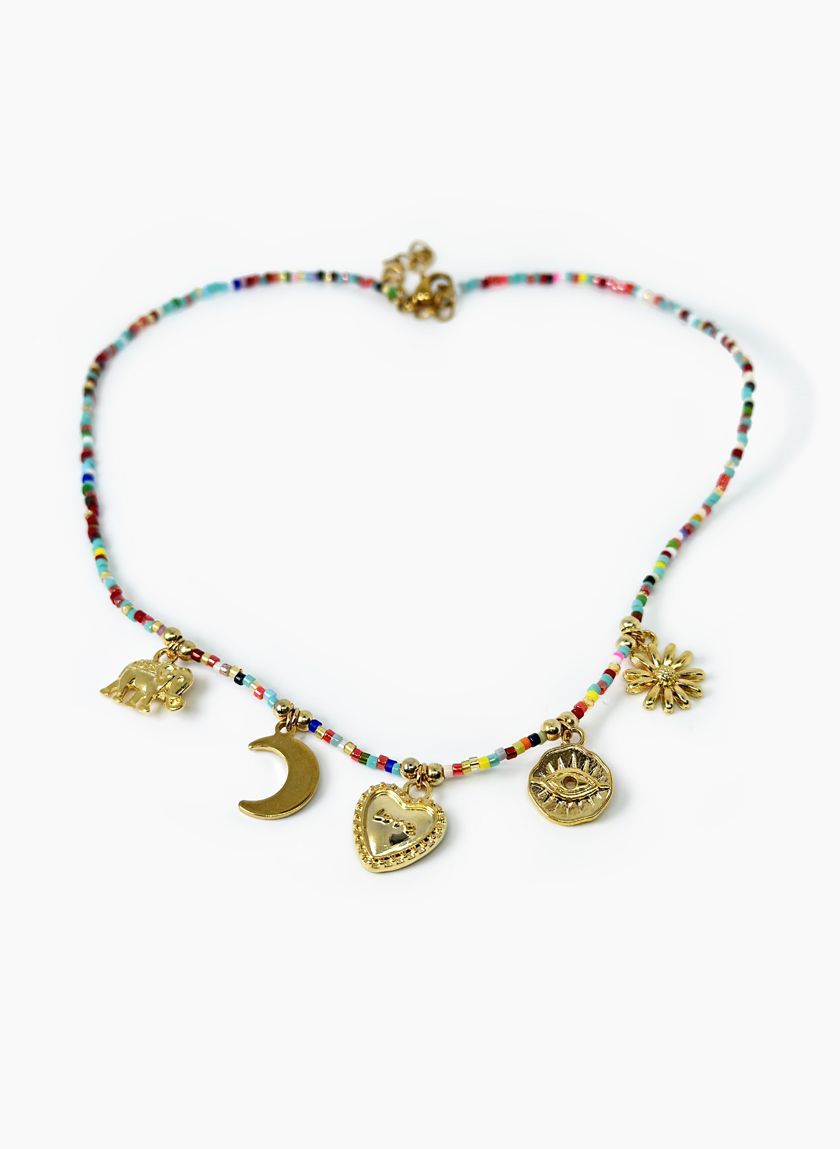 Chain made with seed beads and charms in rhodium with 24k gold plating.