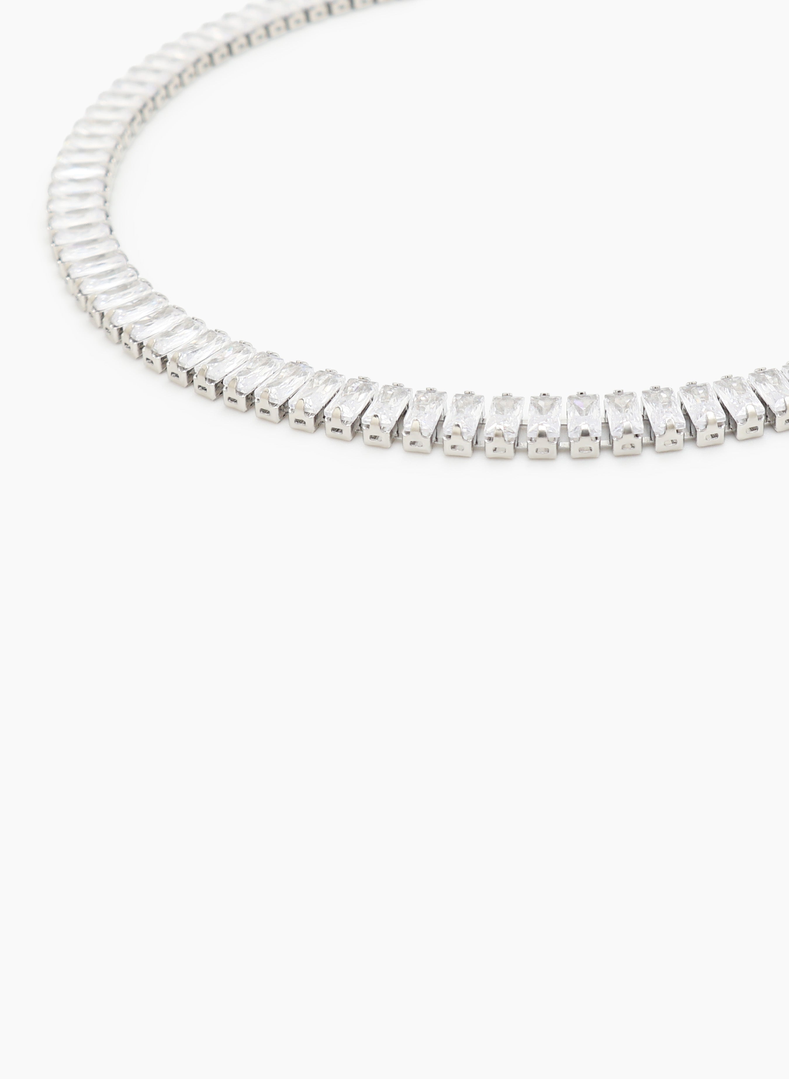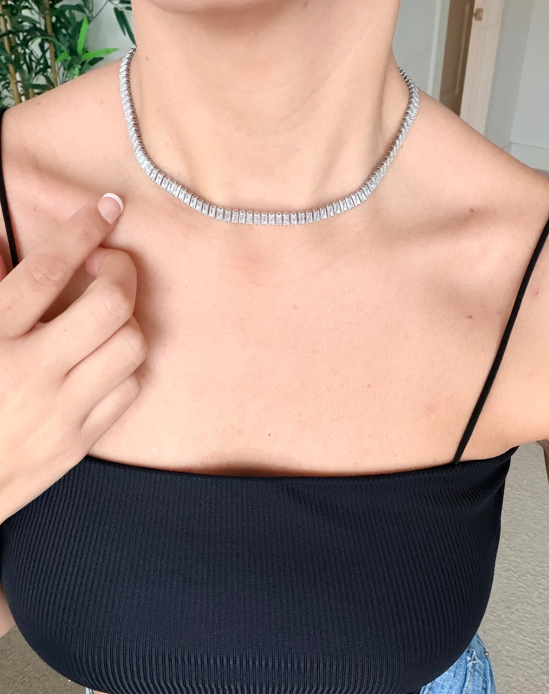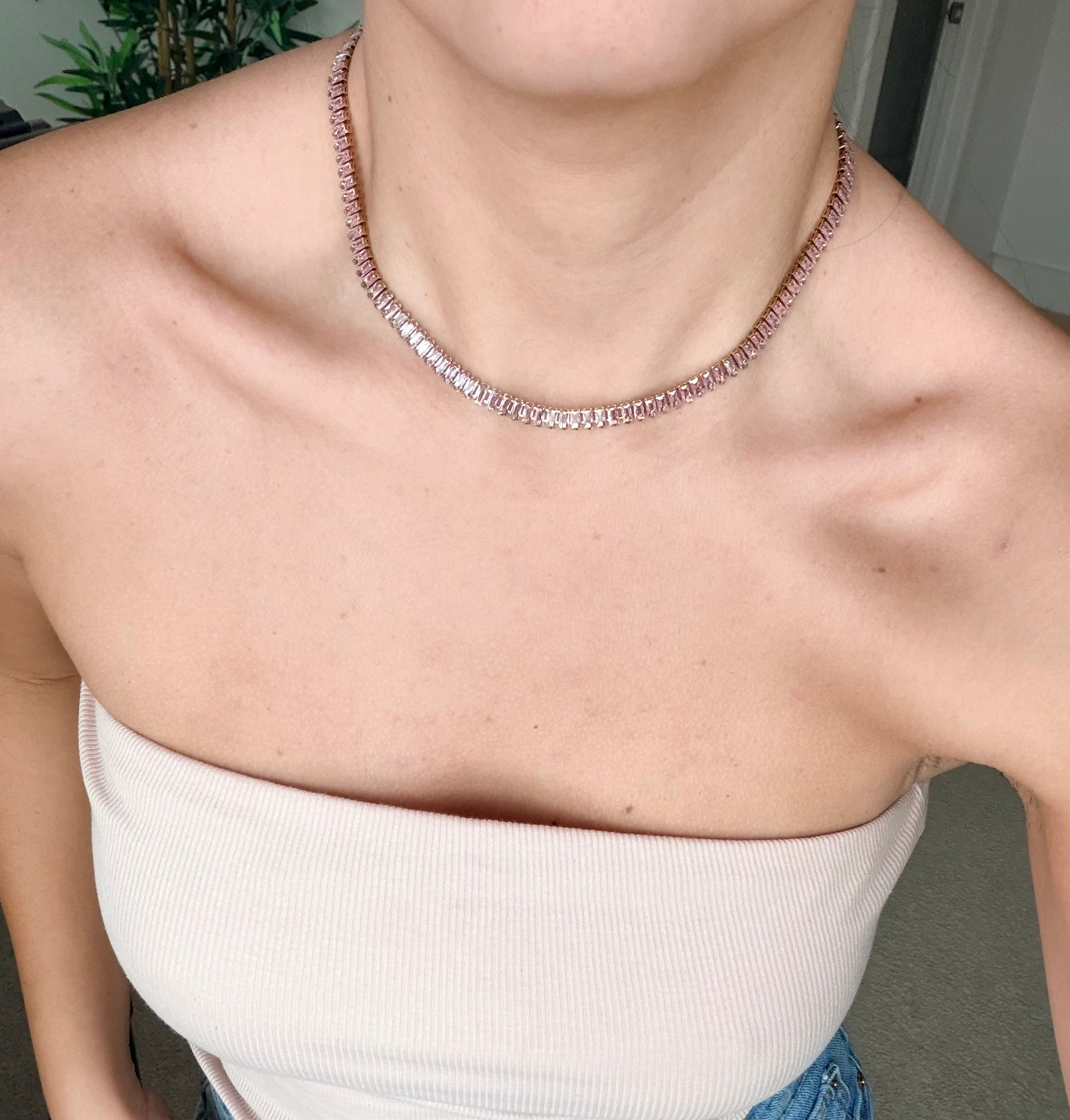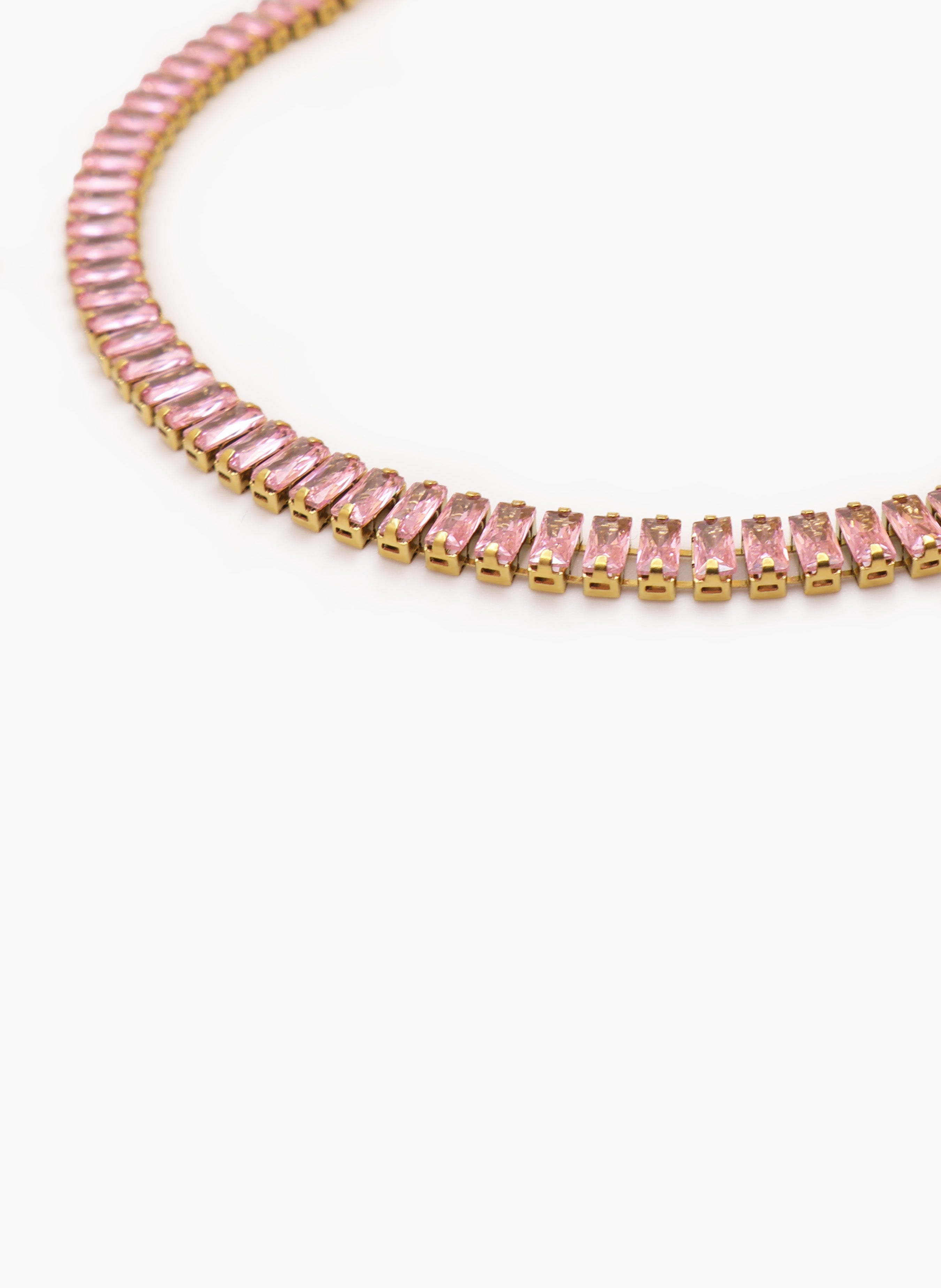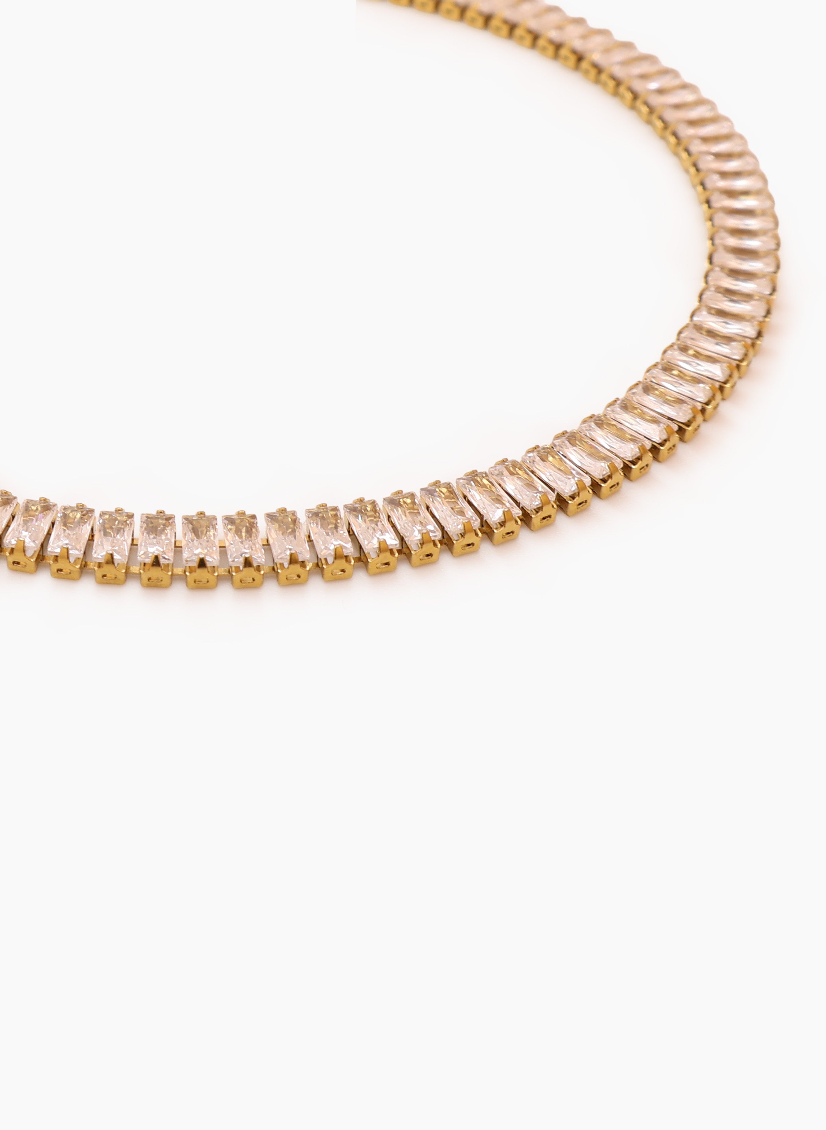 Tennis-style chain crafted from stainless steel and adorned with cubic zirconia stones, available in gold, silver, or rose gold tones. Its classic, sparkling design makes it a versatile piece that enhances any look, from casual outfits to more elegant attire. Measuring 40 cm (15.7 in), it sits comfortably around the neck for a delicate and sophisticated effect. Durable, luminous, and designed to stand out, this chain is an essential addition to any accessory collection.