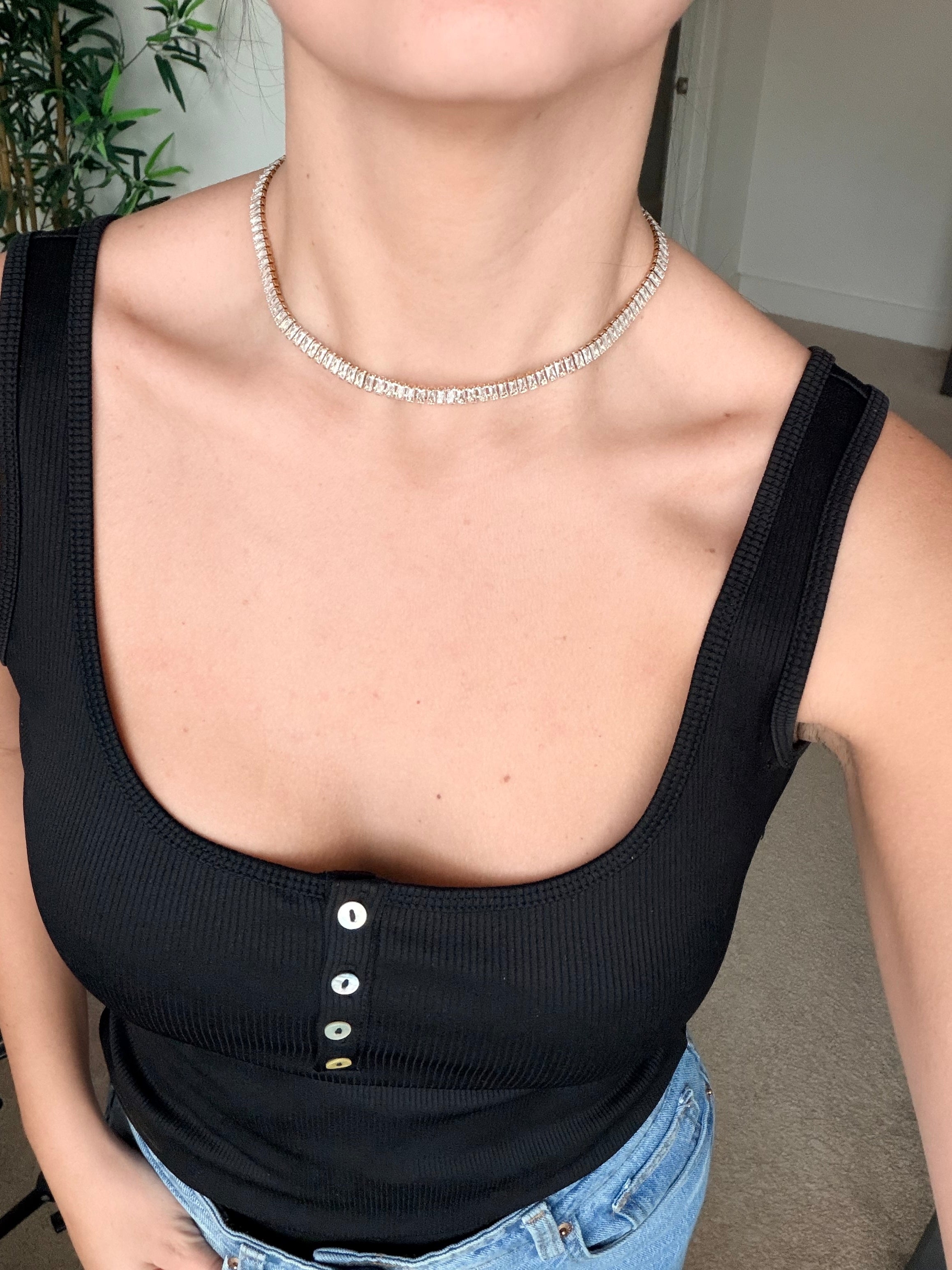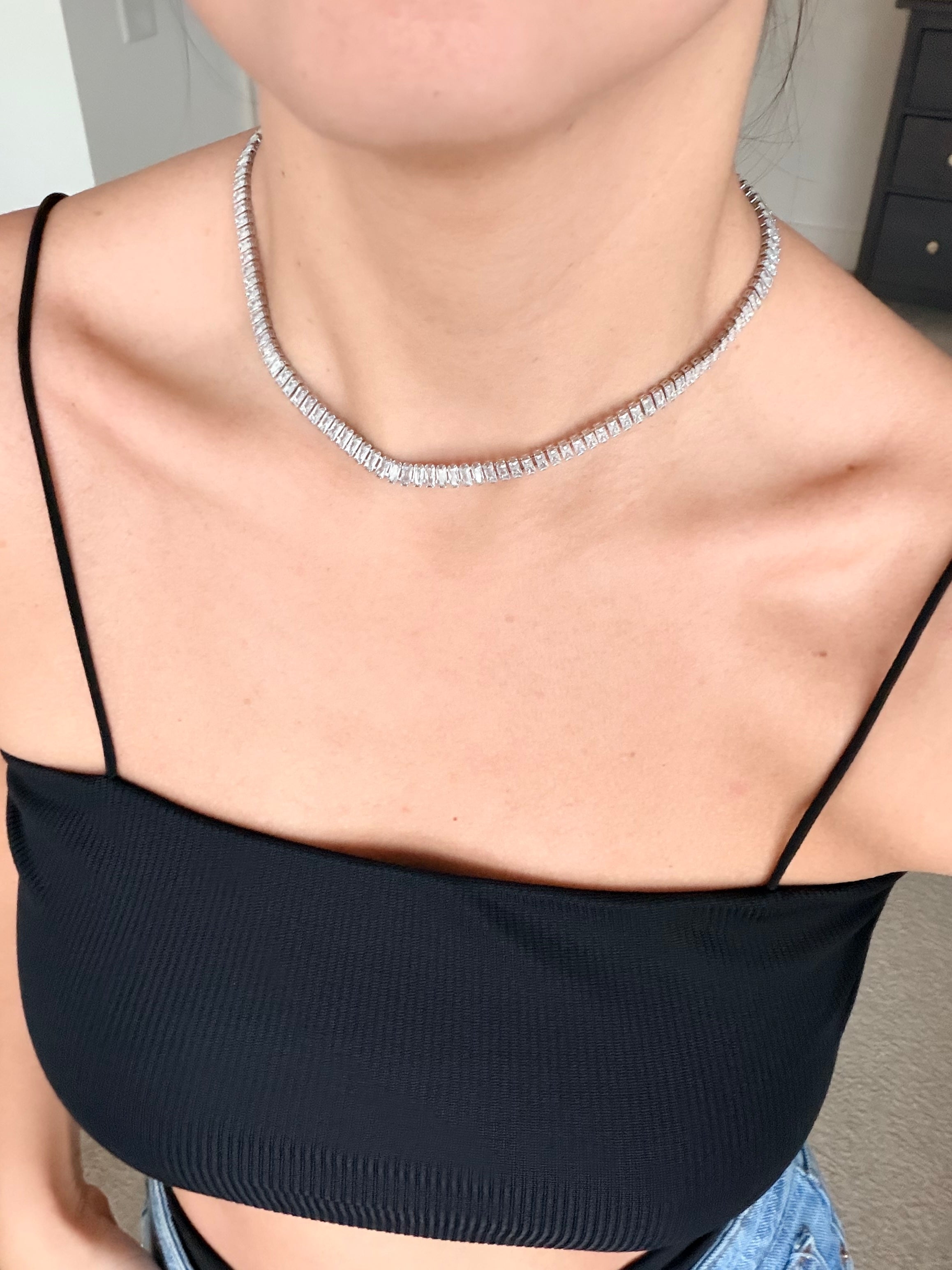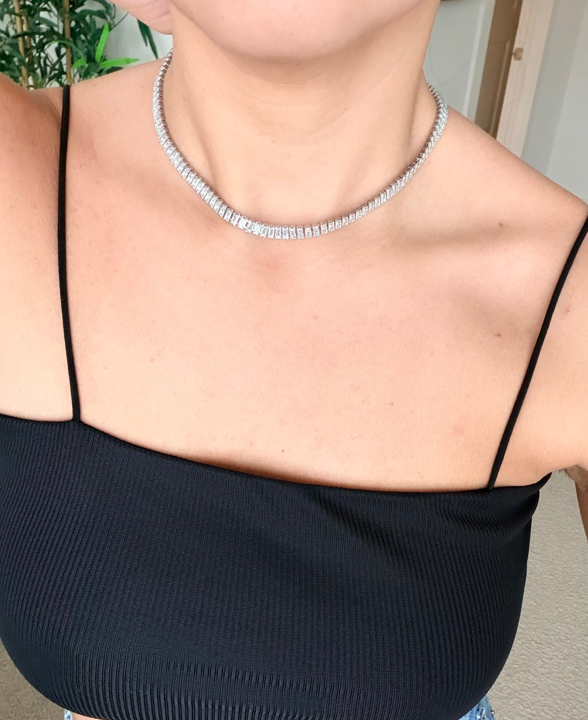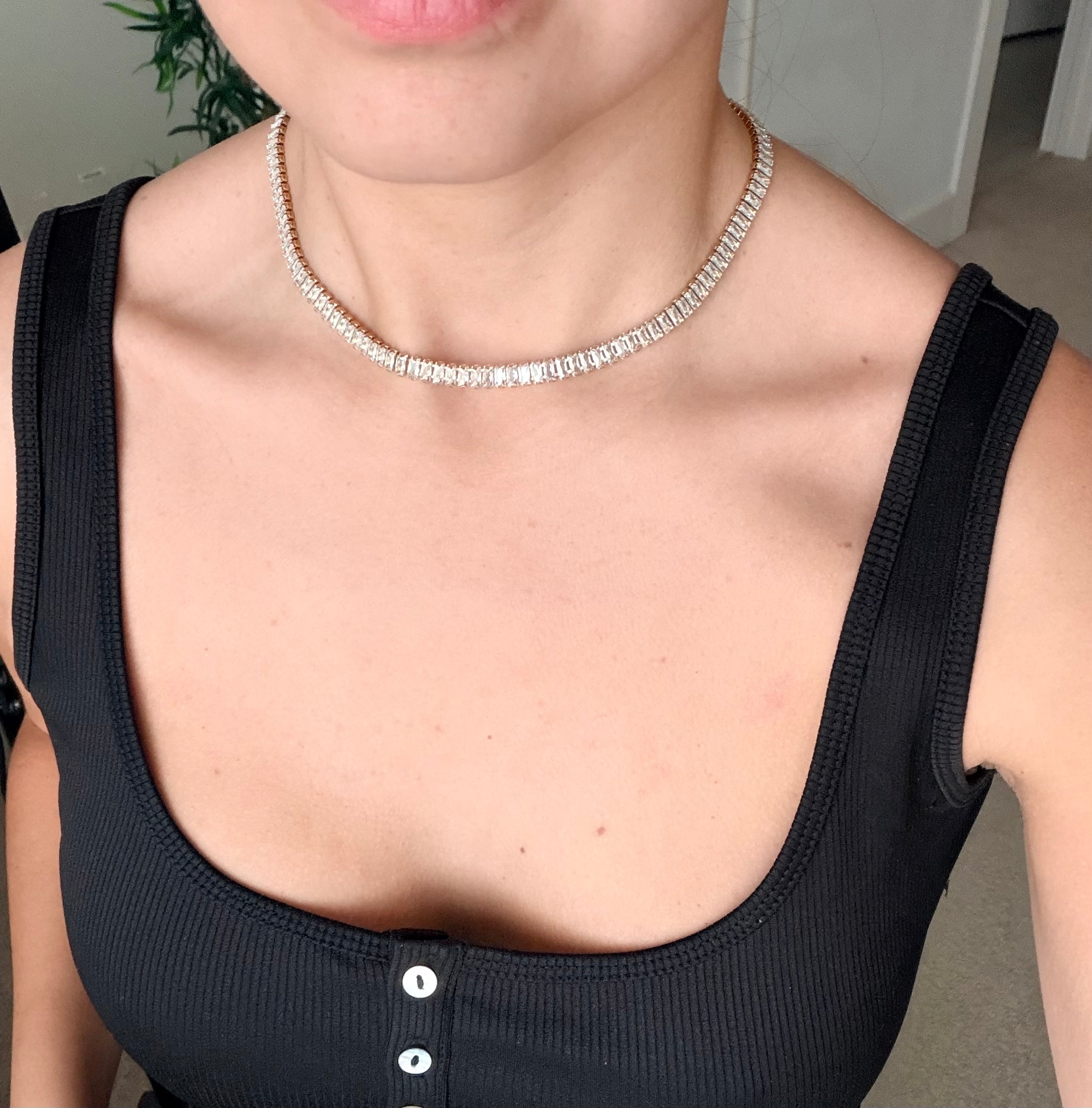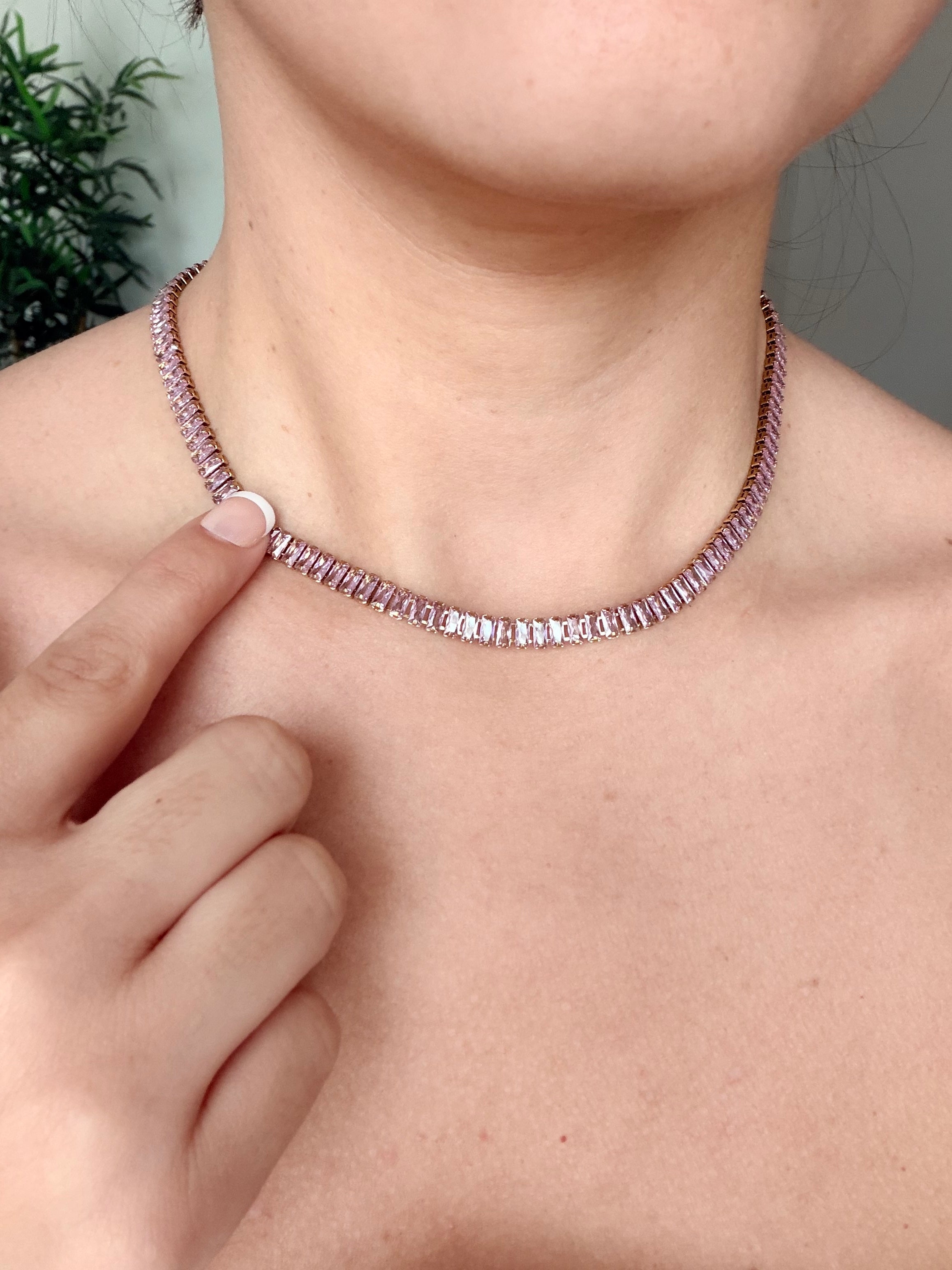 Tennis-style chain crafted from stainless steel and adorned with cubic zirconia stones, available in gold, silver, or rose gold tones. Its classic, sparkling design makes it a versatile piece that enhances any look, from casual outfits to more elegant attire. Measuring 40 cm (15.7 in), it sits comfortably around the neck for a delicate and sophisticated effect. Durable, luminous, and designed to stand out, this chain is an essential addition to any accessory collection.