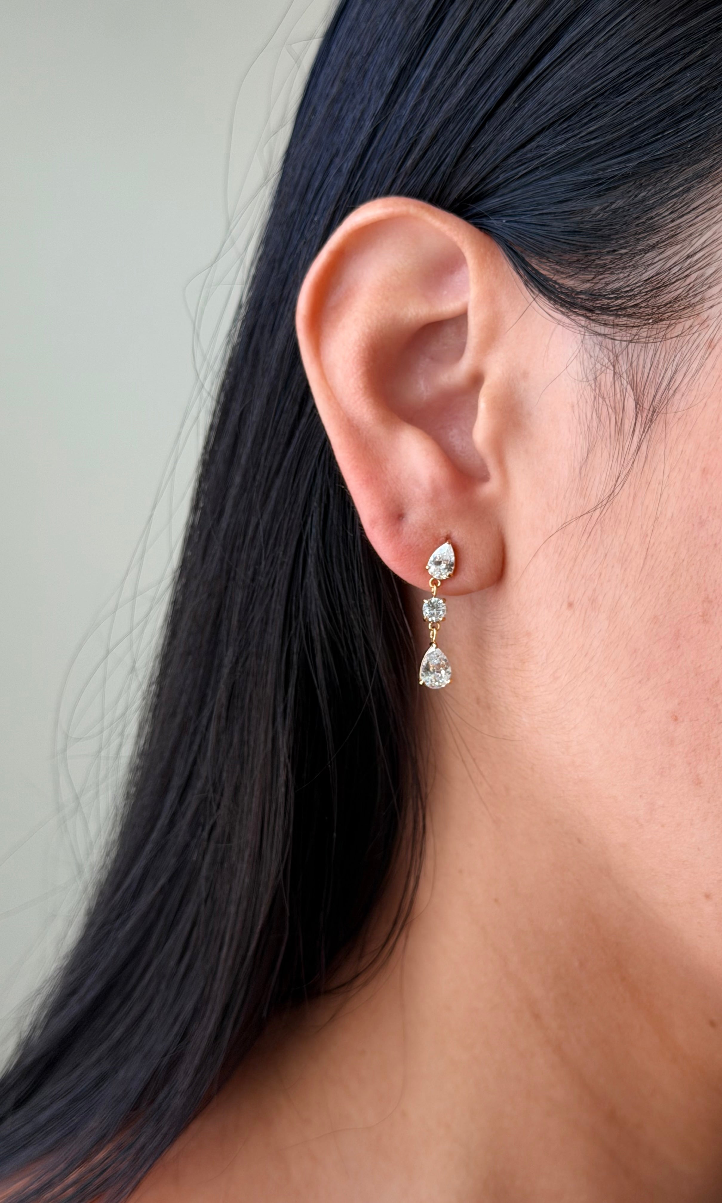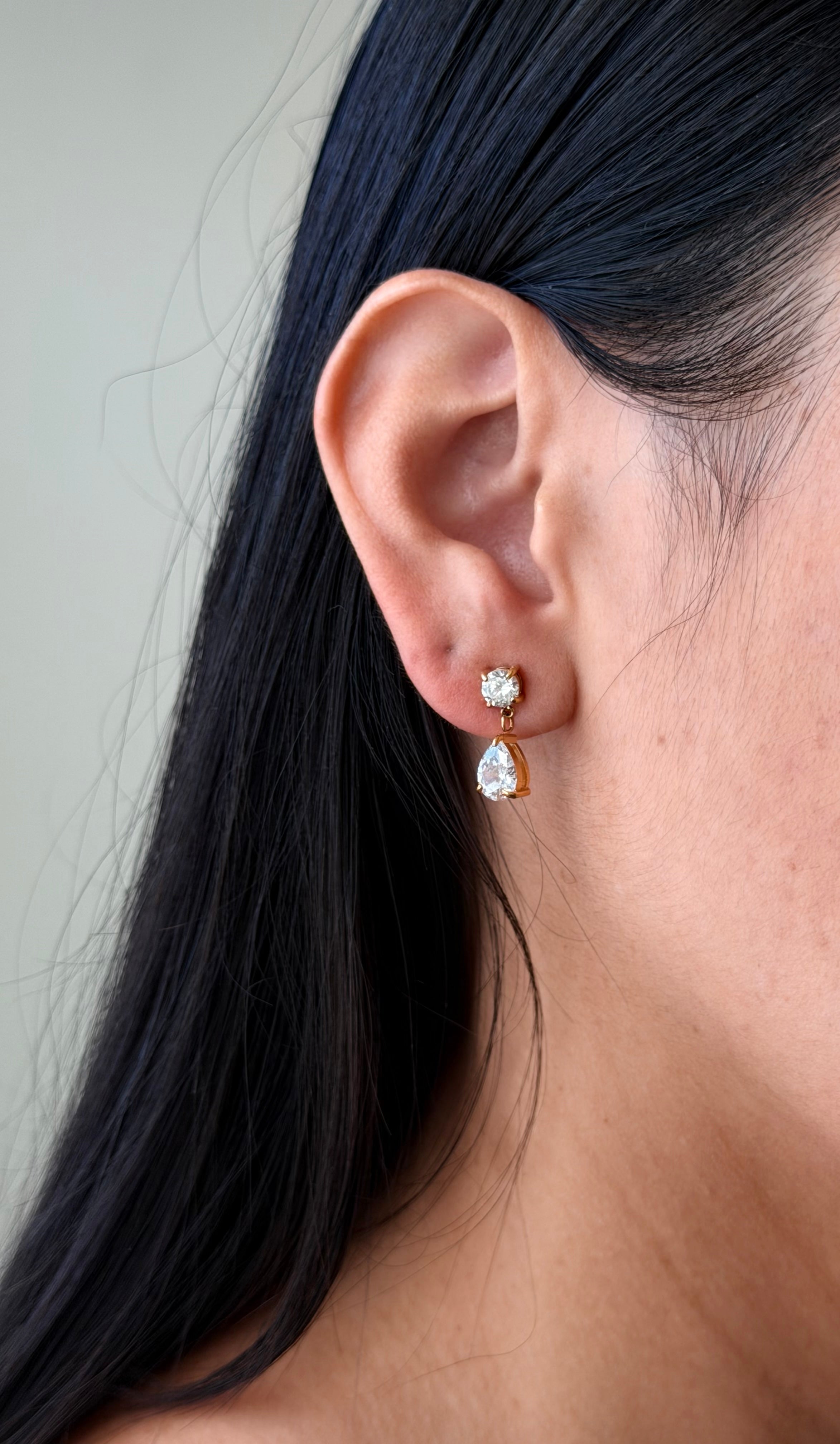 Aretes de dos o tres gotas en acero inoxidable con circones clear, pensados para destacar con un toque delicado y sofisticado.