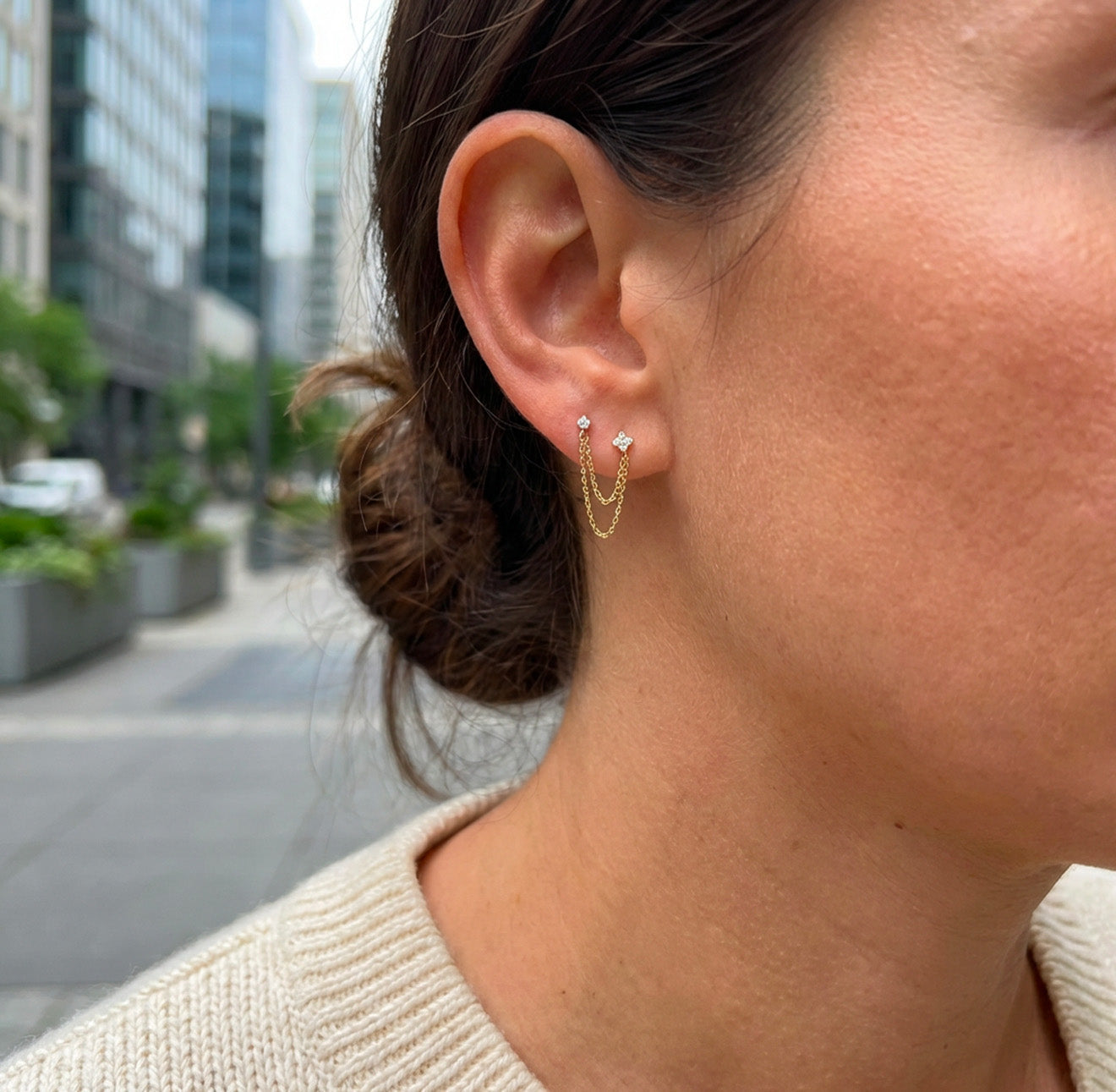 Aretes de cadena doble en plata 925, diseñados para llevar en dos perforaciones en la misma oreja. Su estilo delicado crea un efecto moderno y elegante al conectar ambas perforaciones con una fina cadena.