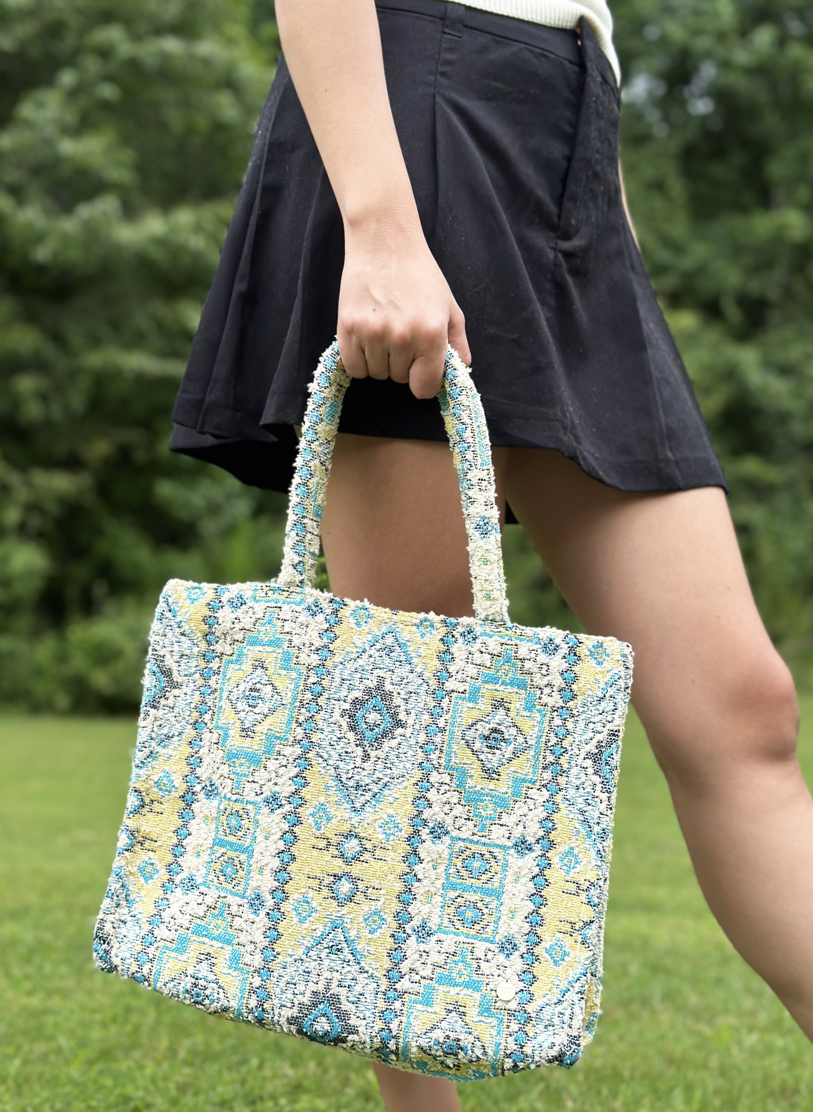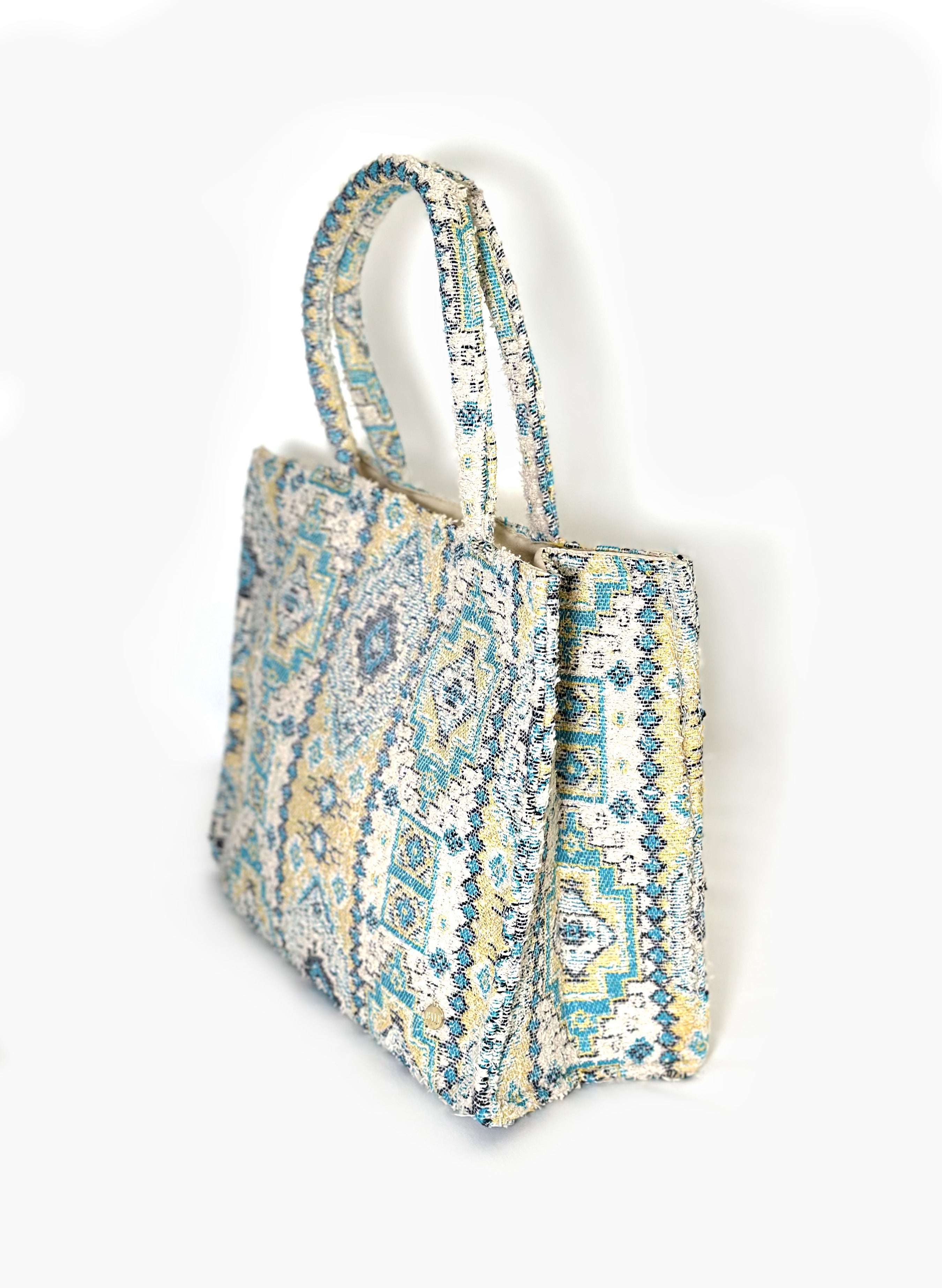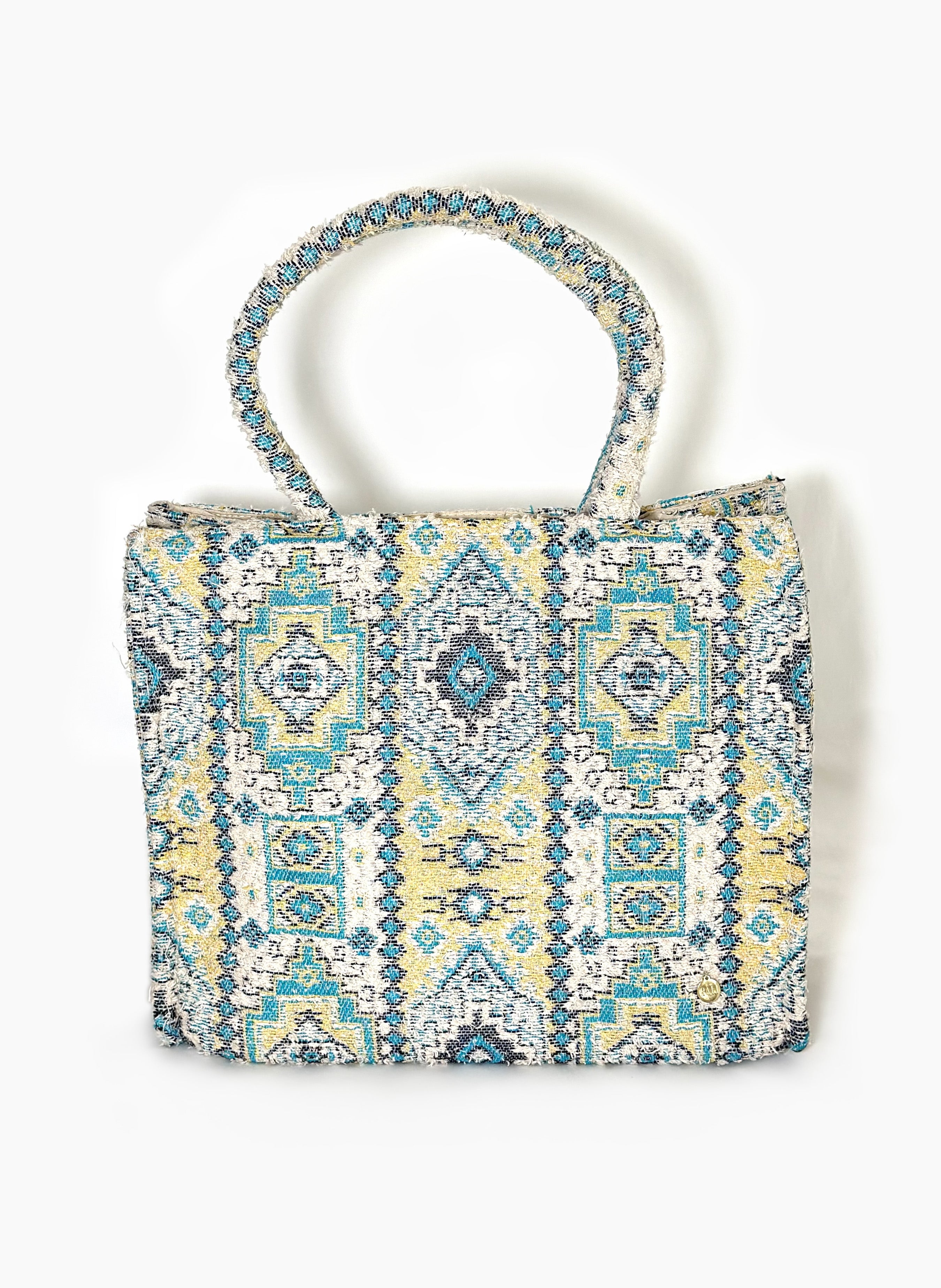 Bolso estilo tote hecho con material jacquard, bolsillo interno.