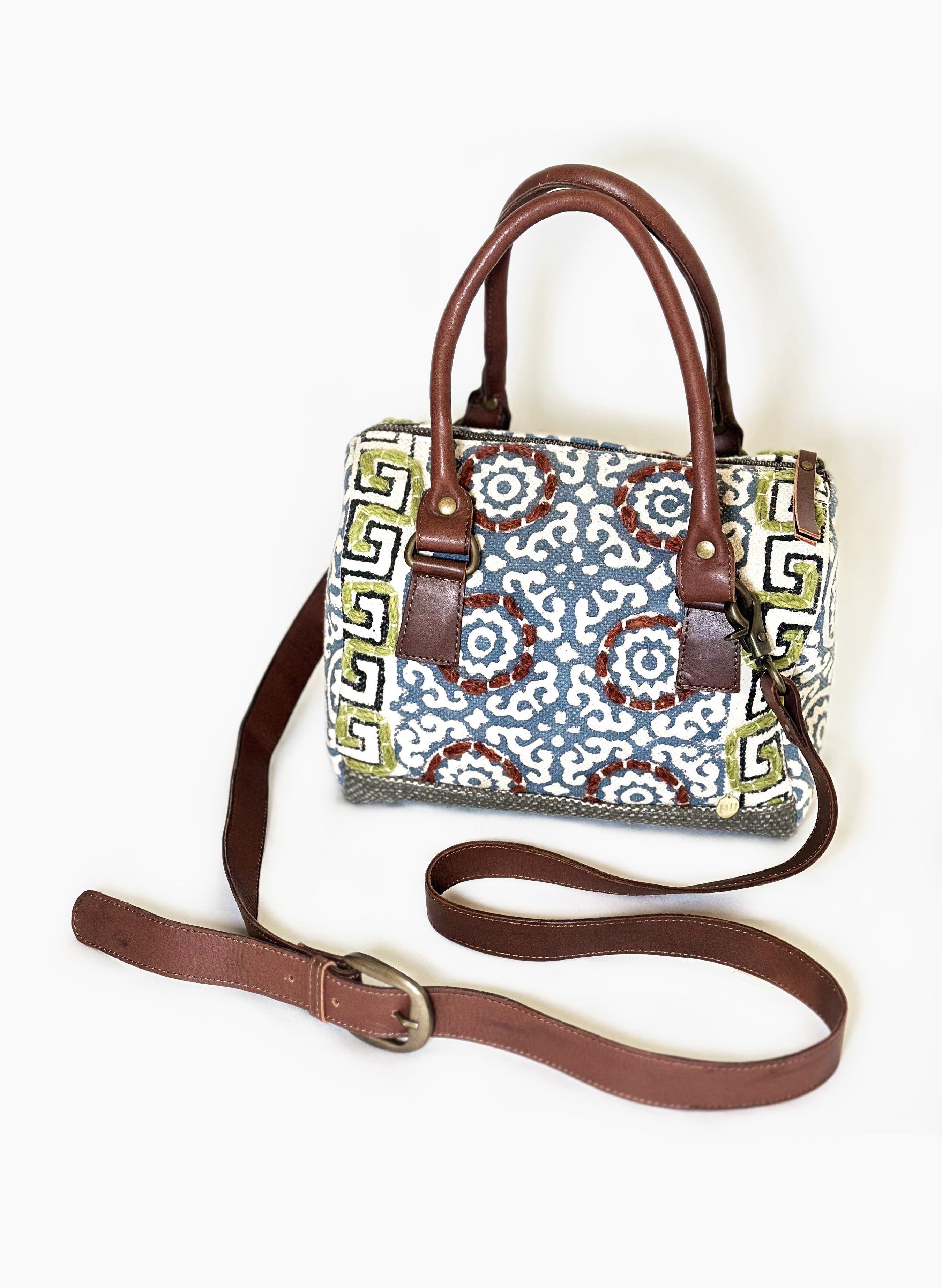 Bolso hecho en Jacquard con bolsillo interno con cierre. Correa corta y larga