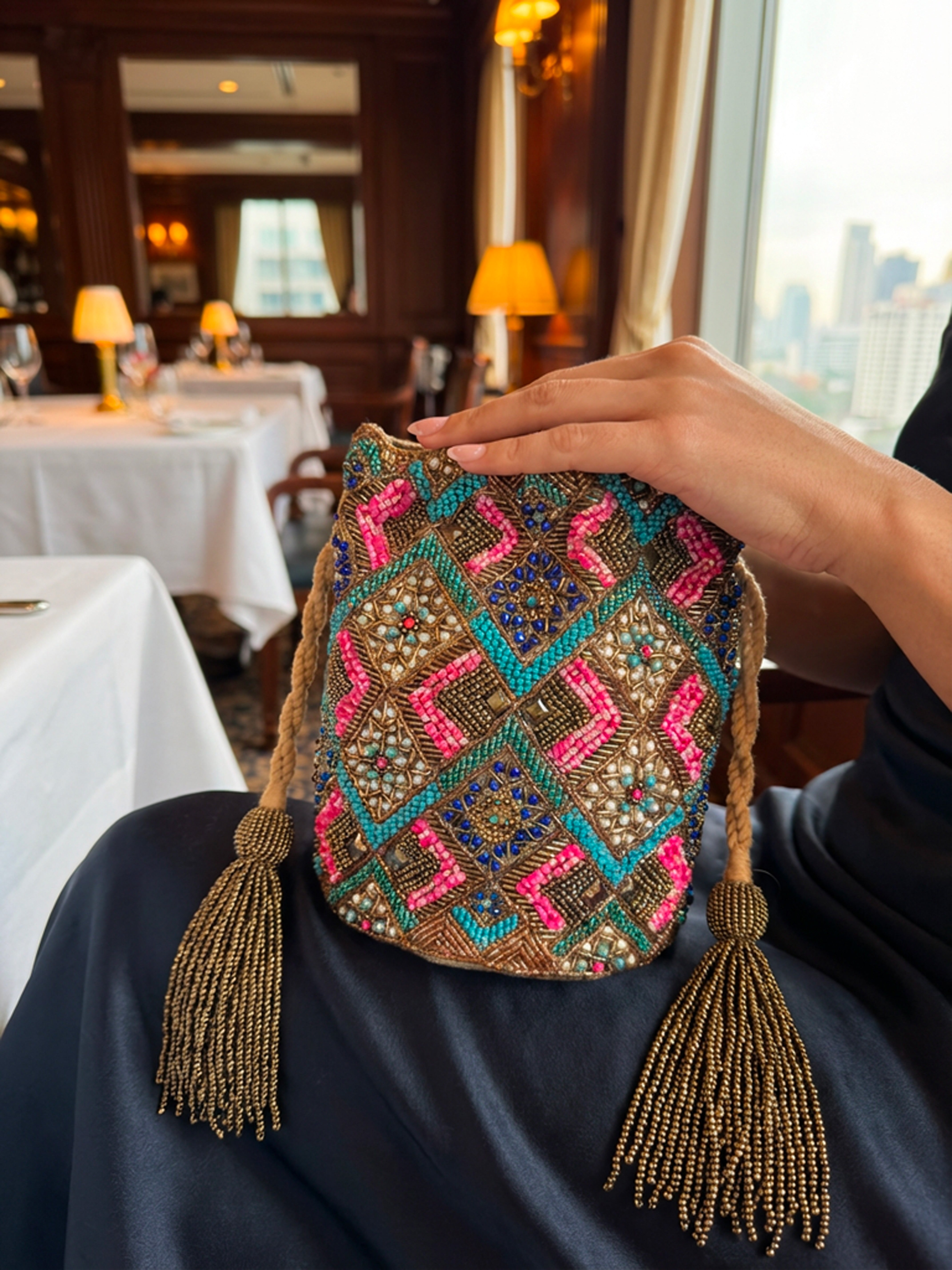 Mochila artesanal con pedrería en variados colores y tamaños, diseñada con una cadena que permite usarla cruzada o sobre los hombros. Ideal para un estilo casual, añade un toque elegante y sofisticado que eleva cualquier outfit.