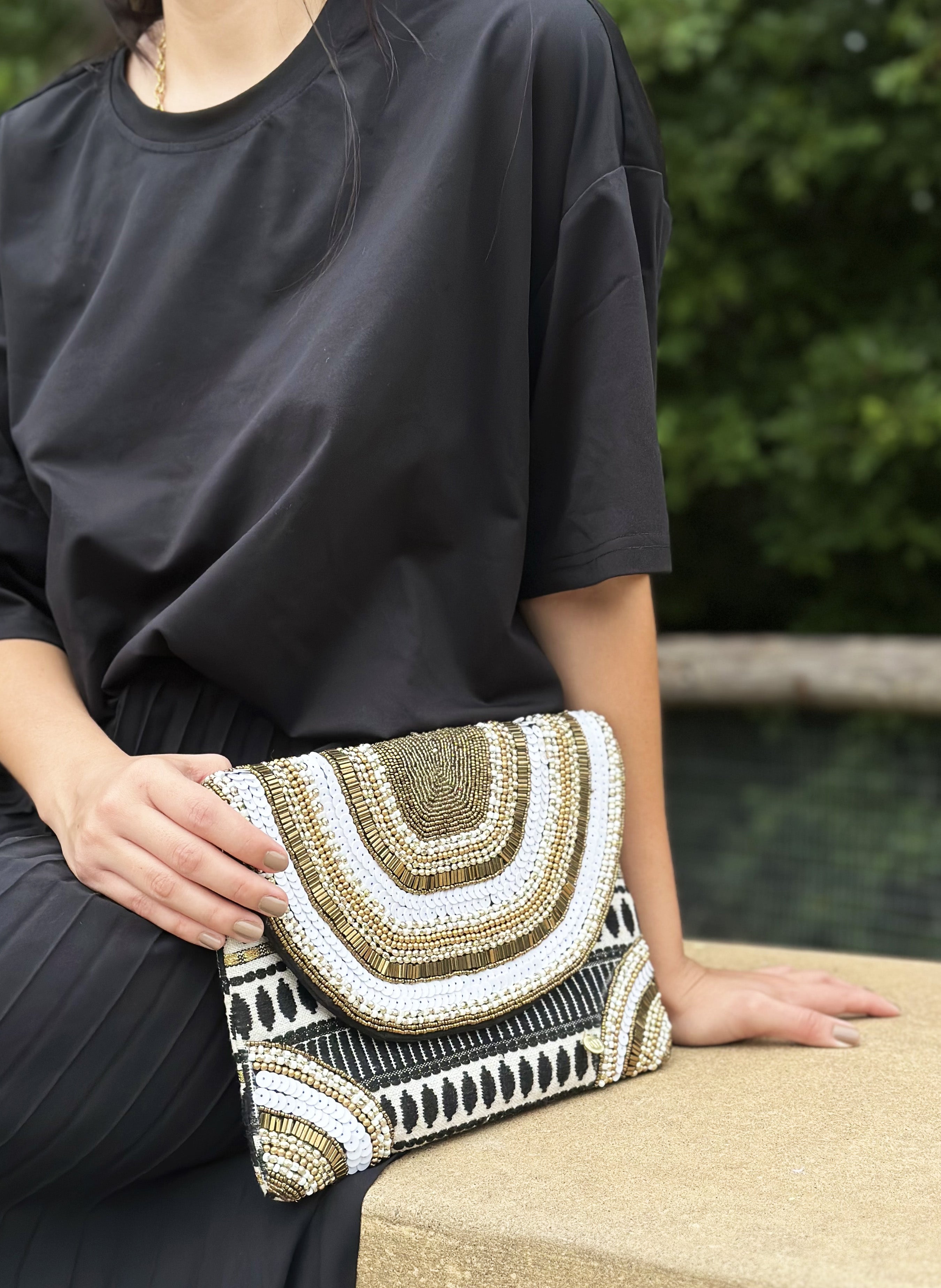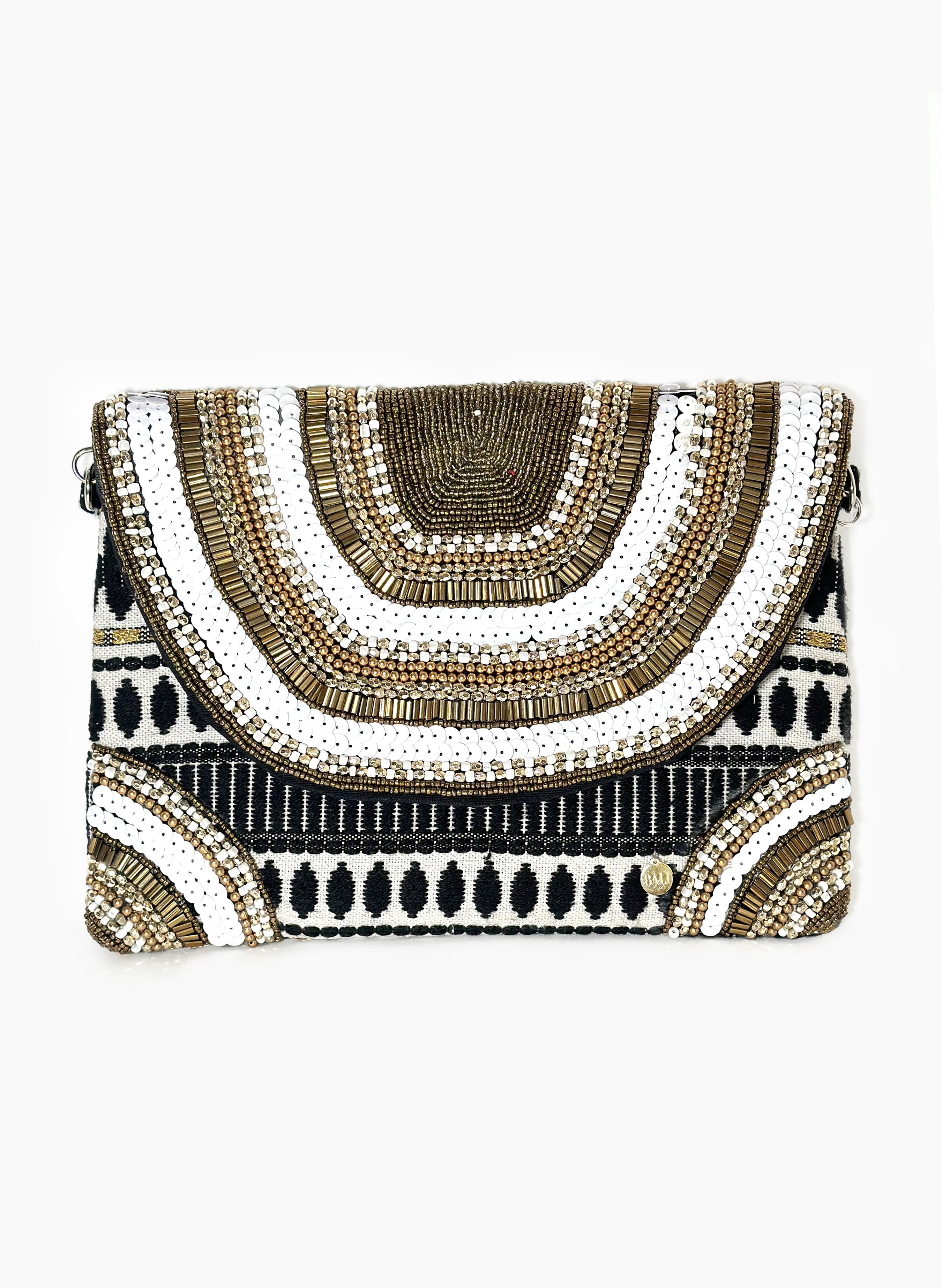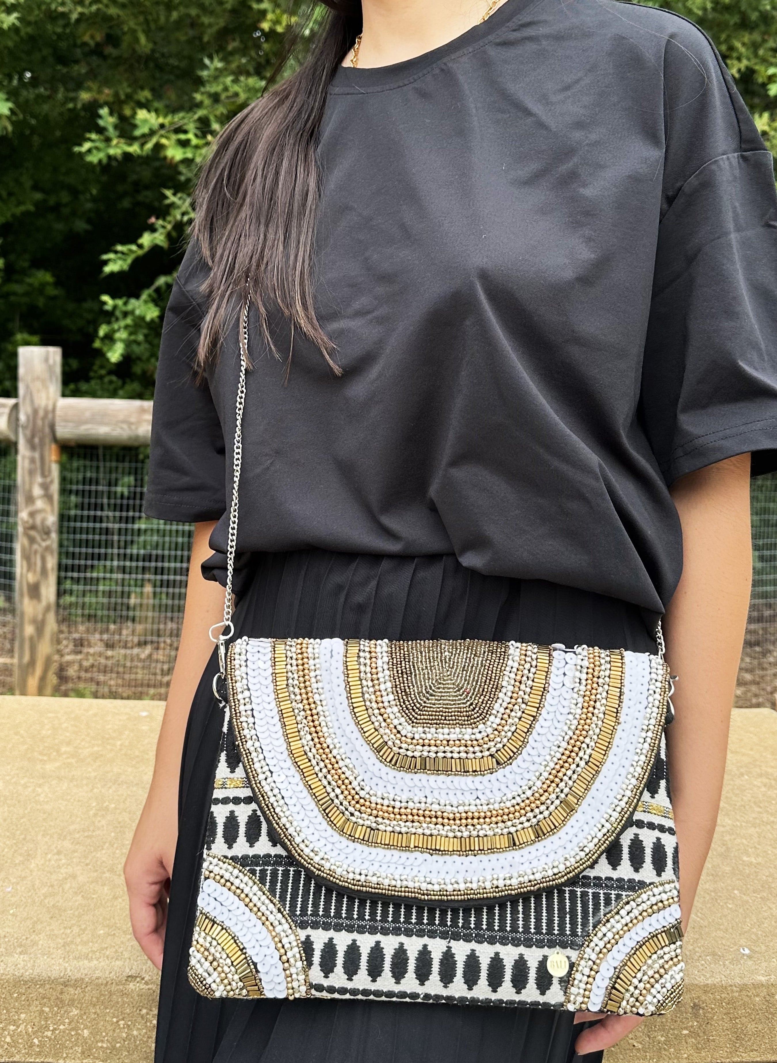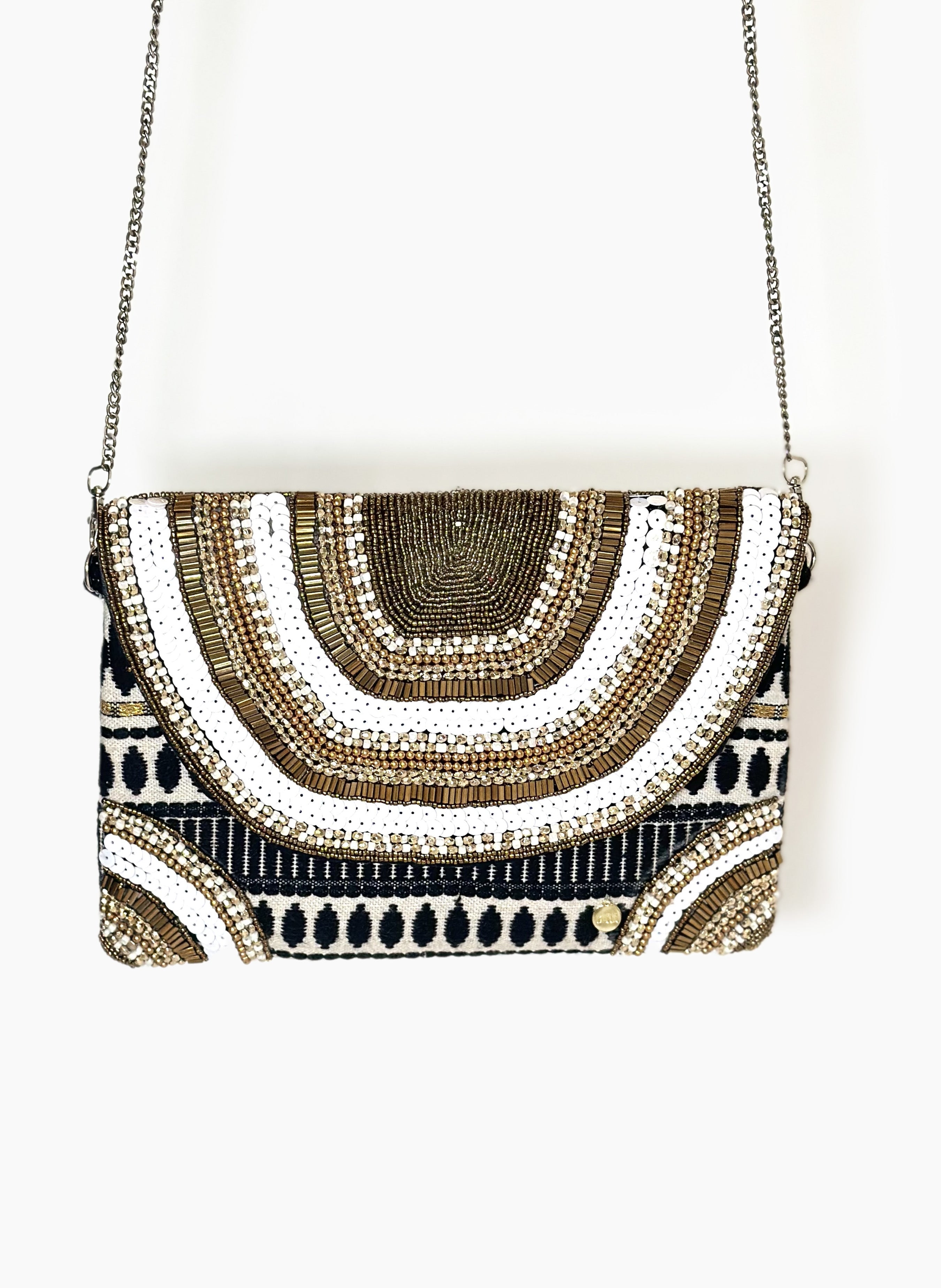 Bolso bordado a mano, con pedrería y mostacilla. Cadena metálica (39.37 pulgadas)