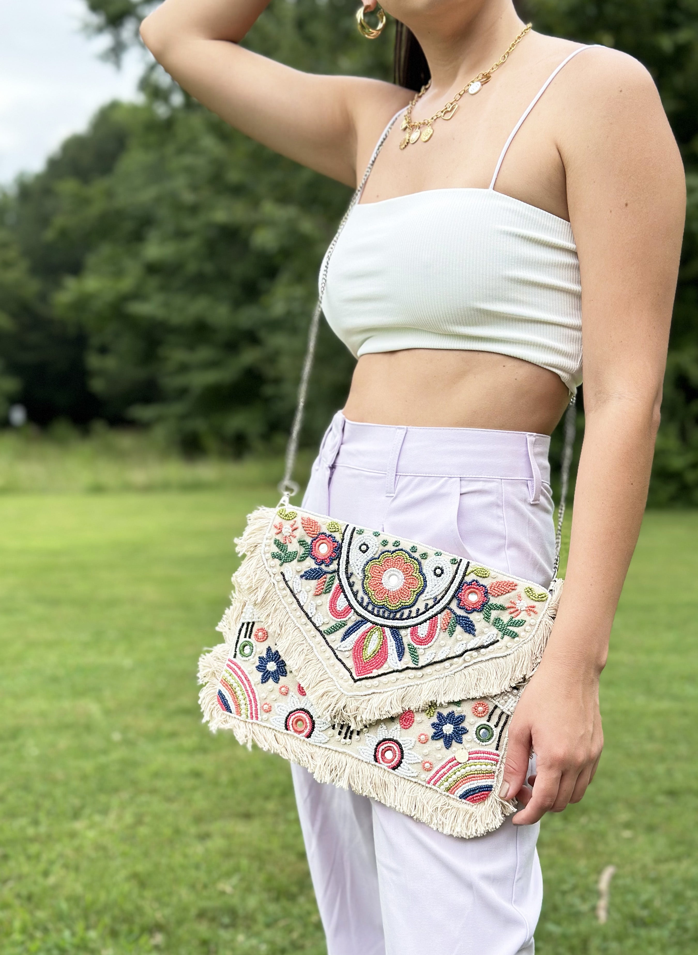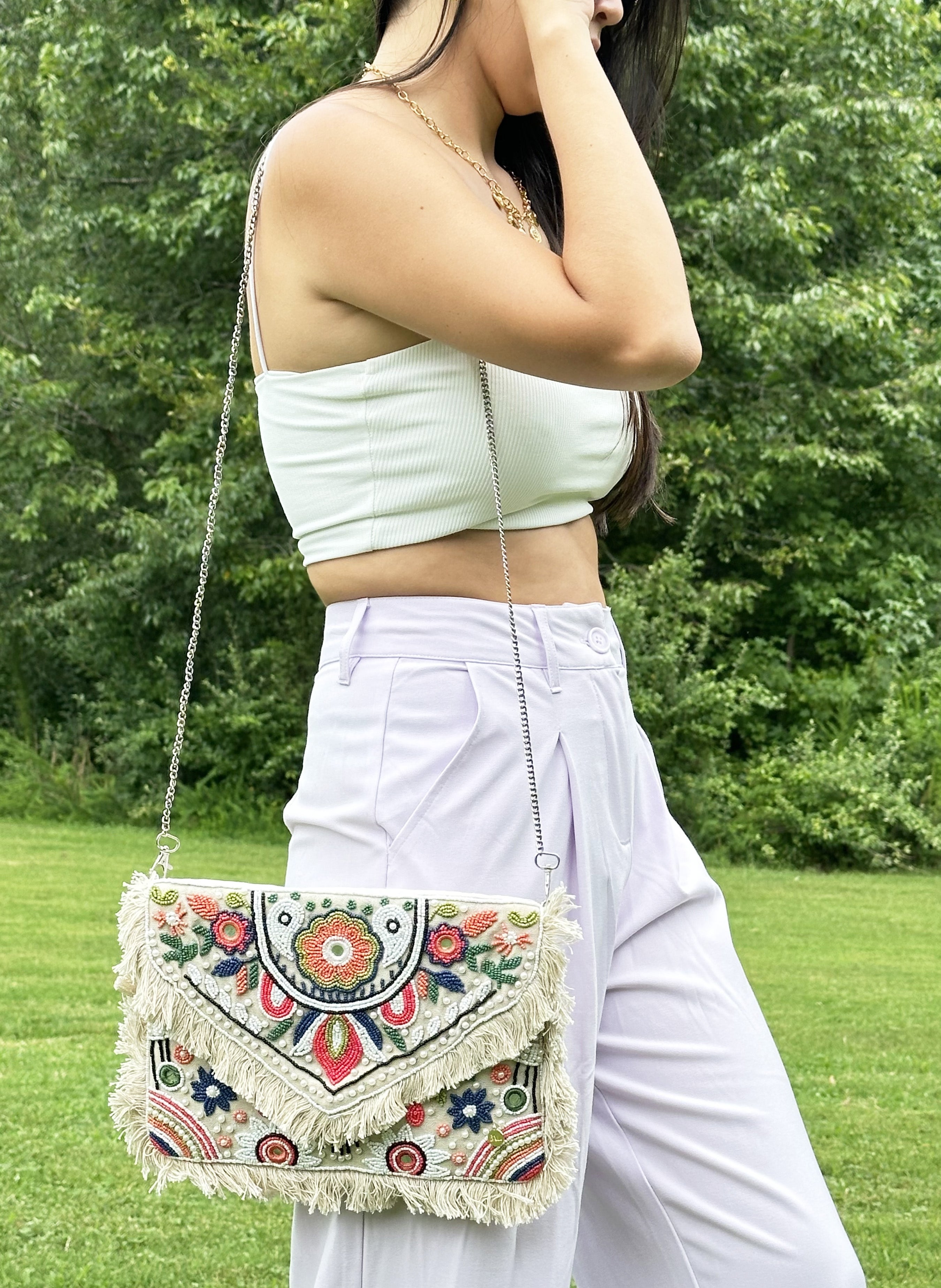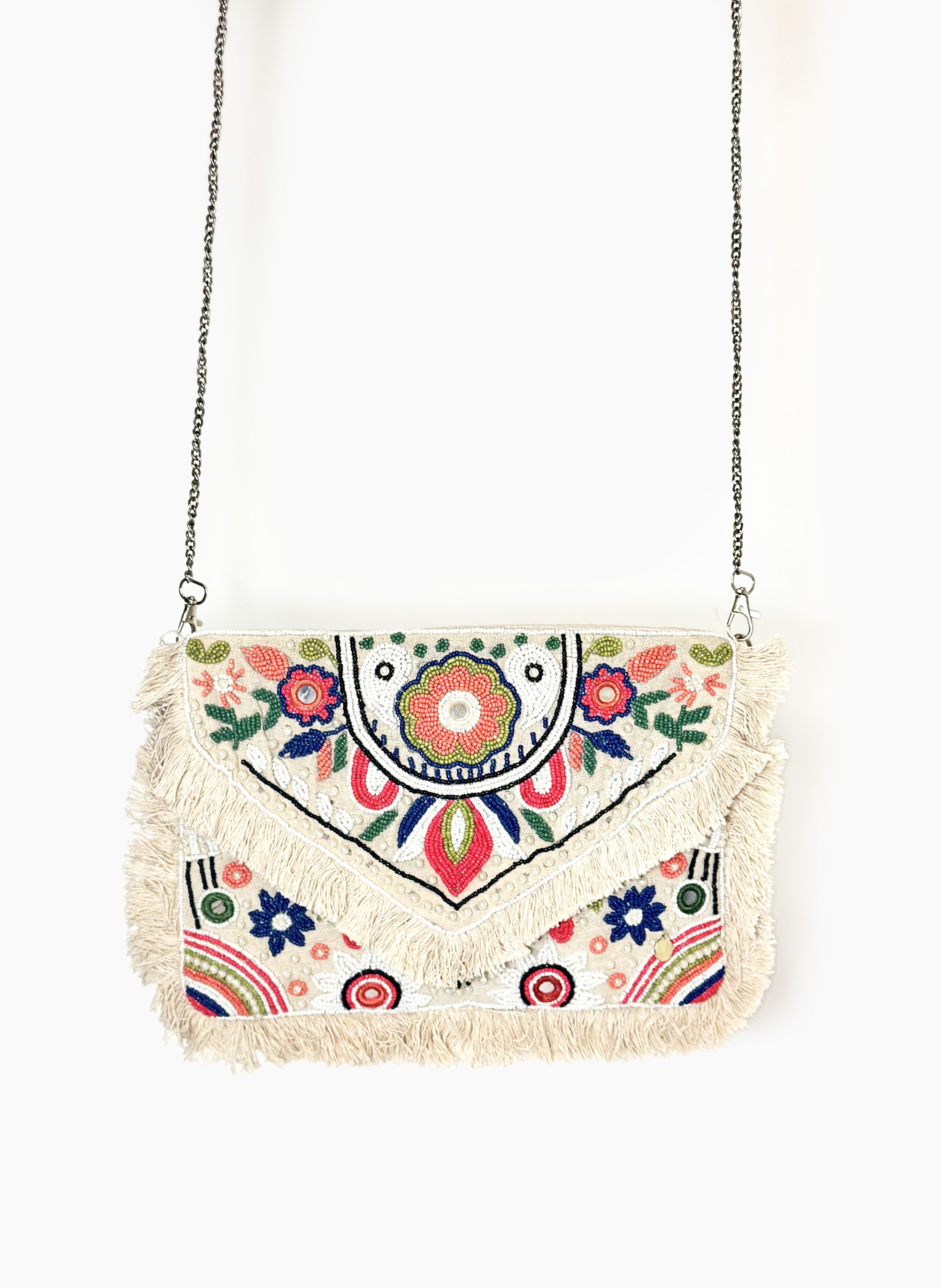 Bolso bordado a mano, con pedrería y mostacilla. Cadena metálica (39.37 pulgadas)