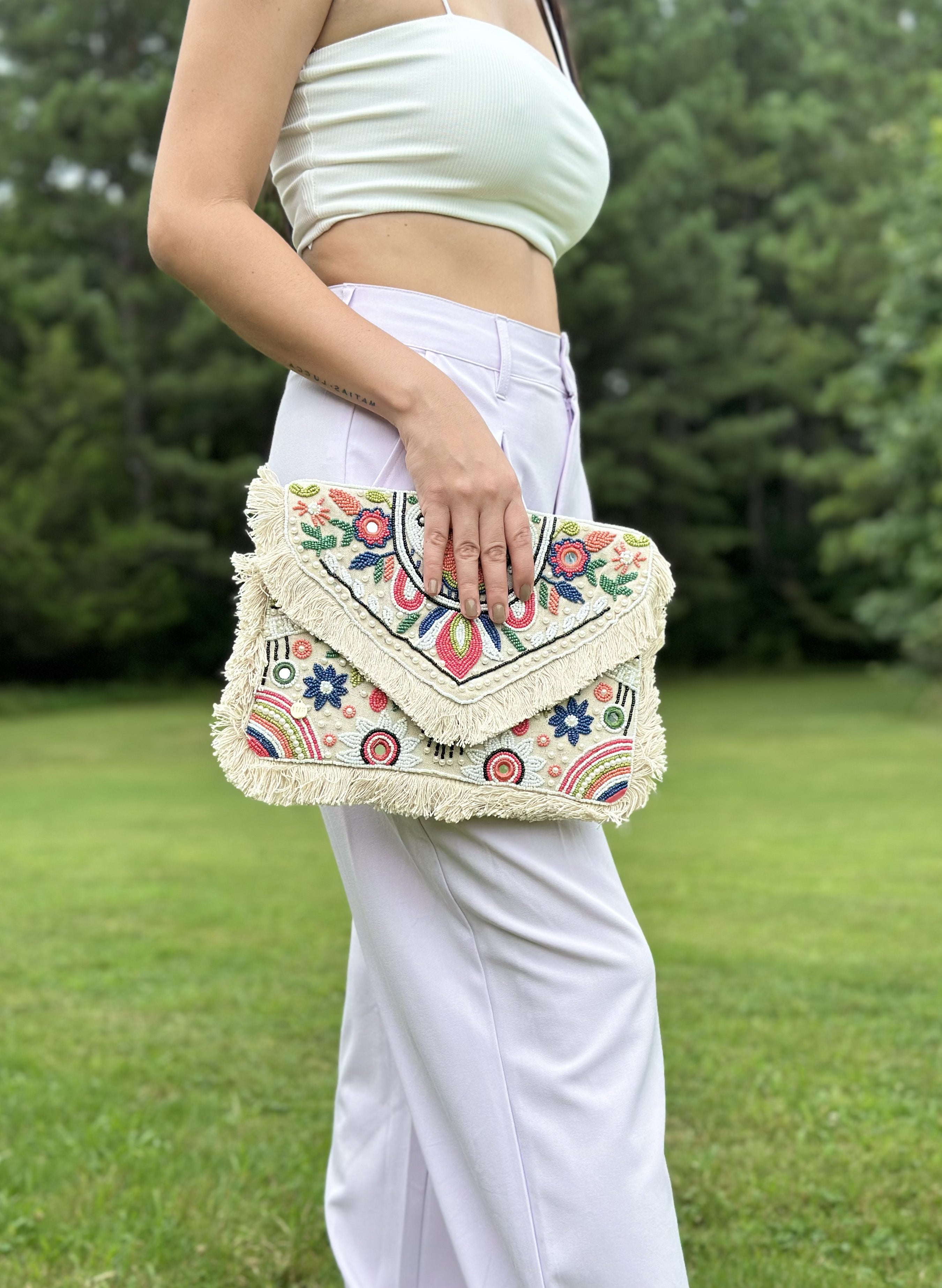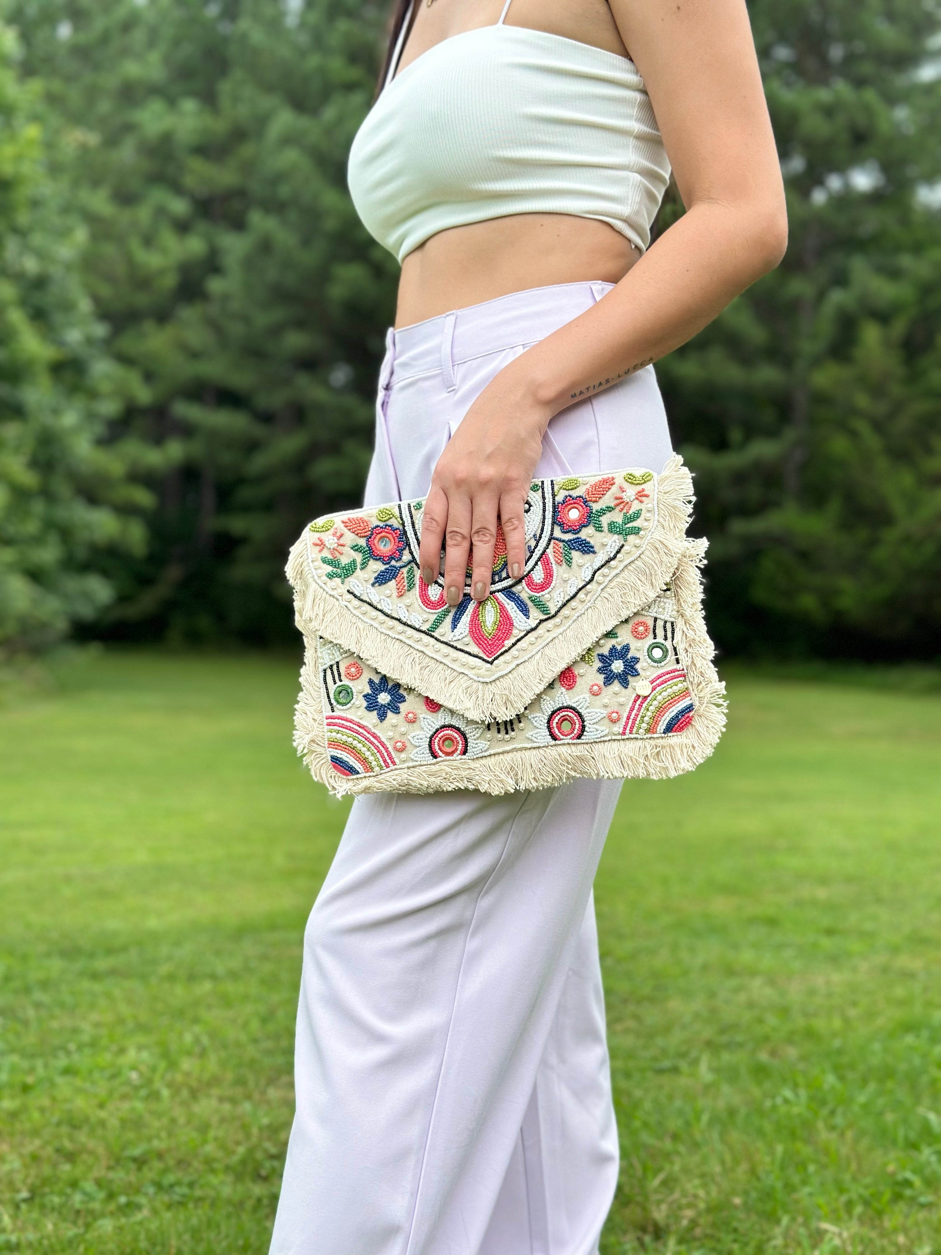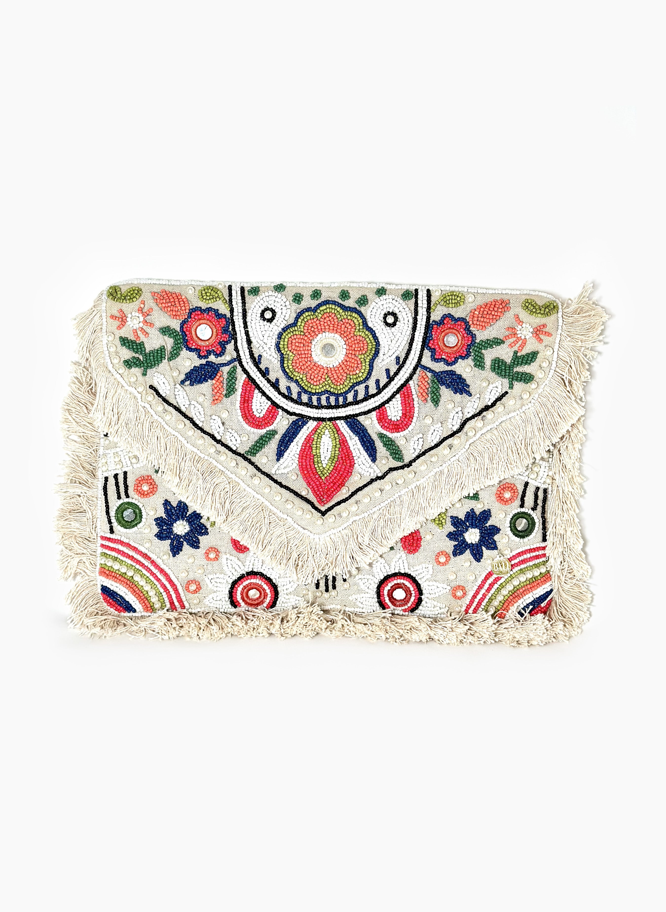 Bolso bordado a mano, con pedrería y mostacilla. Cadena metálica (39.37 pulgadas)