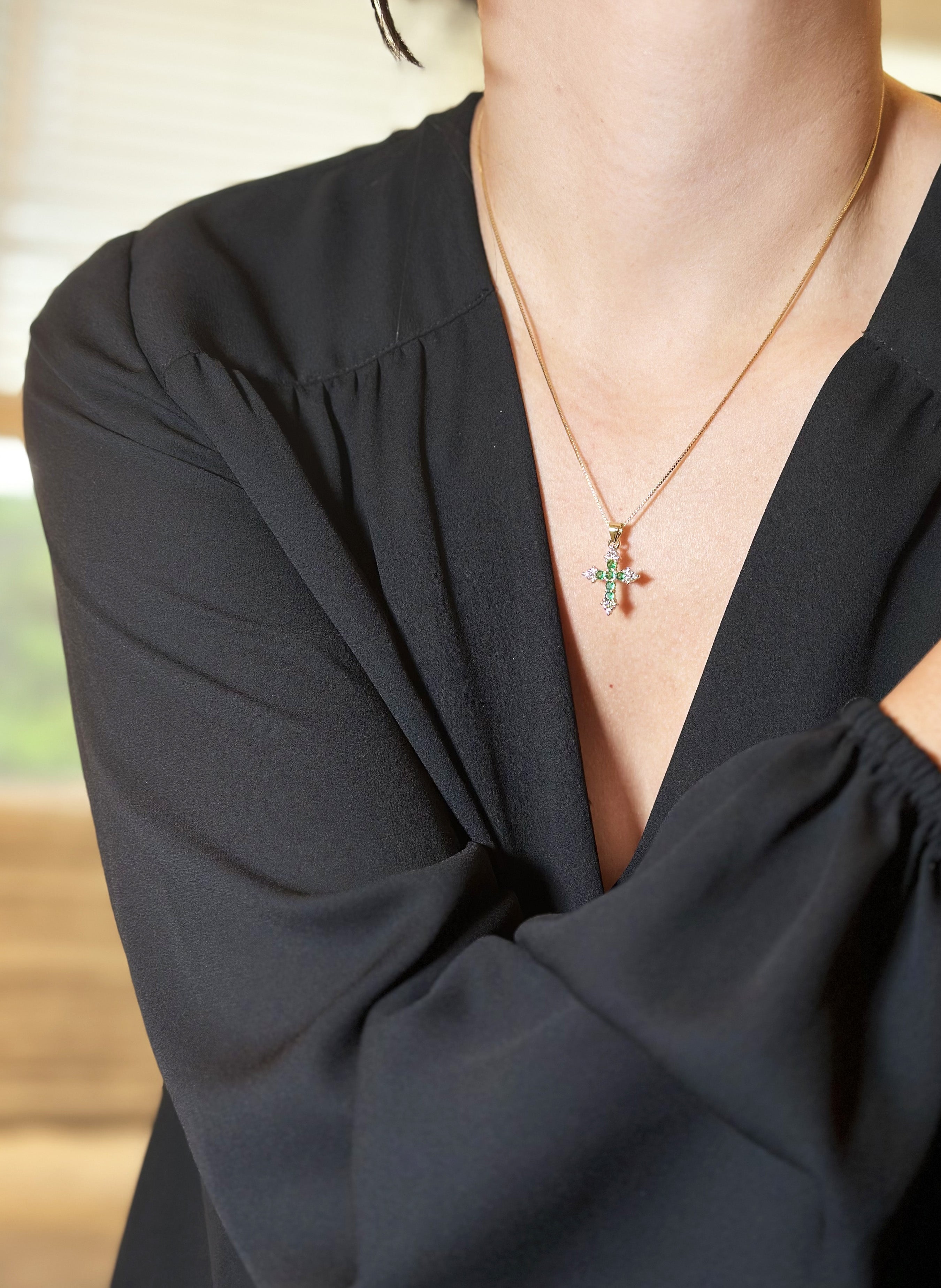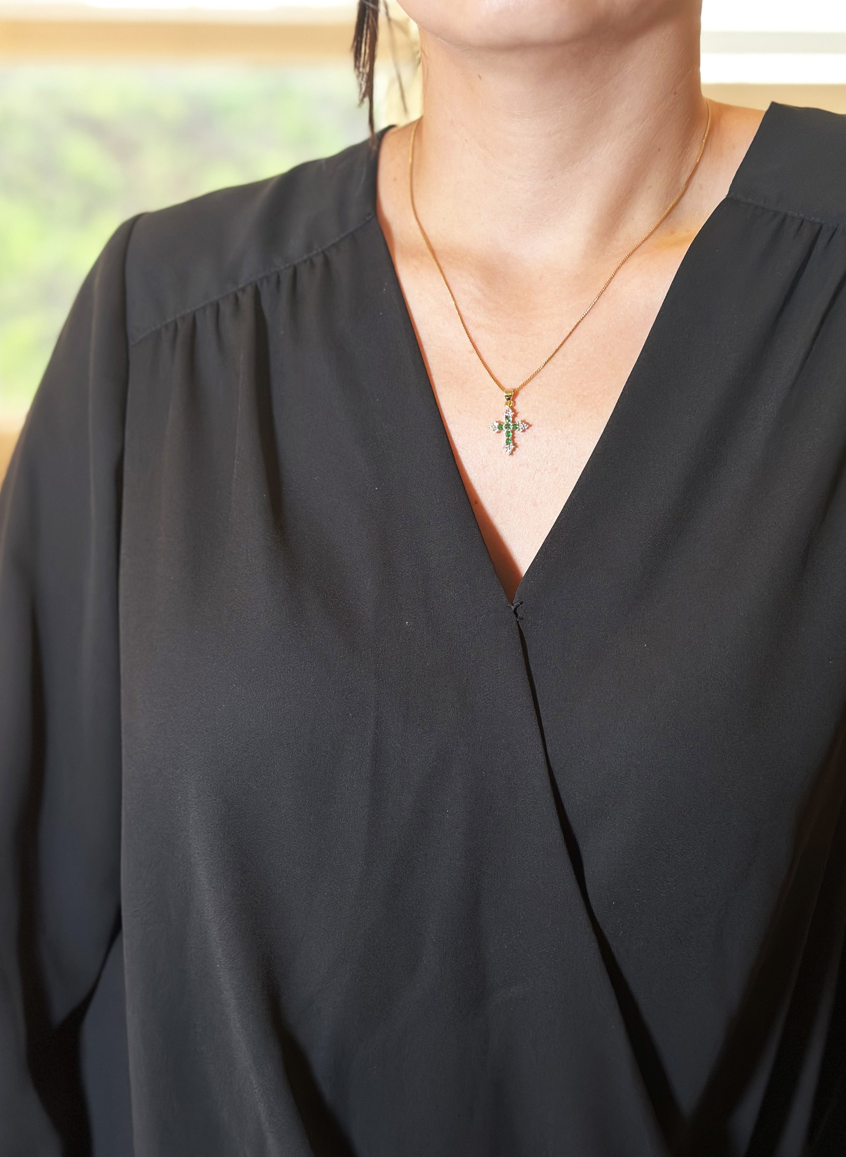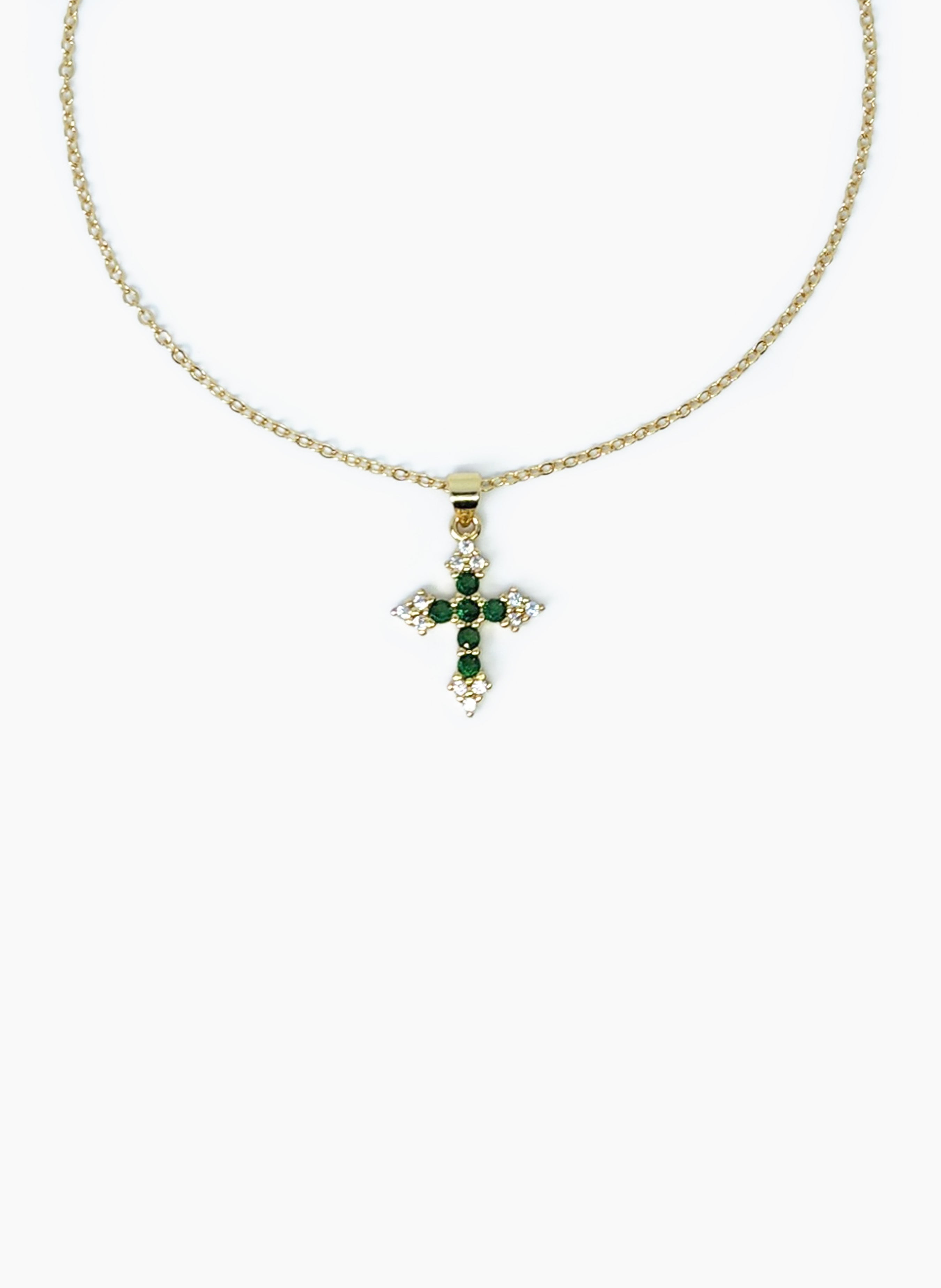 Cadena elaborada en acero rodinado con baño en oro de 24 k, y zircones brillantes en colores verde y transparente.