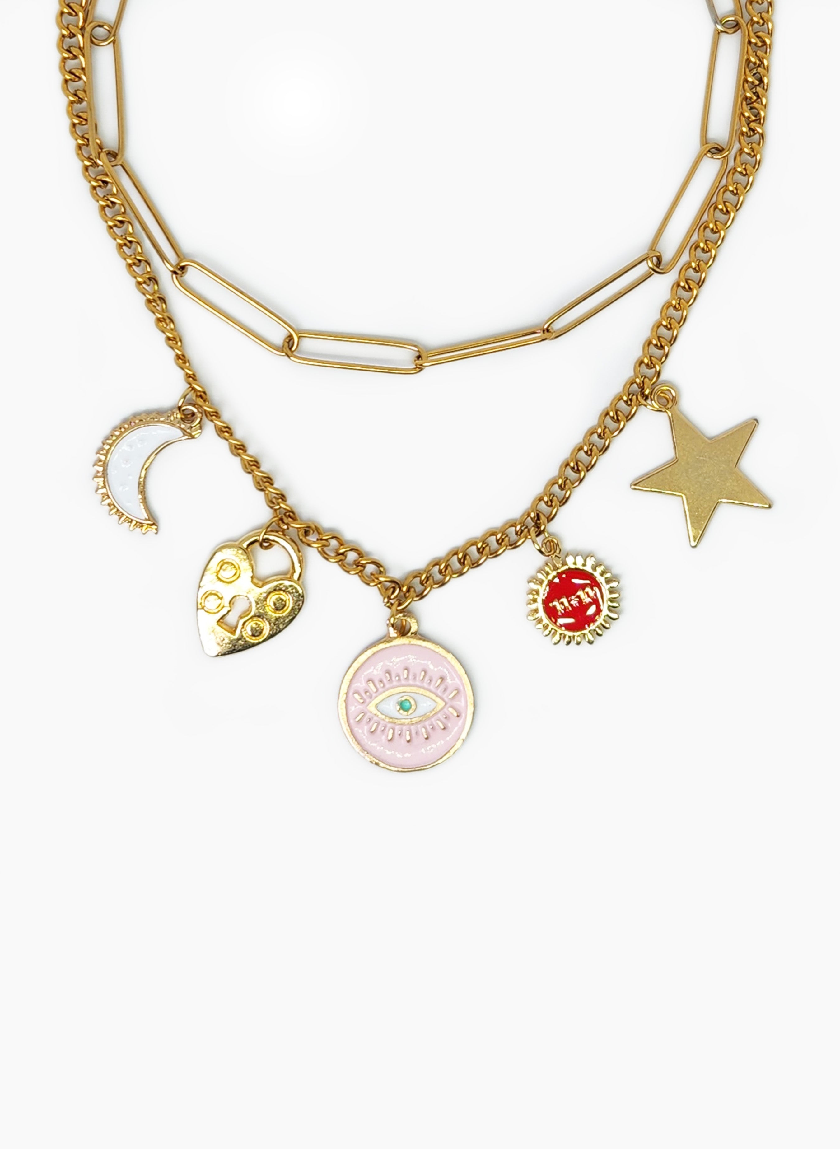 Cadena doble en acero con multi dijes en zamak con baño en oro de 24k.
