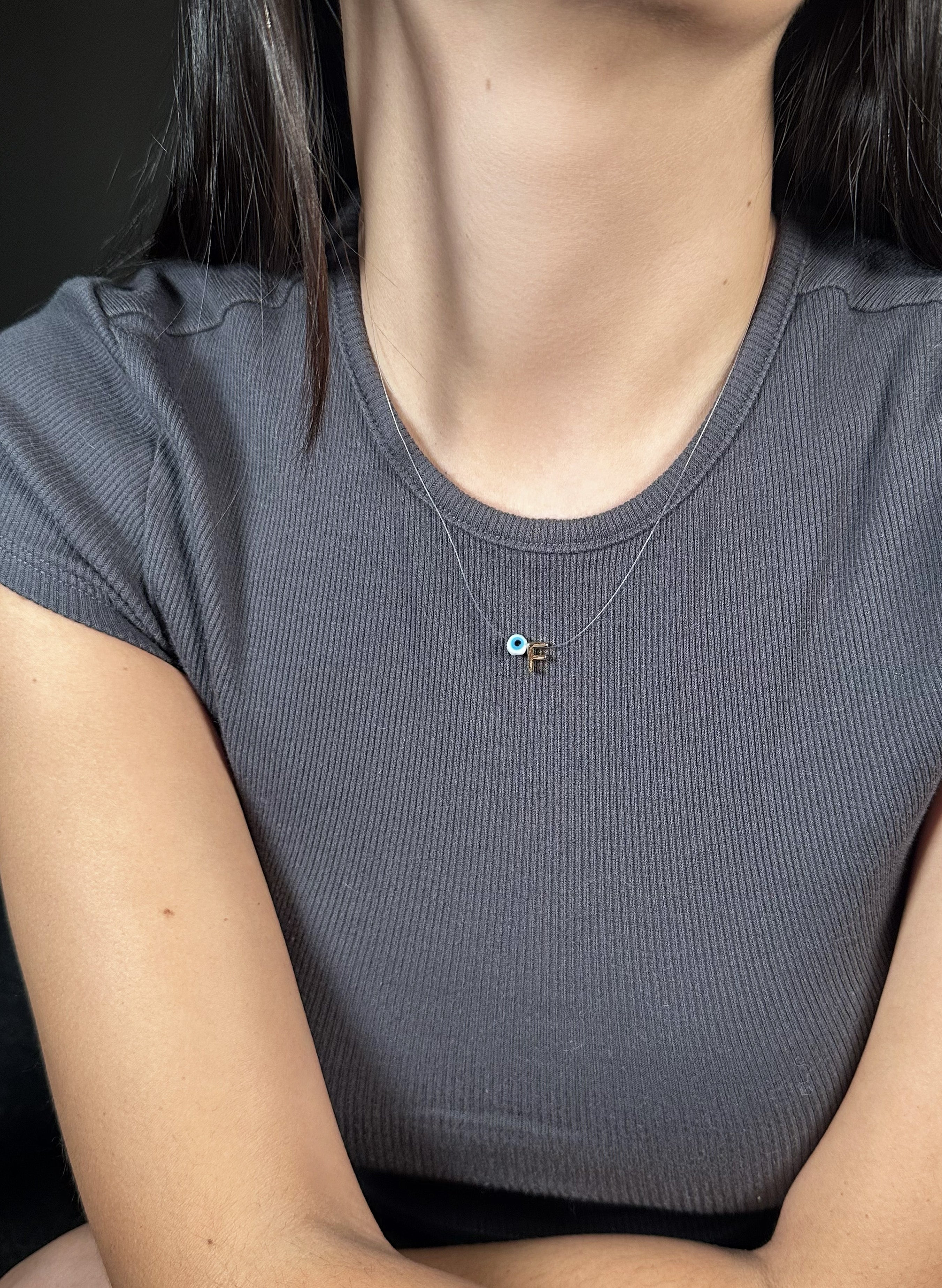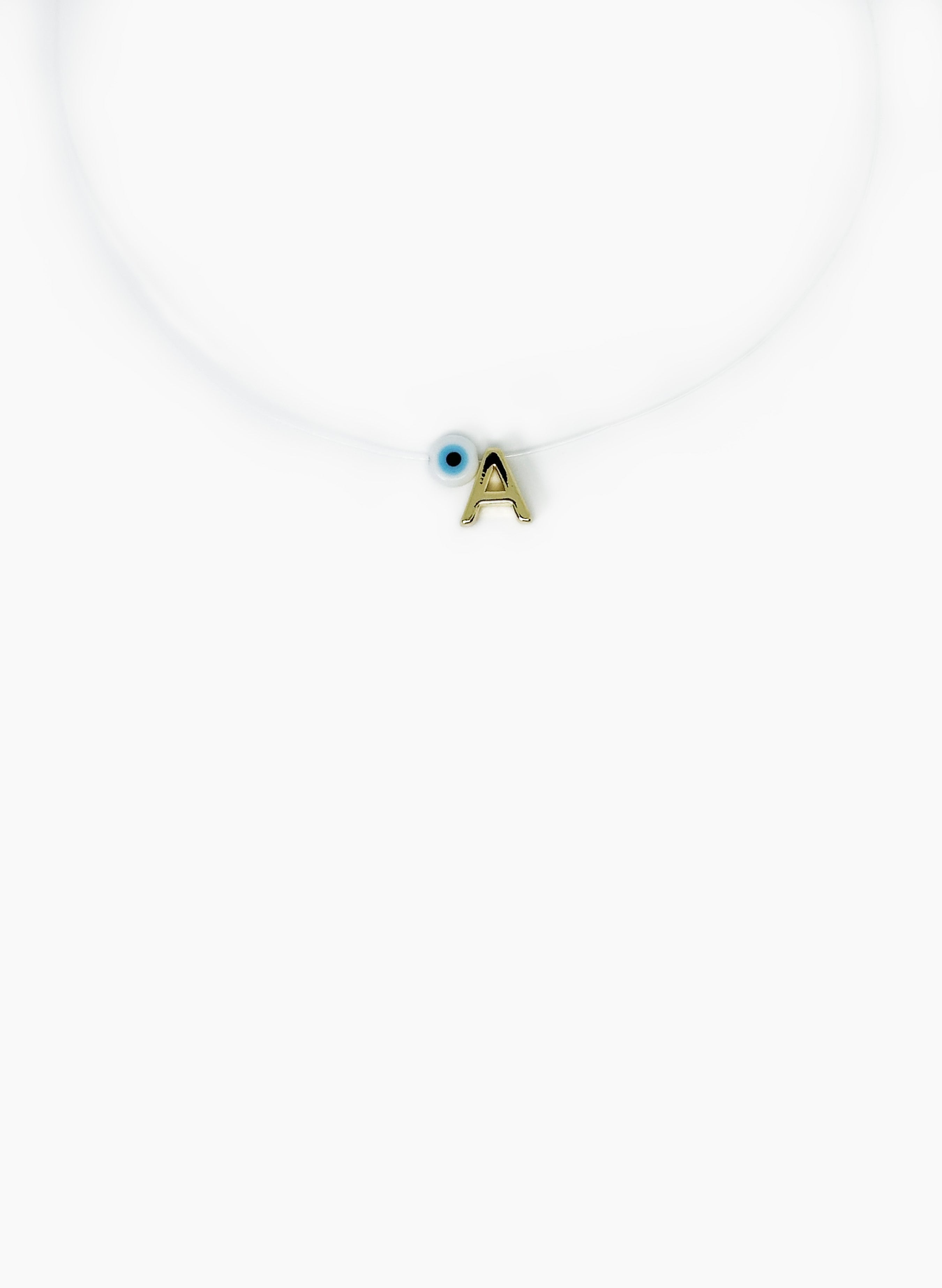 Collar personalizado, hecho en nylon invisible con letra en oro gold filled con baño en oro de 24k y ojo en acrílico.