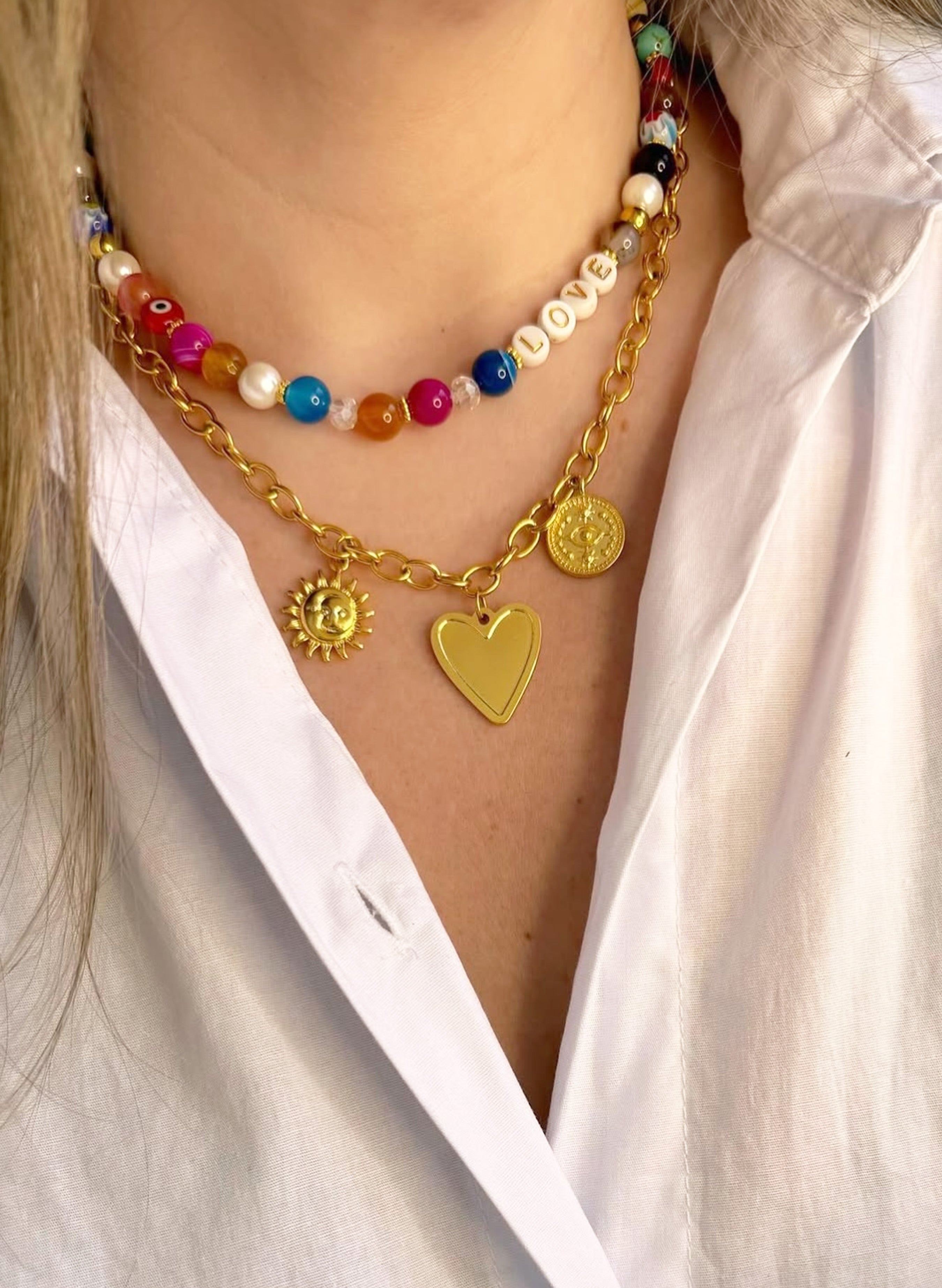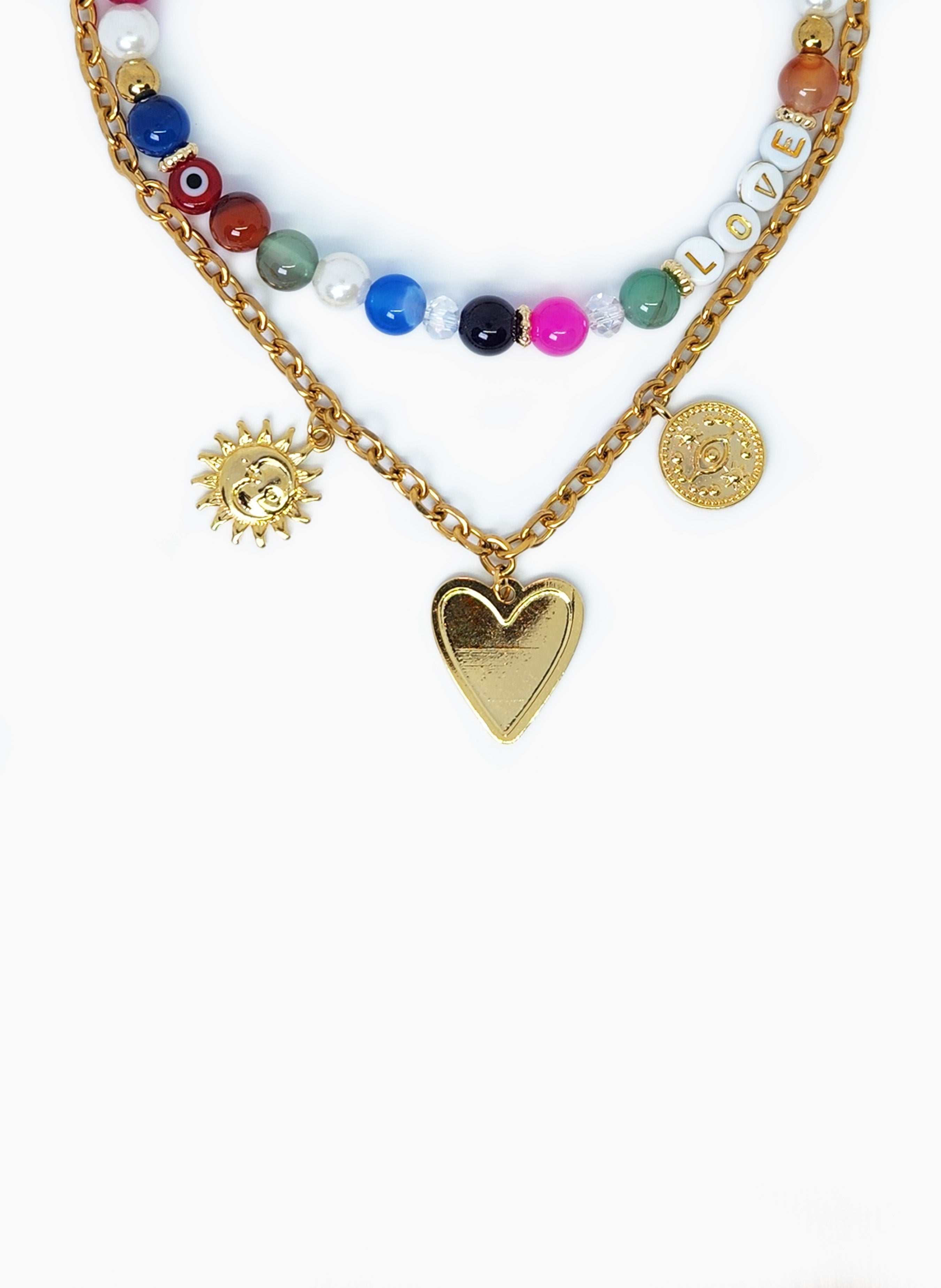 Collar doble hecho a mano con un mix de piedras entre ellas piedras naturales, perlas, ojos acrÍlicos, y cristales. Cadena y dijes con baño en oro de 24k.