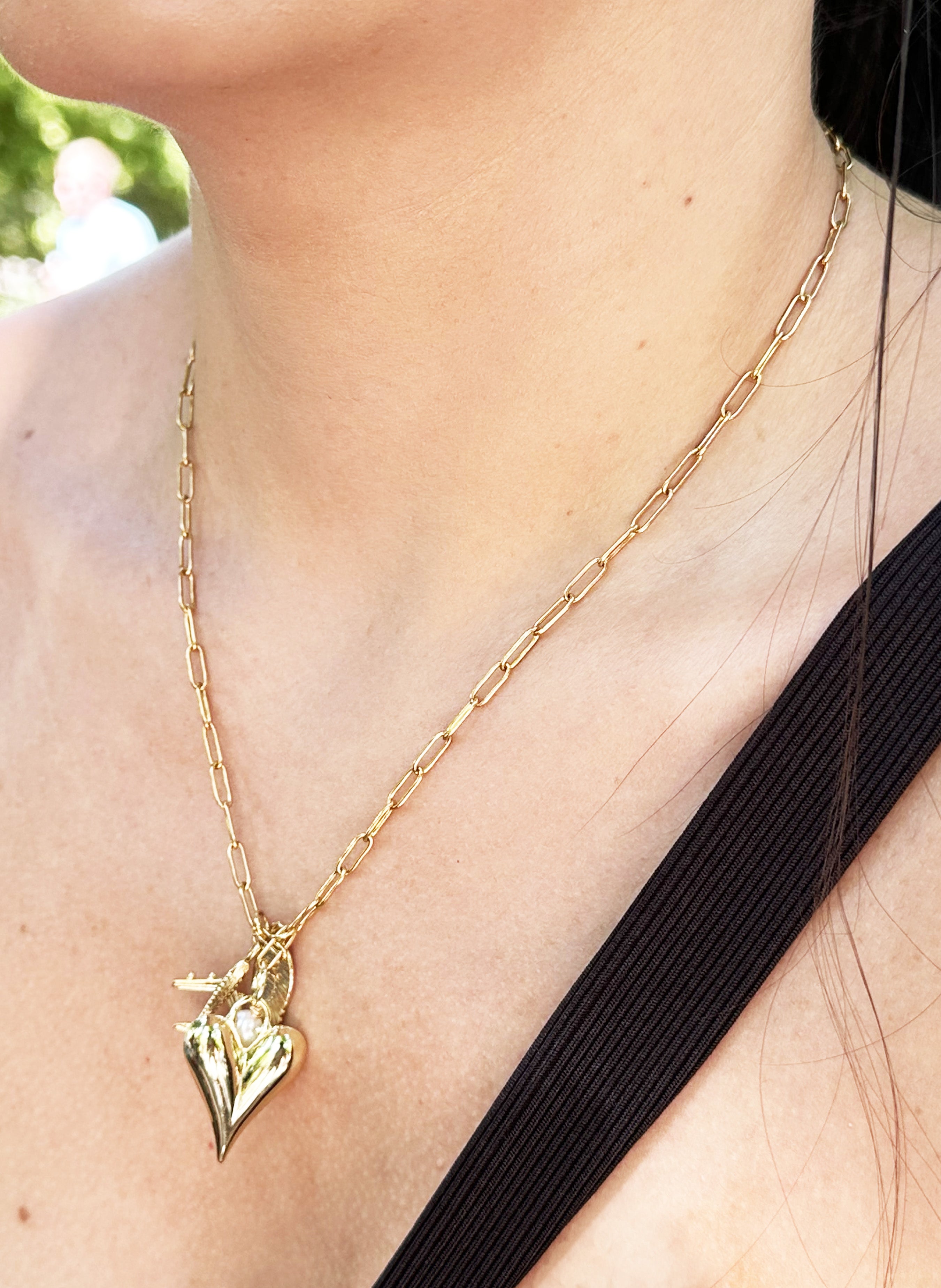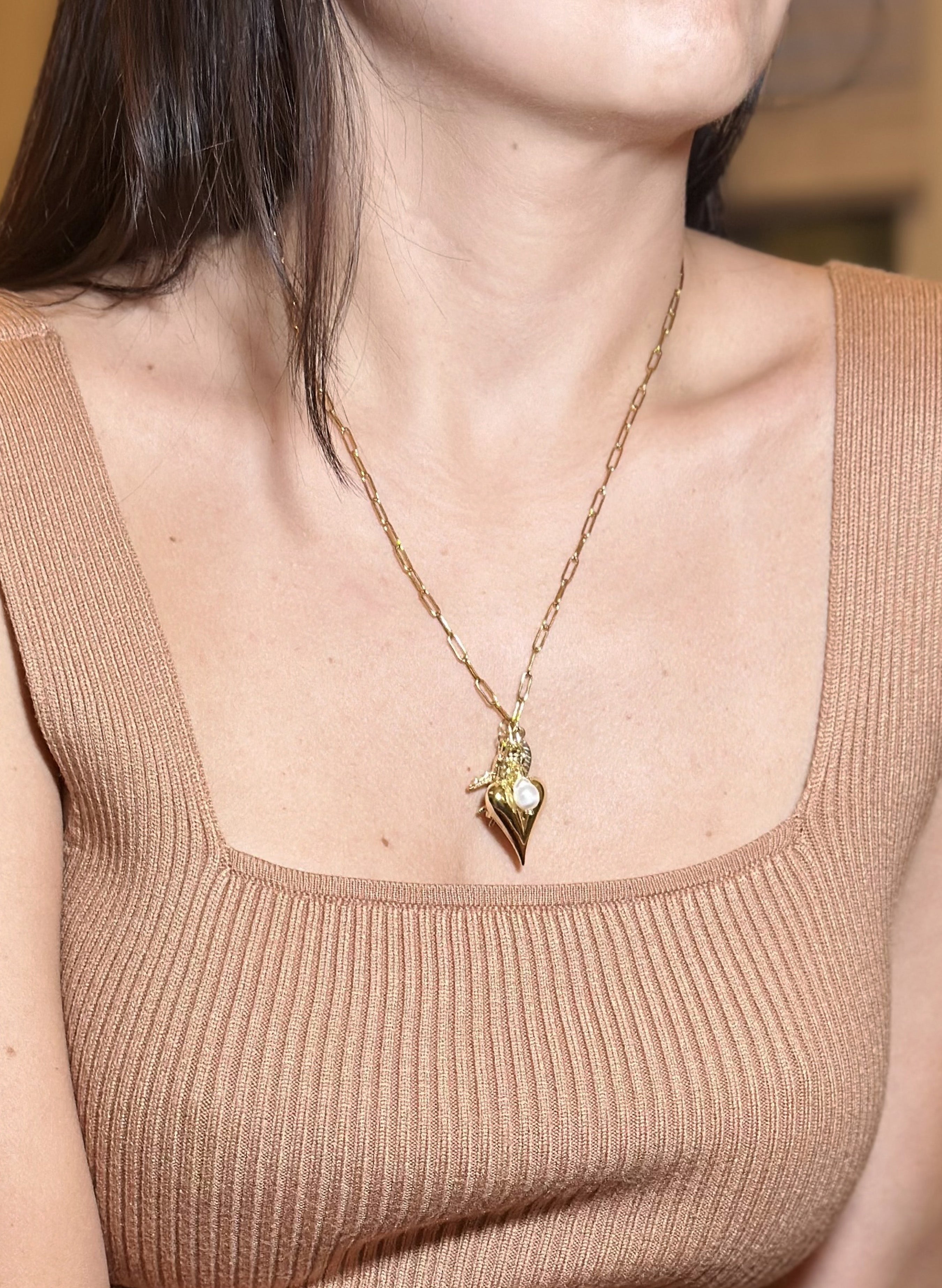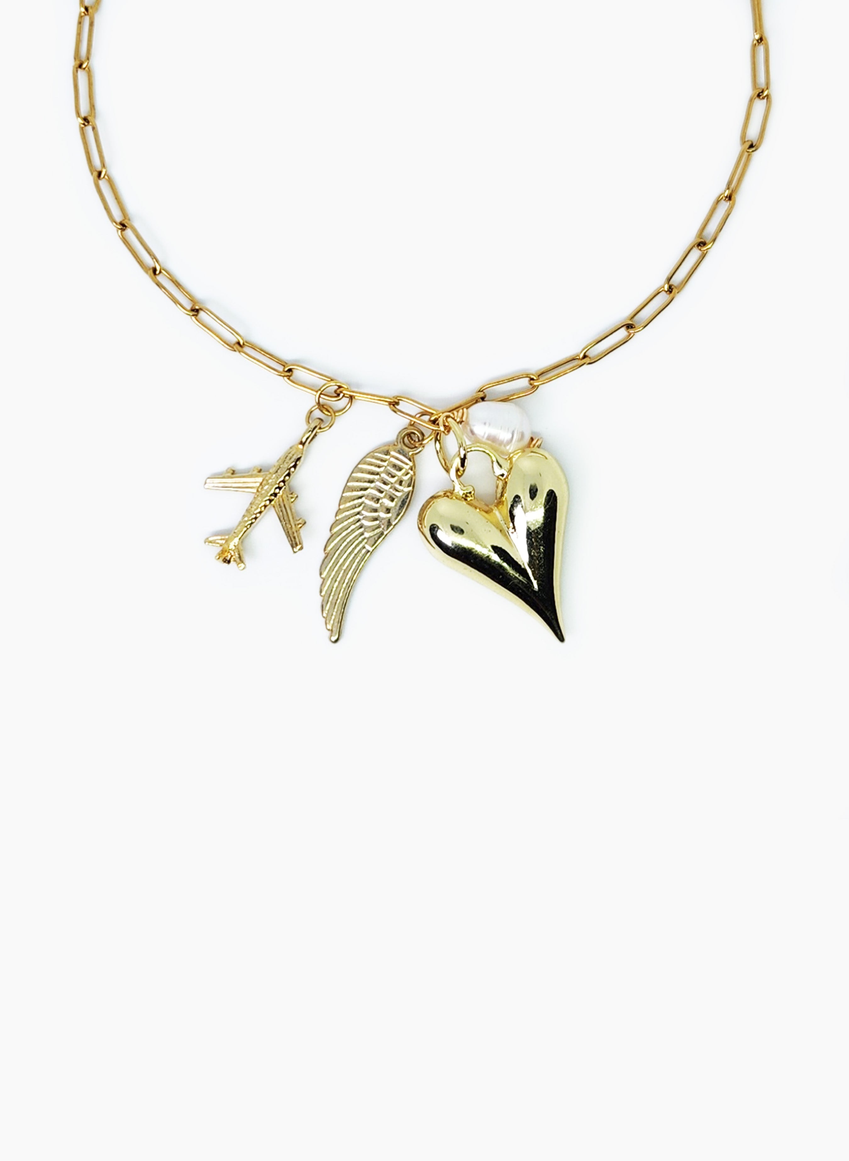 Cadena elaborada en acero, dijes con baño en oro de 24k, broche en acero.