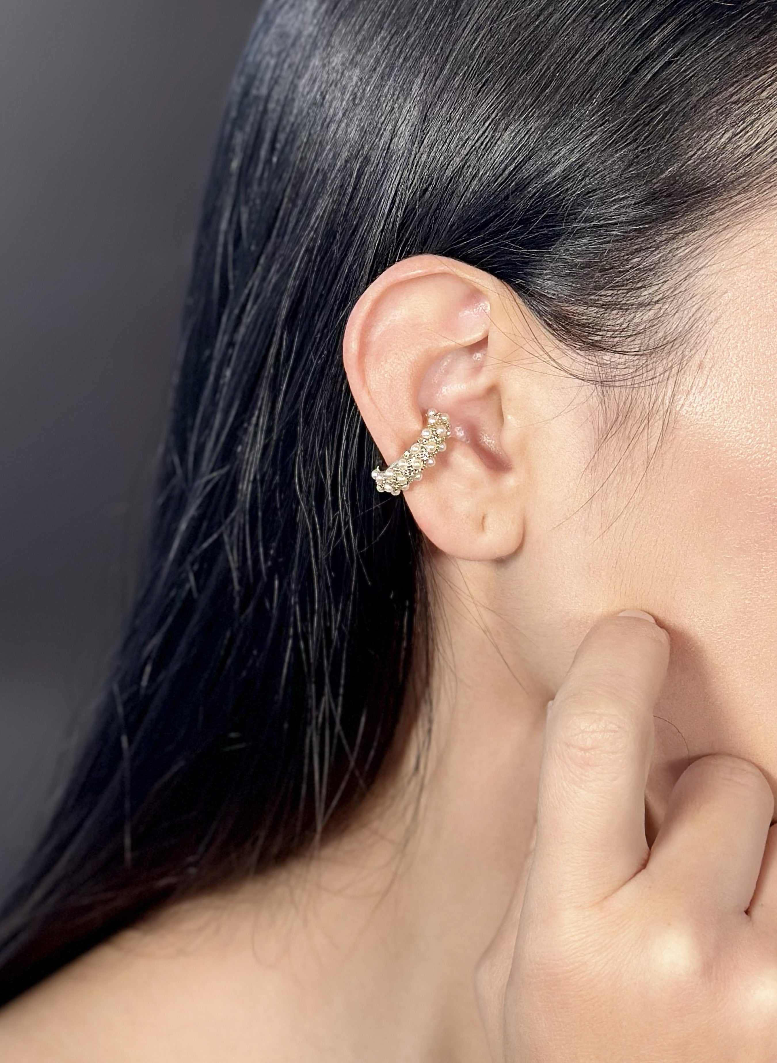 Ear cuff hecho en acero rodinado con baño en oro de 24k y perlas blancas.