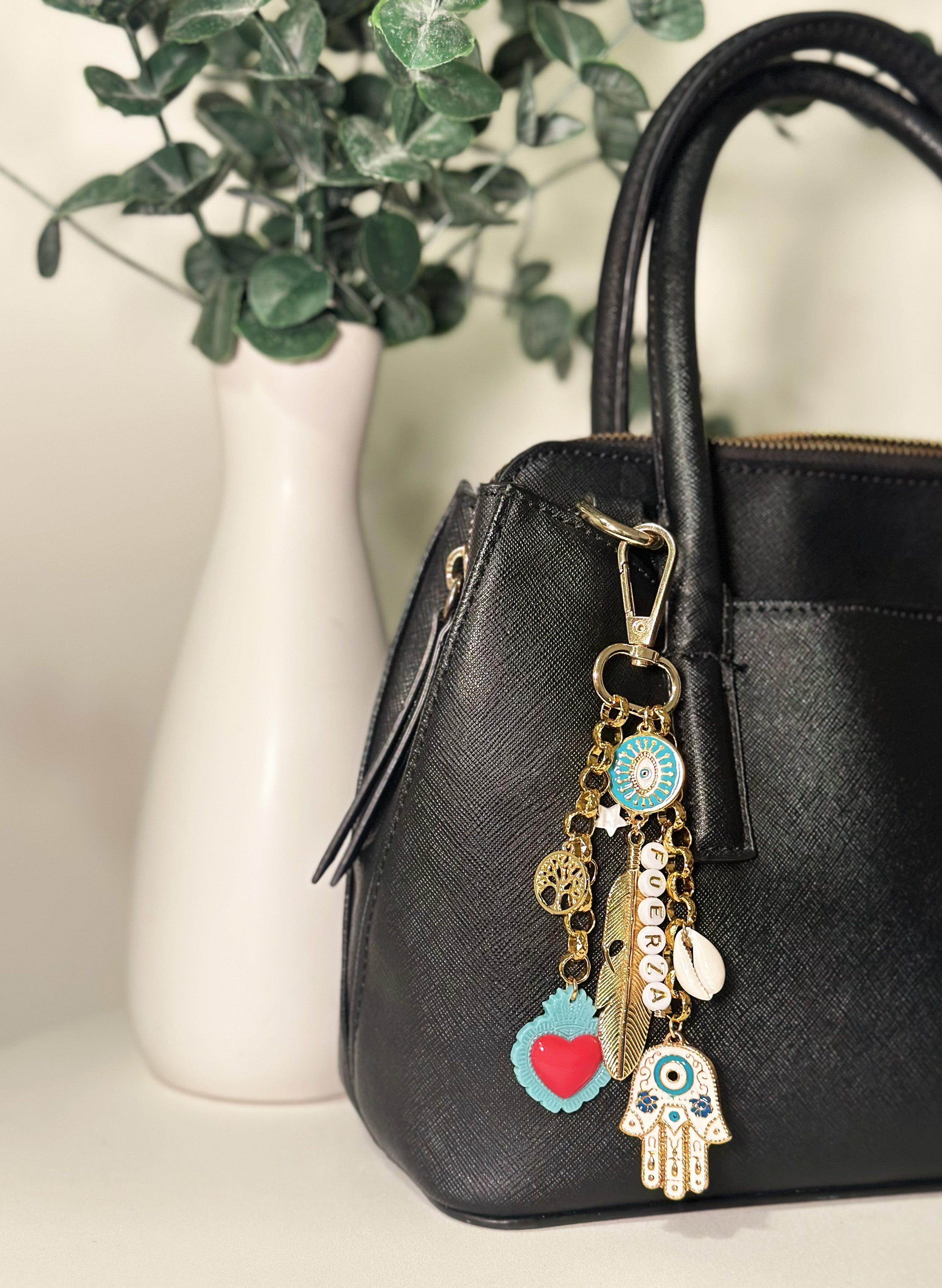 Llaveros elaborados en zamak con baño en oro, cadenas de aluminio. La mano hamsa esta elaborada con herrajes en baño en oro de 24 kilates, el corazón y las letras hechas en acrílico.
