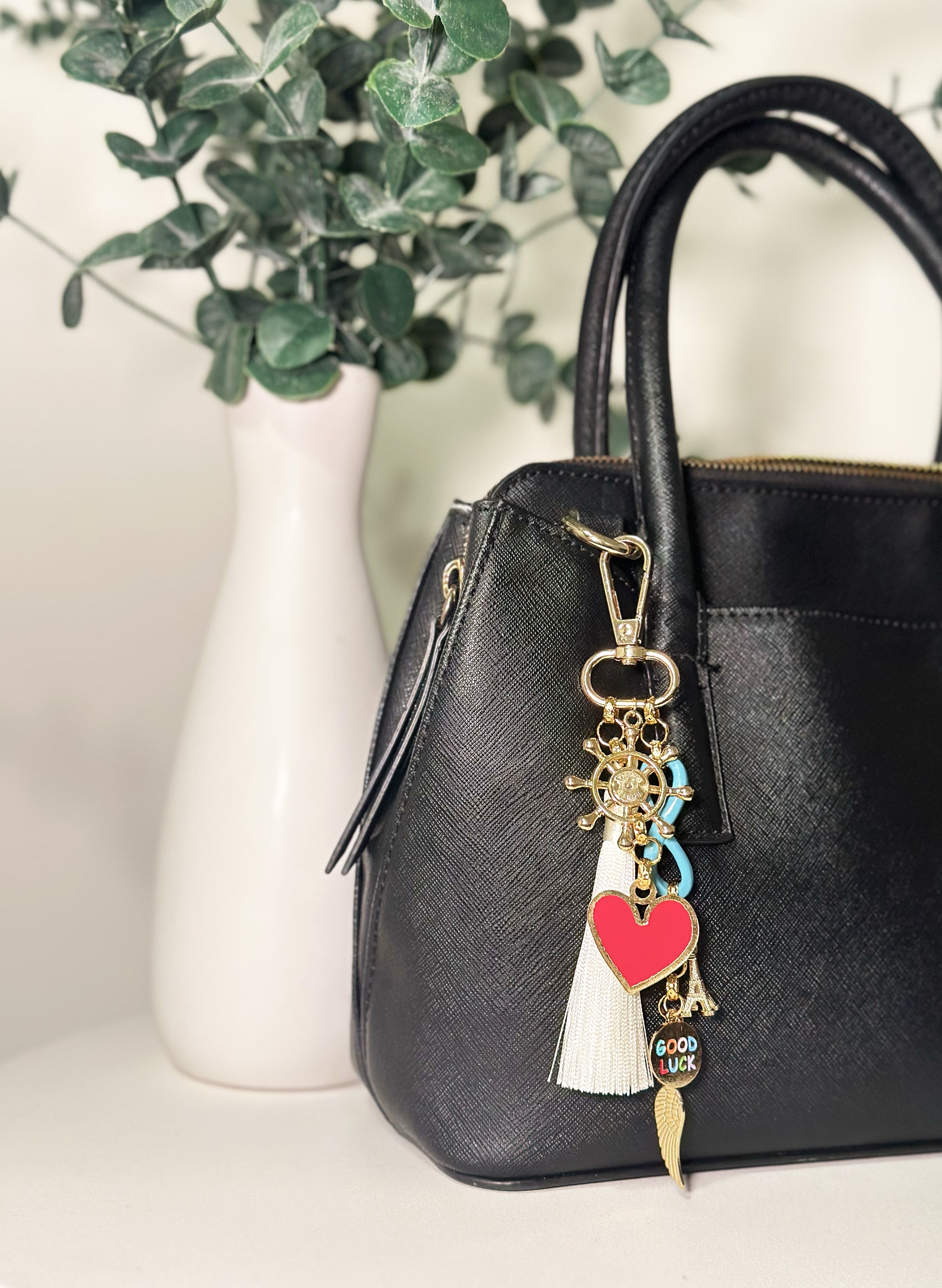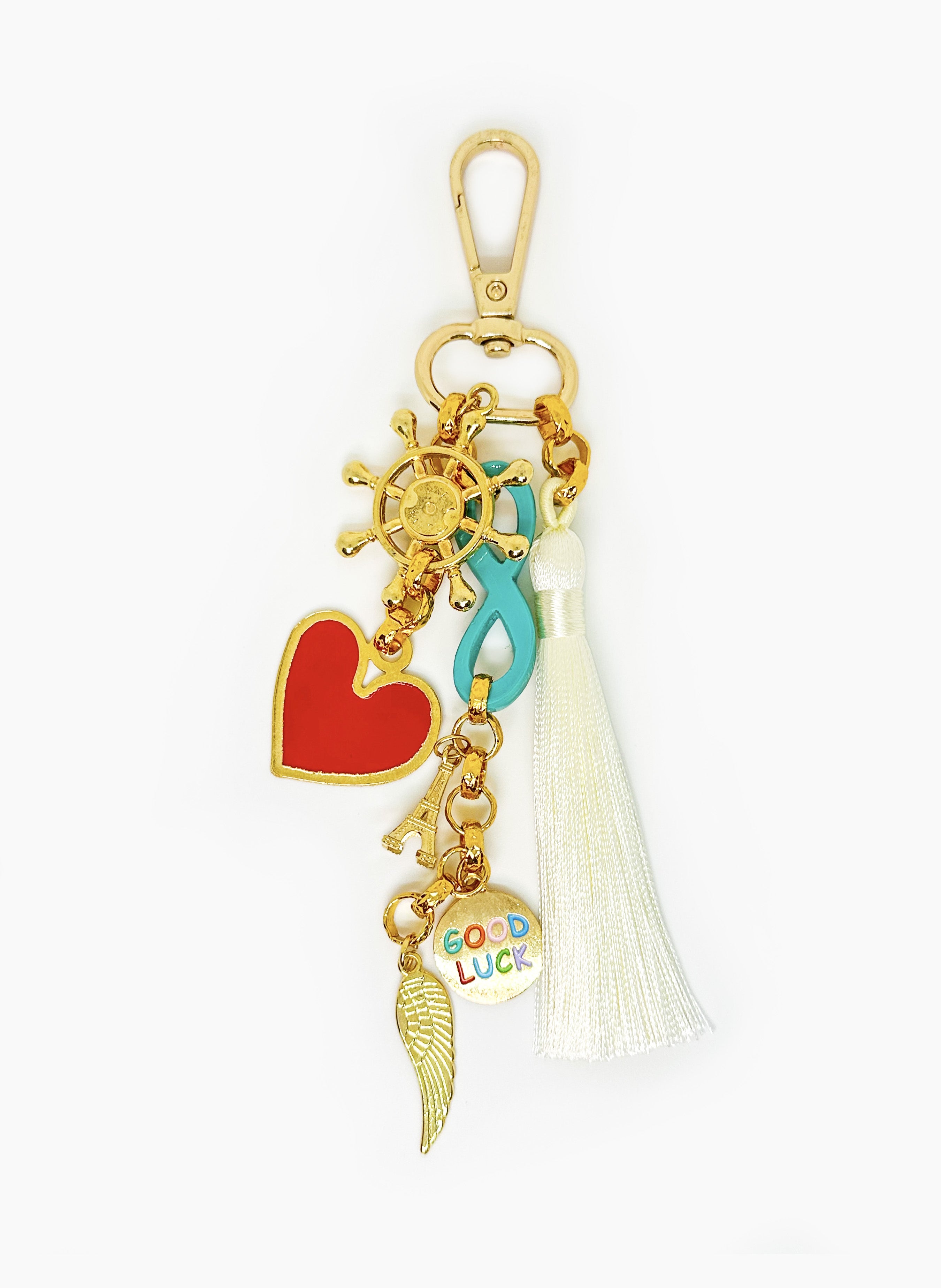 Llaveros elaborados en zamak con baño en oro, cadenas de aluminio. El corazón y las letras están hechas en acrílico.