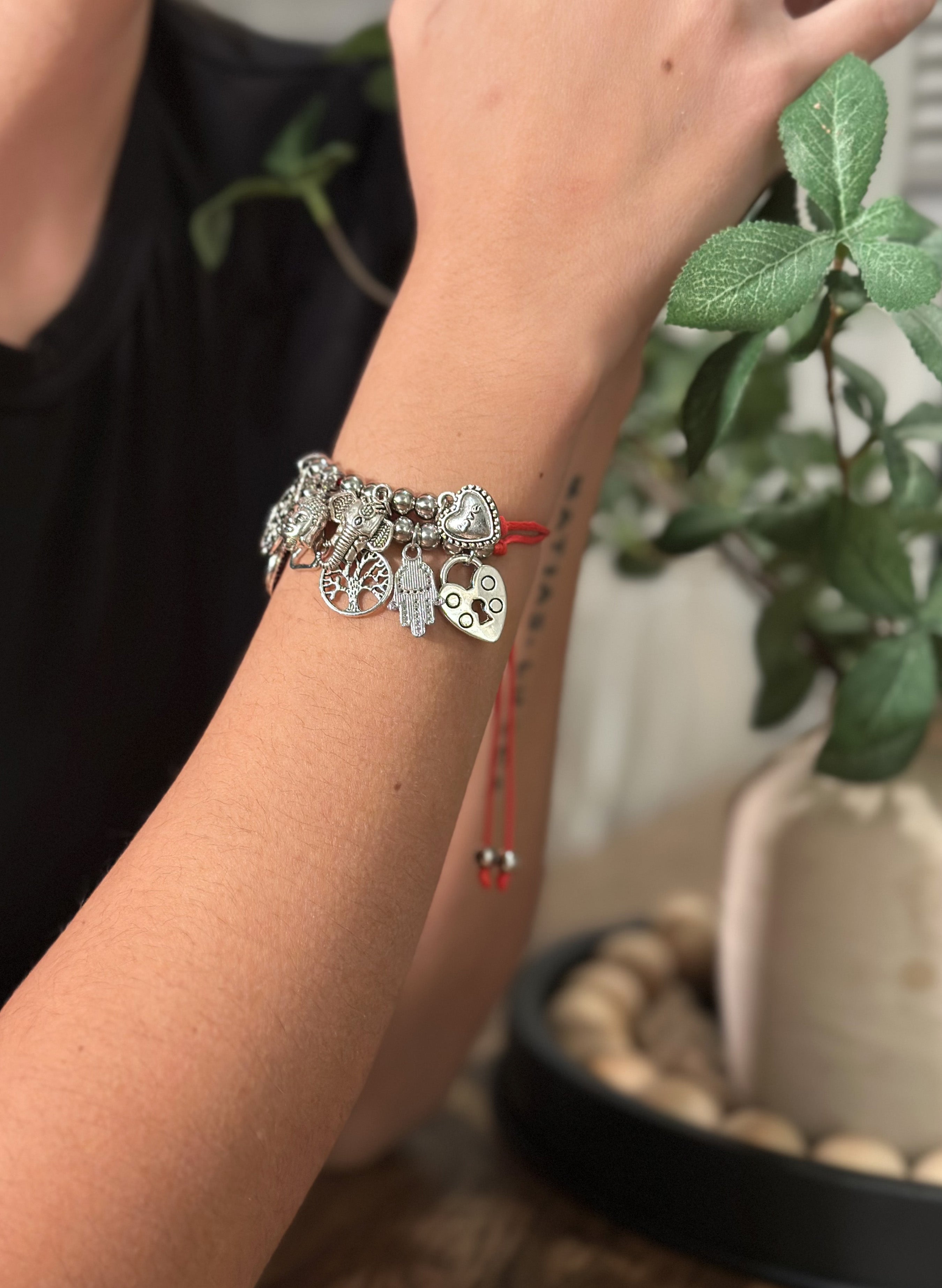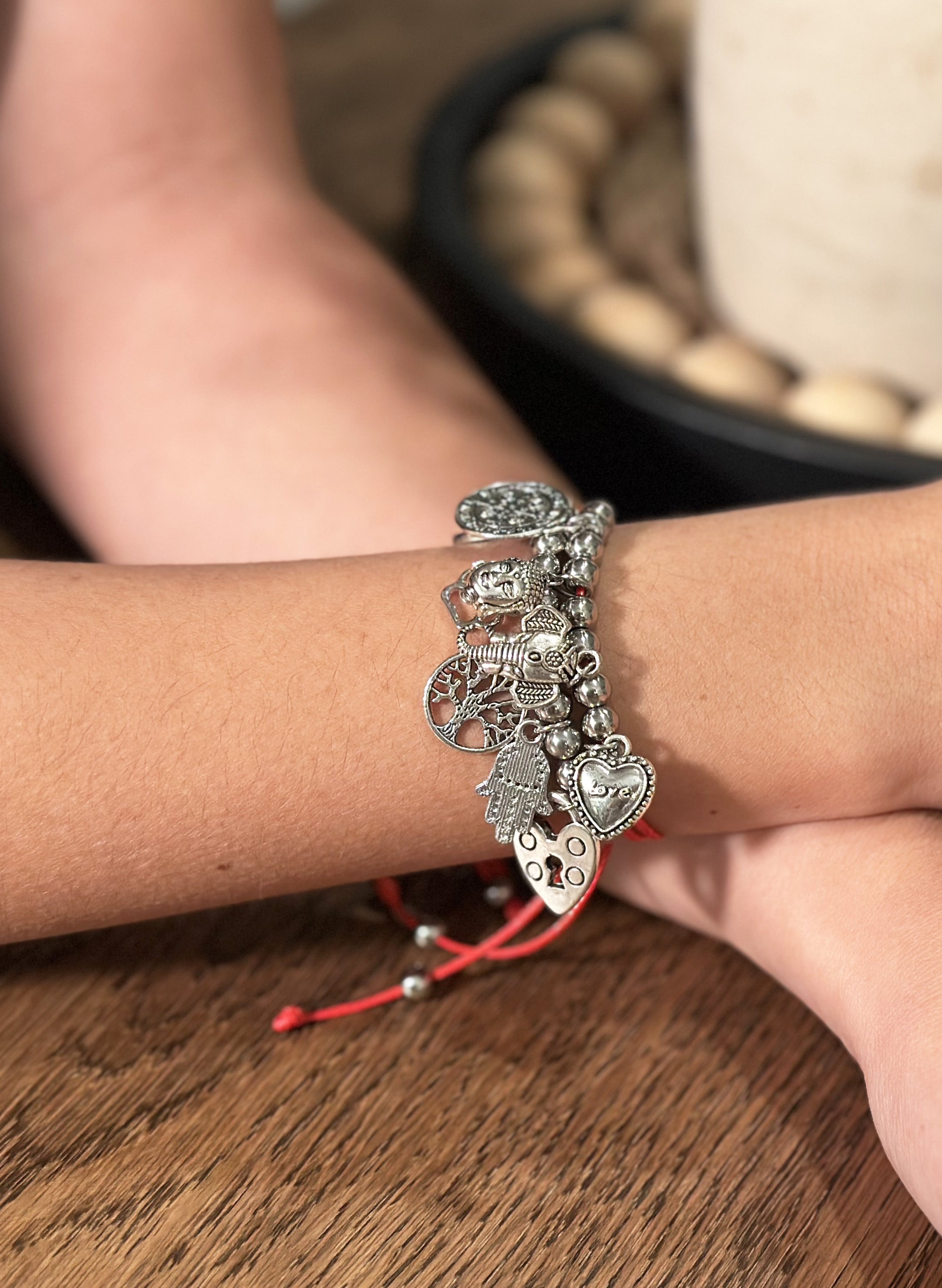 Pulsera doble ajustable elaborada en cordon con dijes niquelados en plata, y balines de acero.