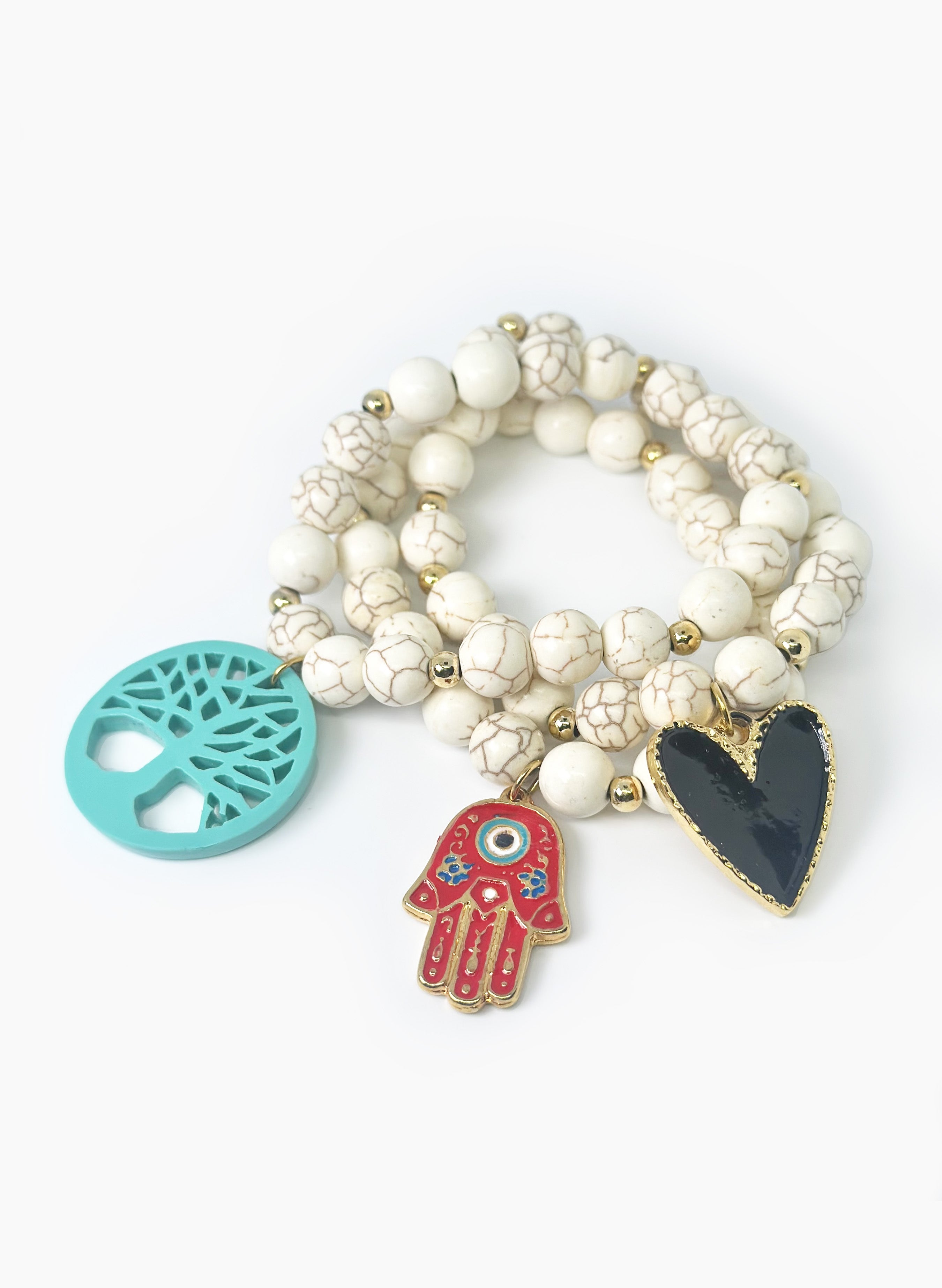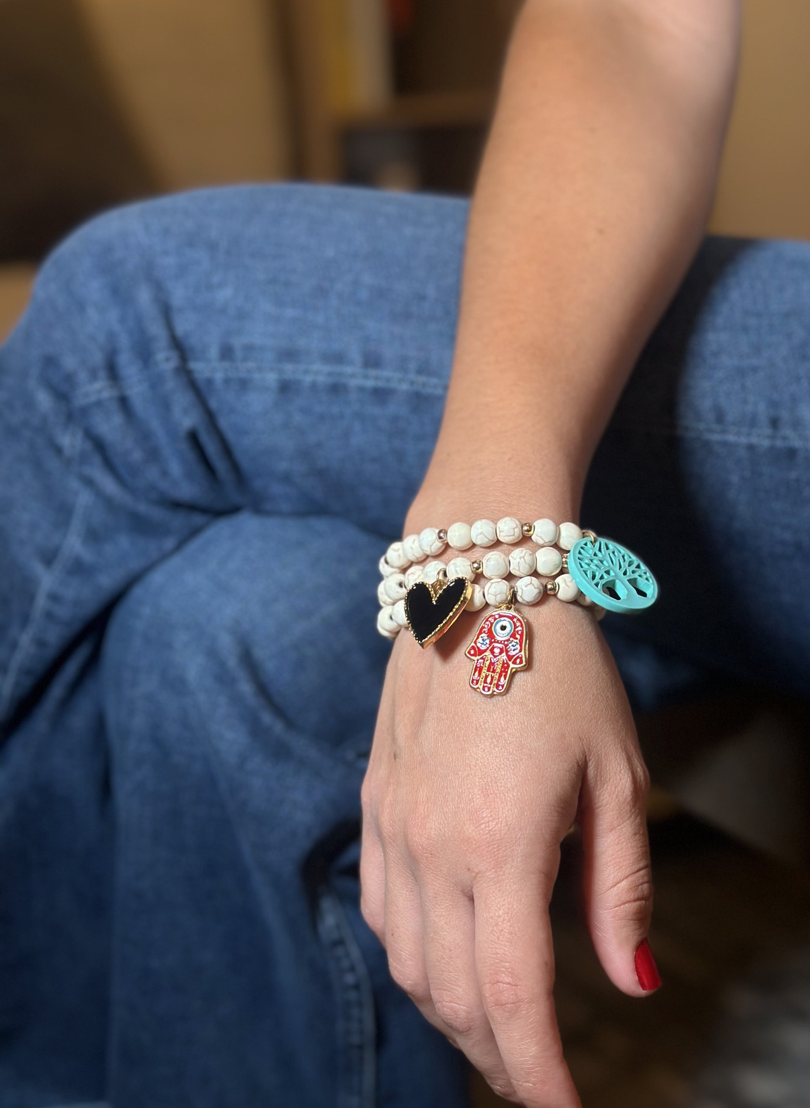 Set de 3 pulseras elásticas hechas a mano, elaboradas en piedra howlite con dijes en baño en oro de 24 kilates y resina.