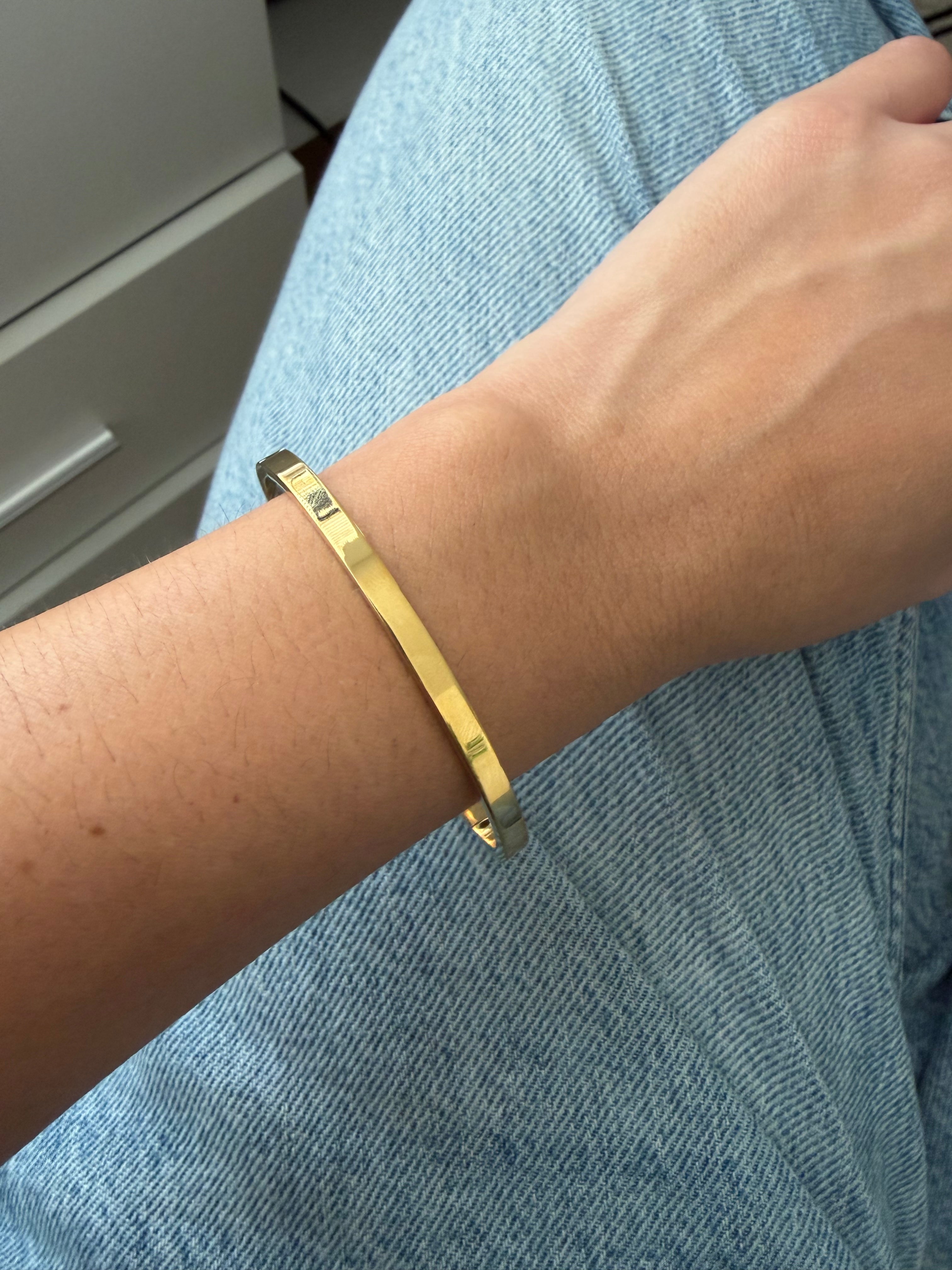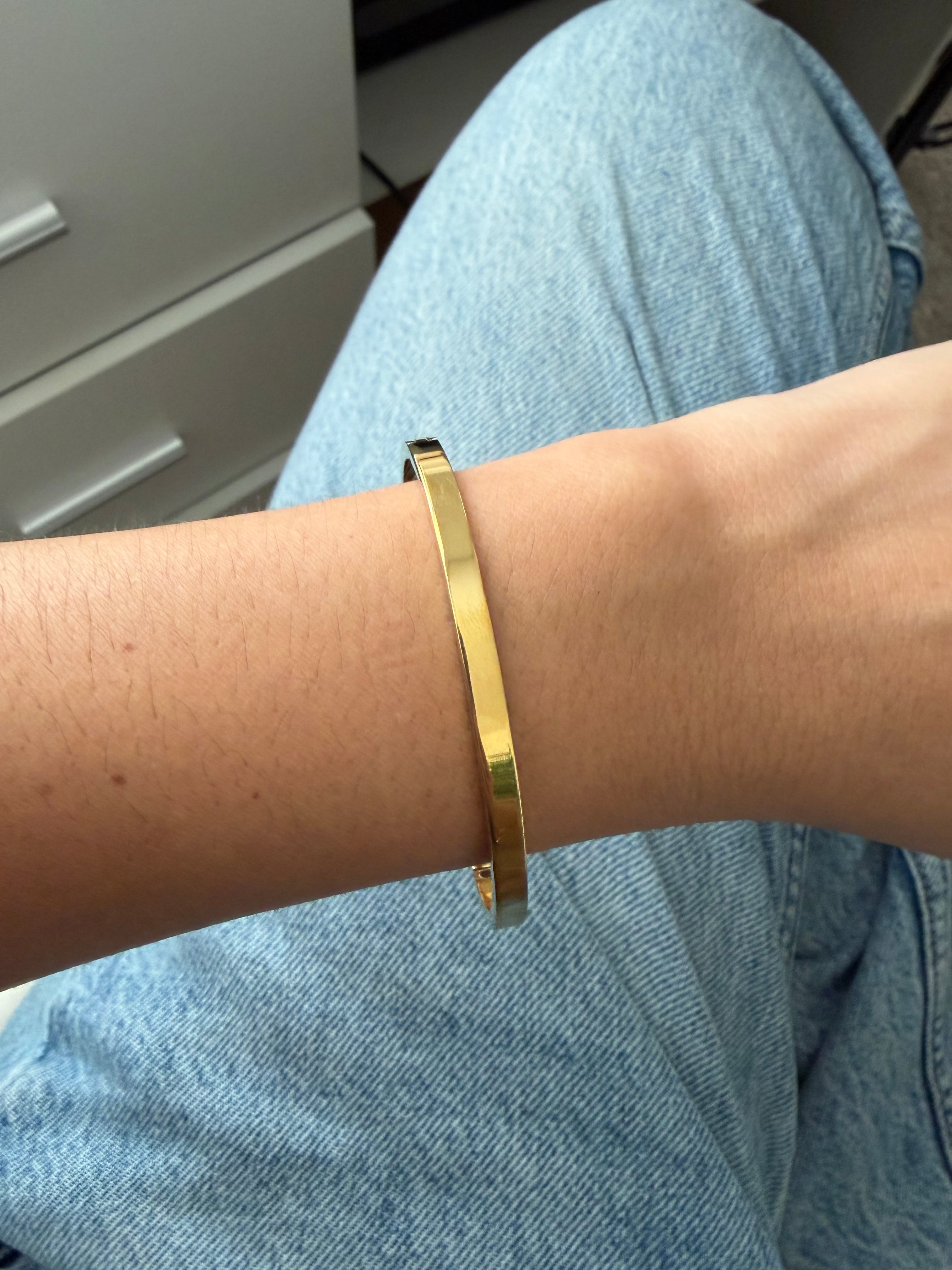 Esta pulsera rígida dorada en acero inoxidable presenta un diseño básico y atemporal, ideal para combinar con otros accesorios o usar sola como pieza protagonista. Su acabado limpio la convierte en un complemento versátil que se adapta fácilmente a cualquier estilo y ocasión.