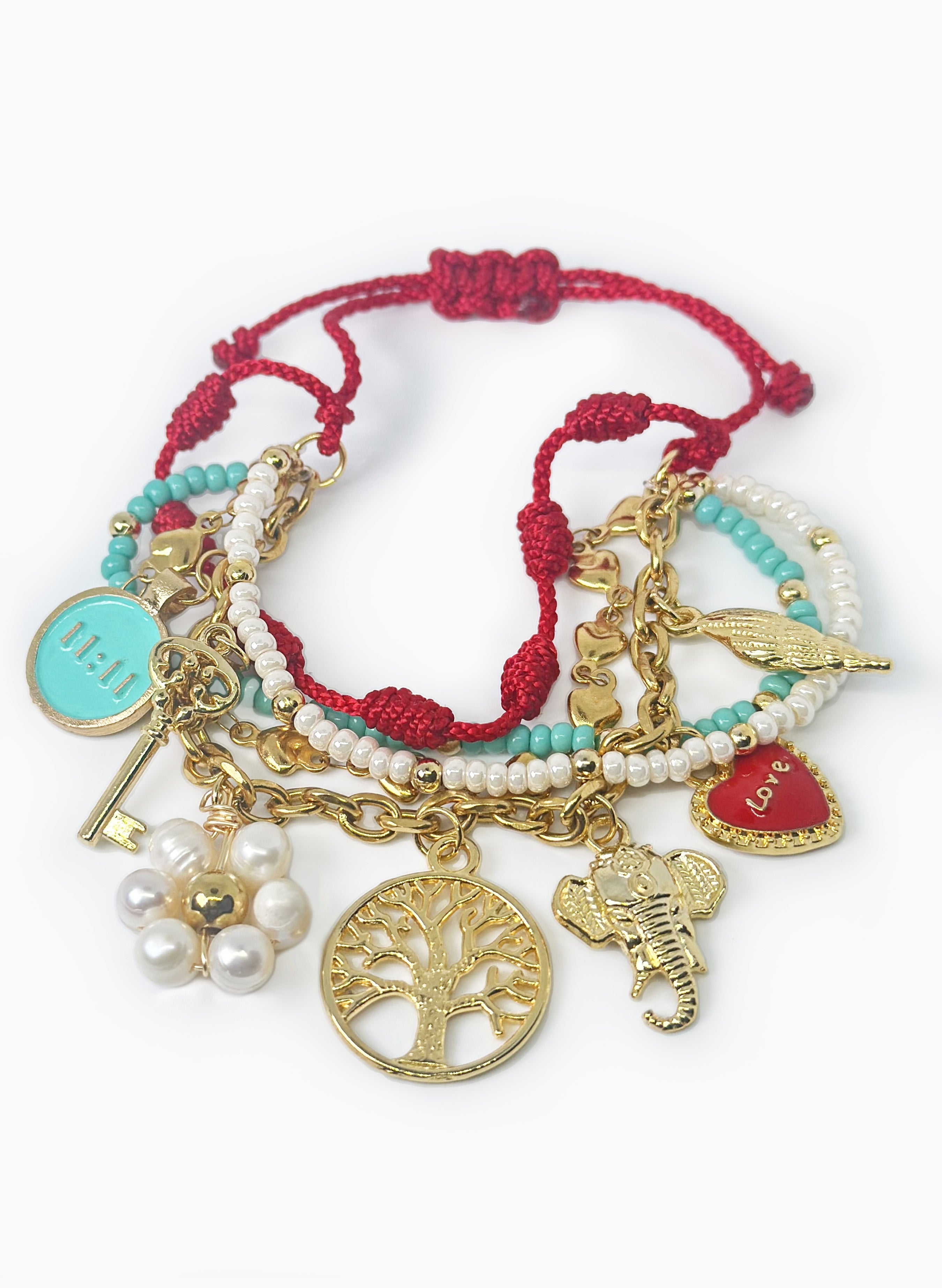 5 pulseras unidas ajustables hechas a mano, hechas con mostacilla, cadenas en acero, dijes resinados con baño en oro de 24 kilates y nudos franciscanos.