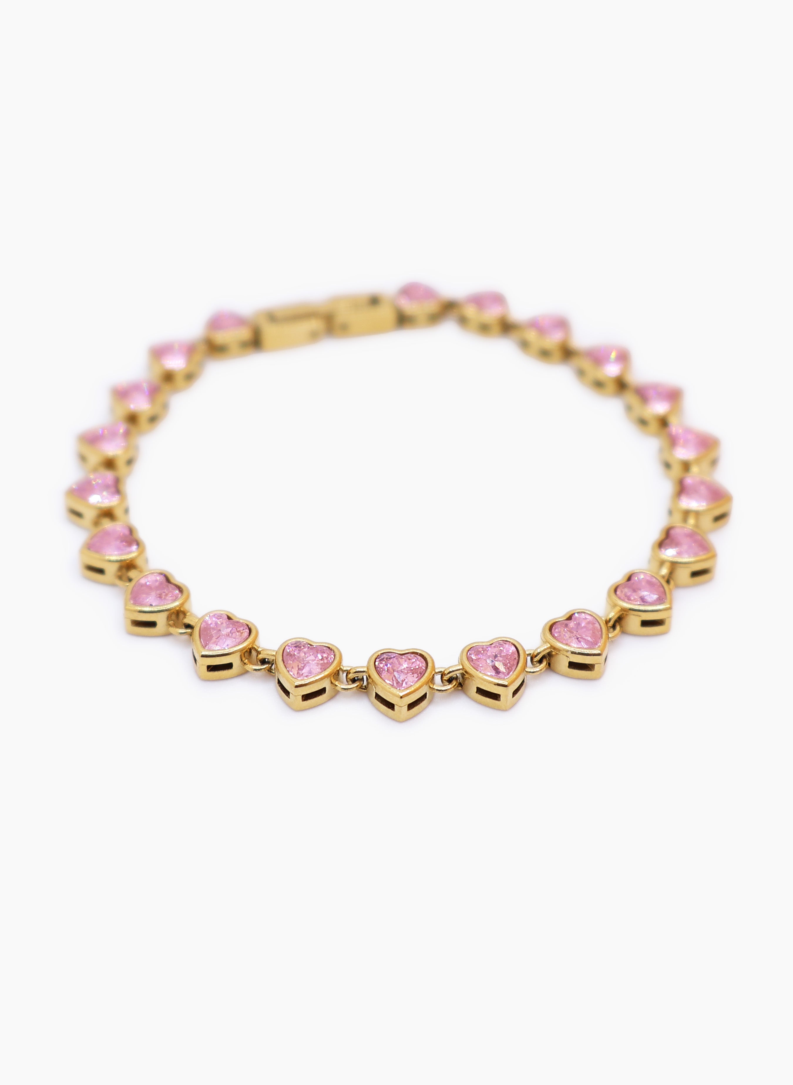 Pulsera hecha en acero inoxidable con circones rosados.