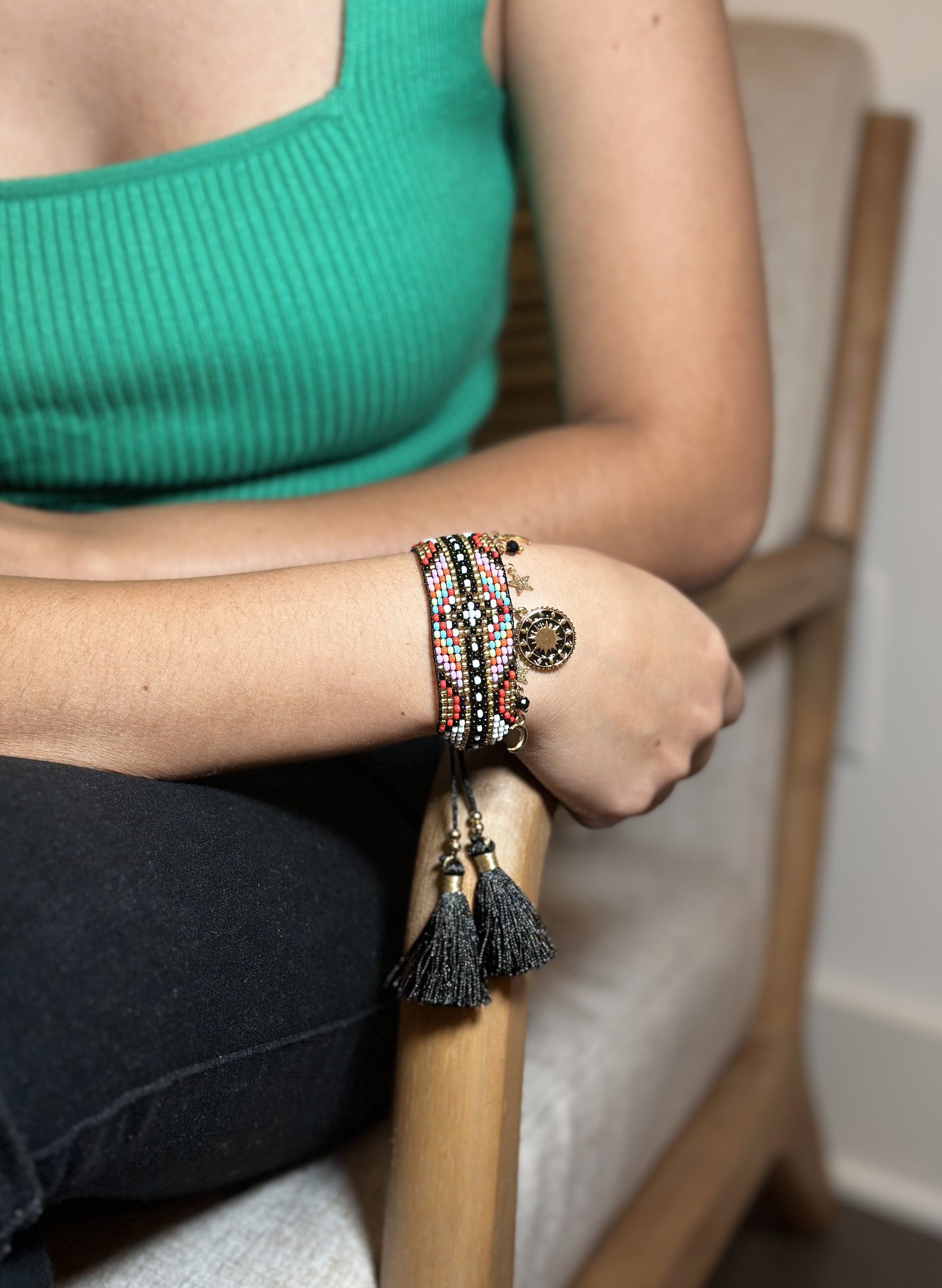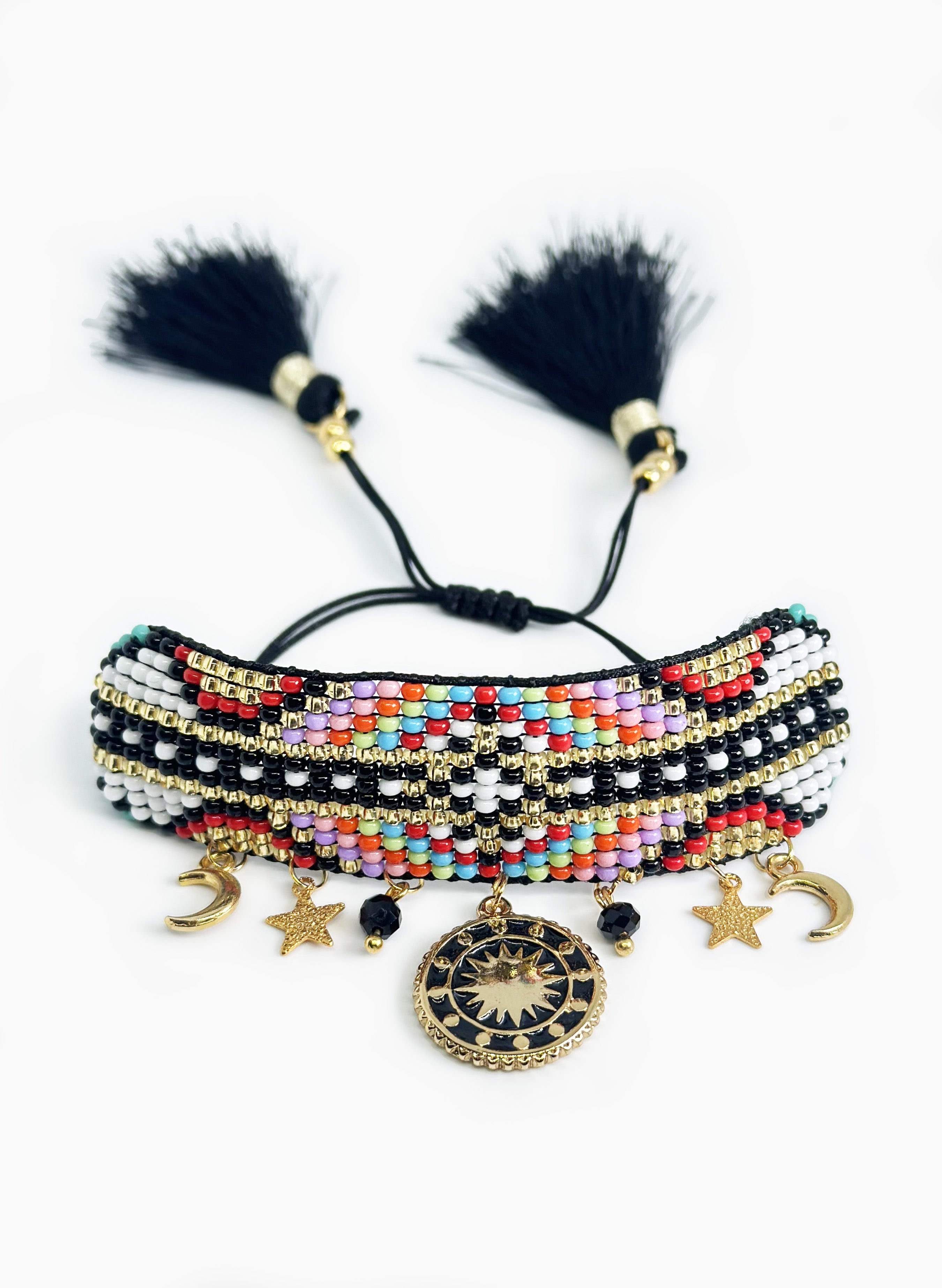 Pulsera hecha a mano, tejida con mostacilla checa con nudo corredizo. Dijes y acabados en oro gold filled.