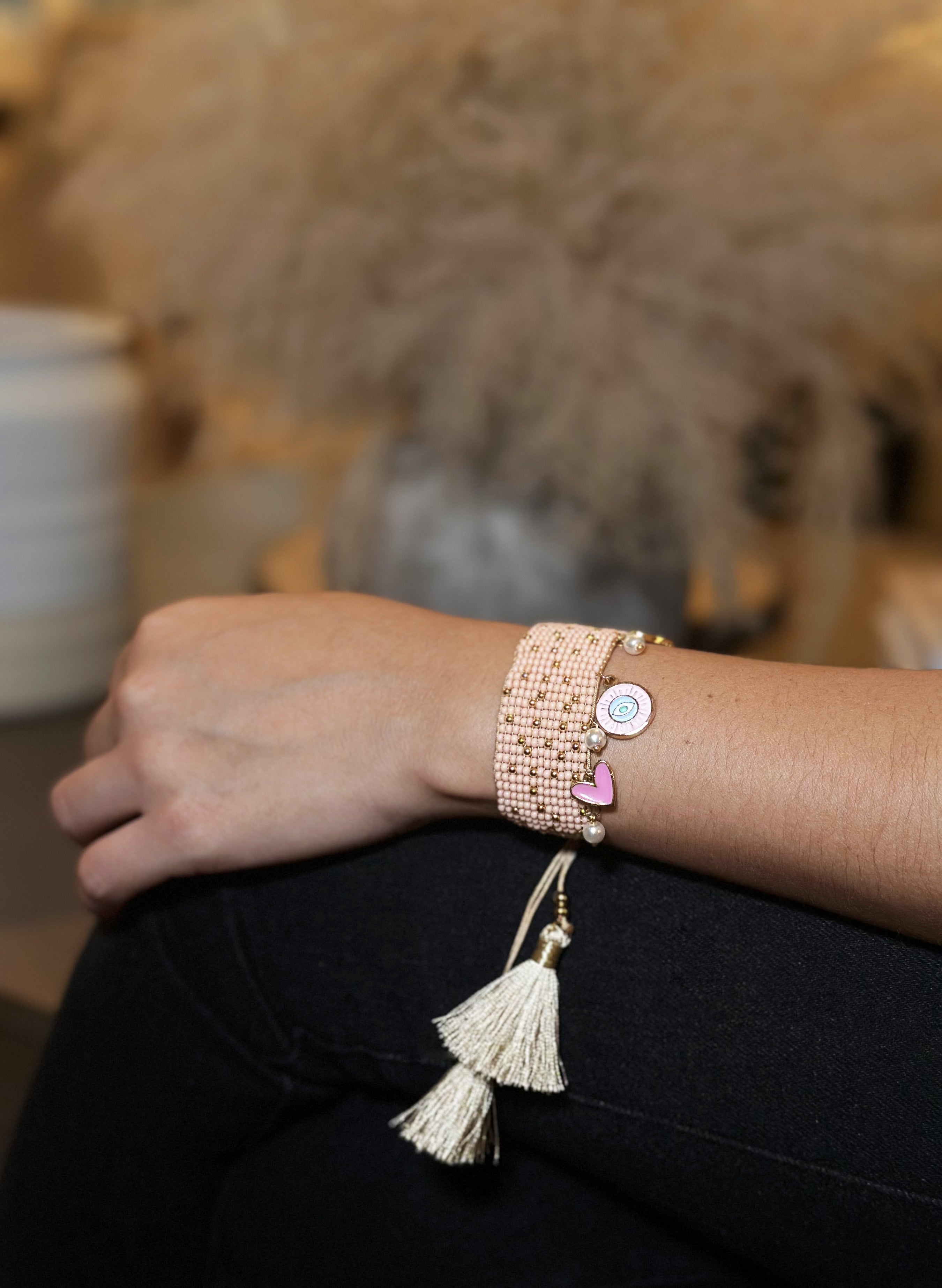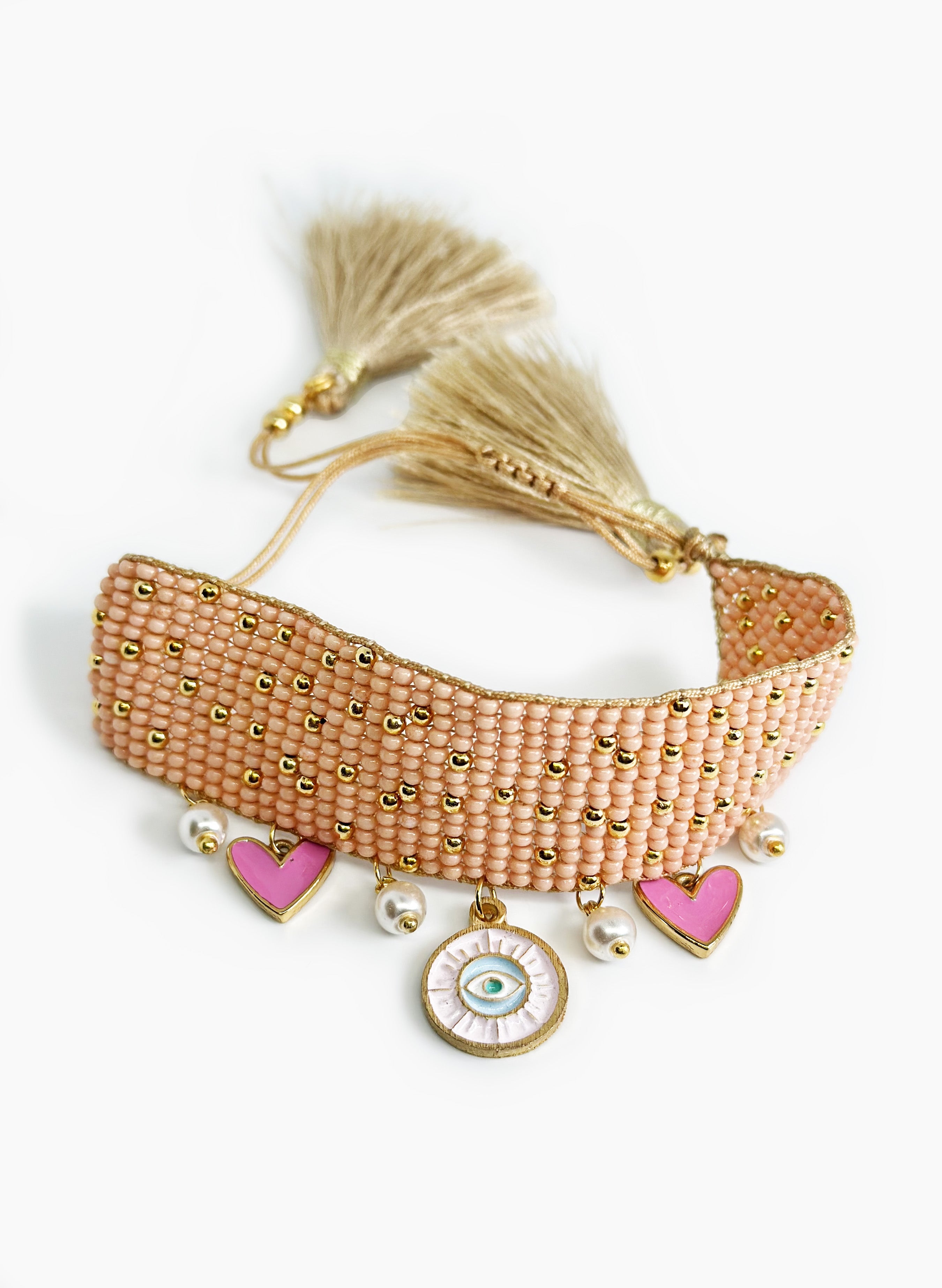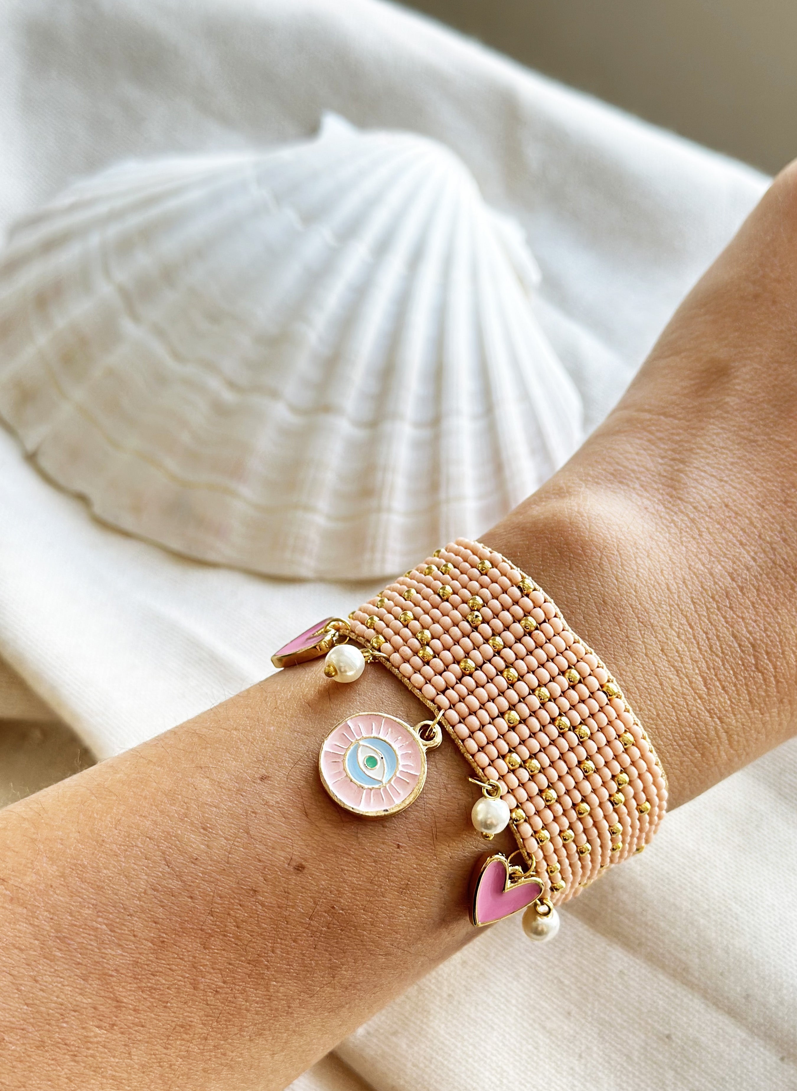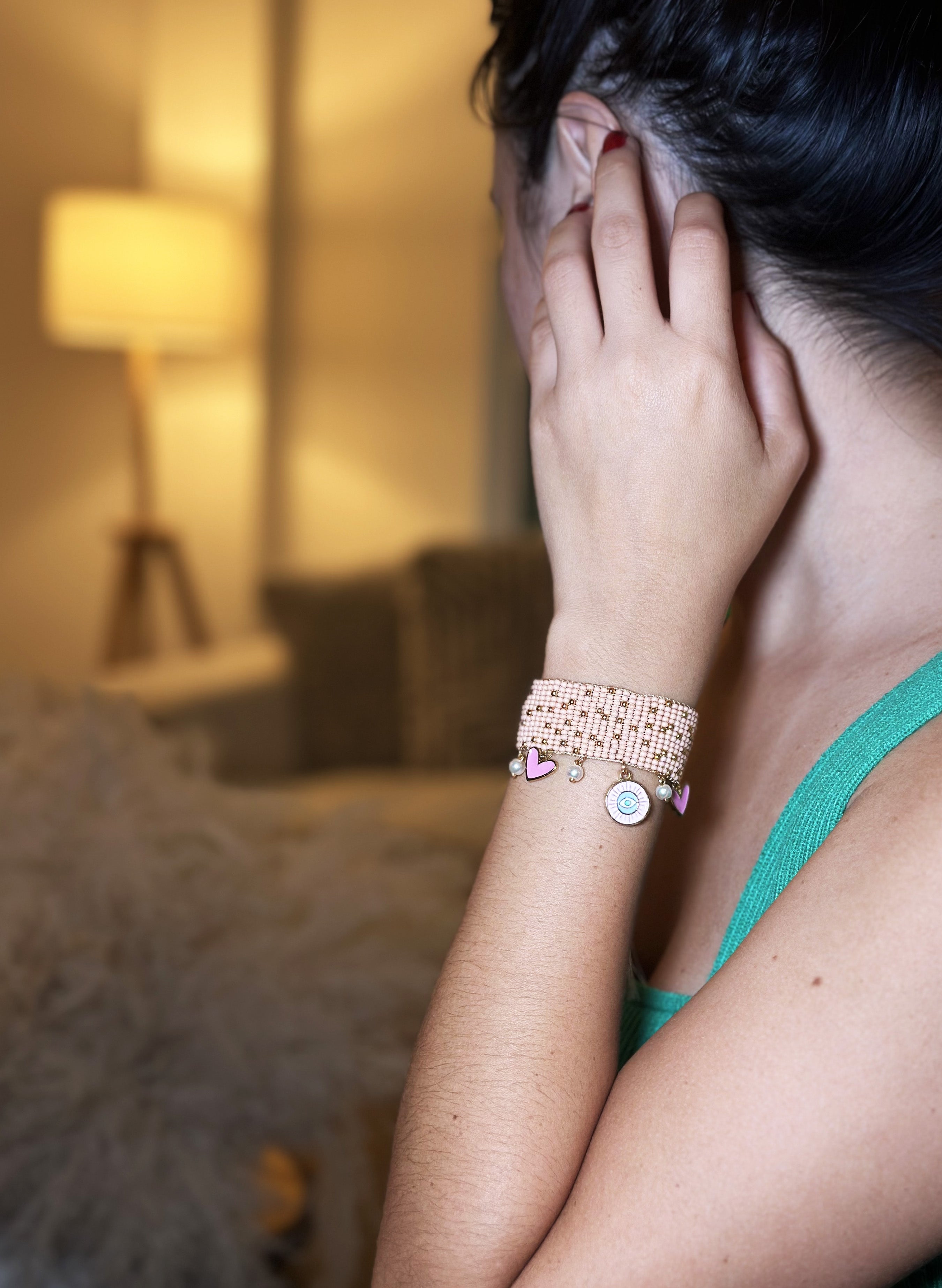 Pulsera hecha a mano, tejida con mostacilla checa con nudo corredizo. Dijes y acabados en oro gold filled.