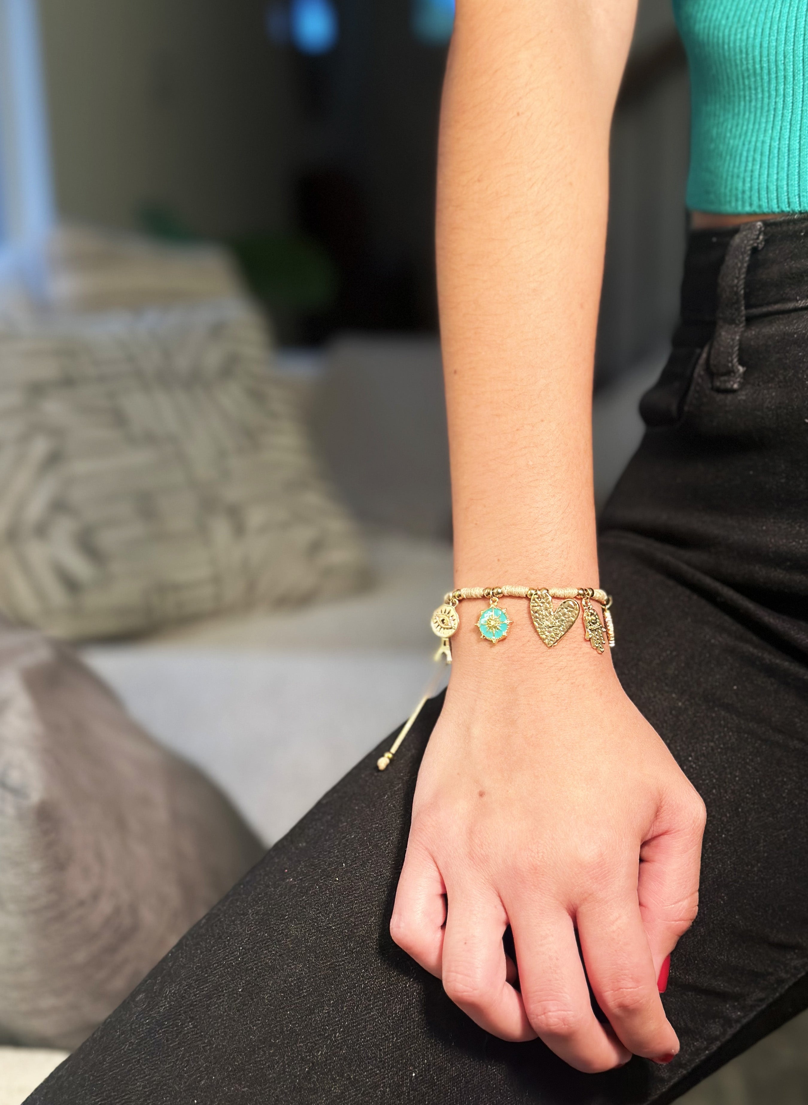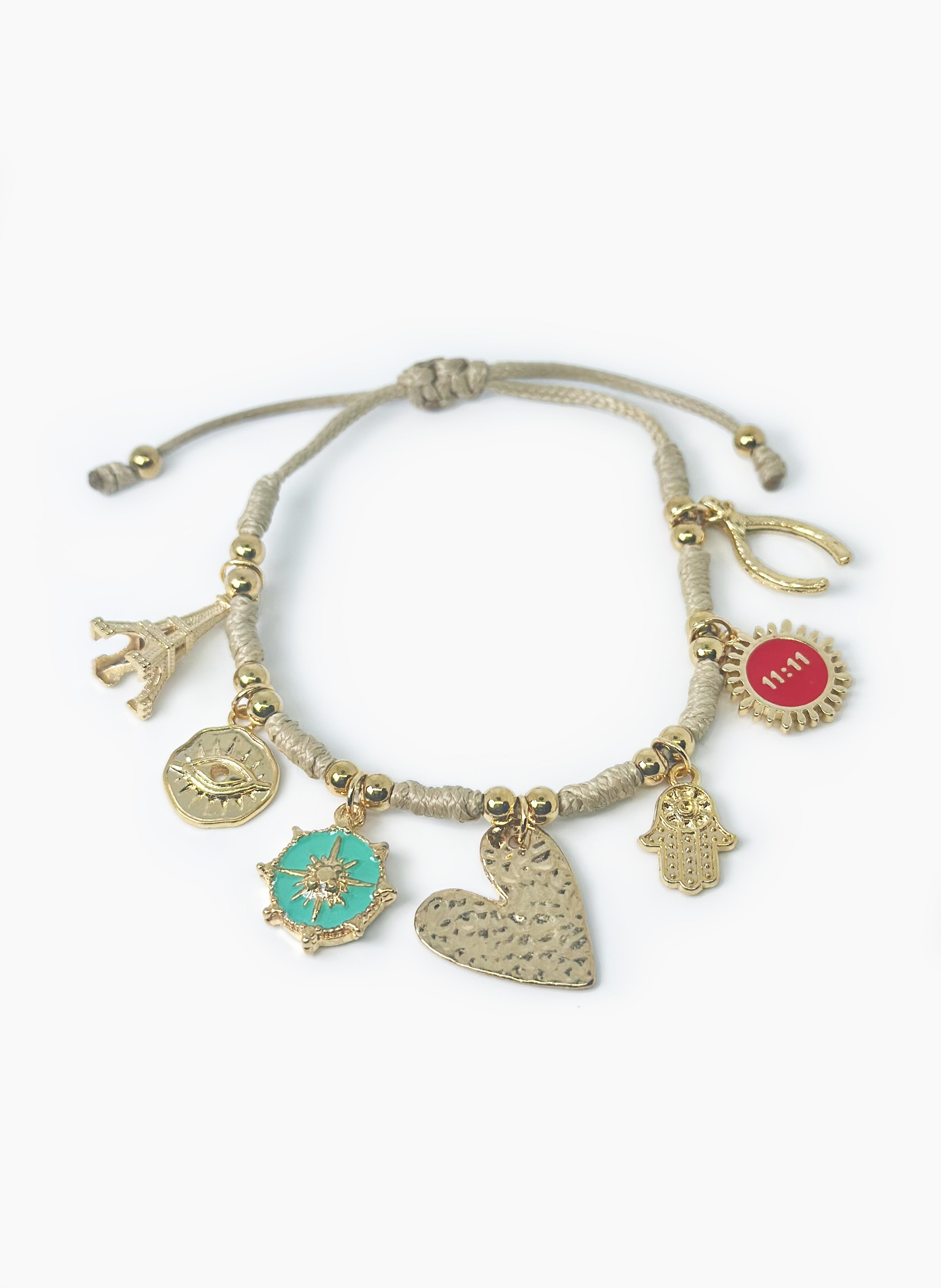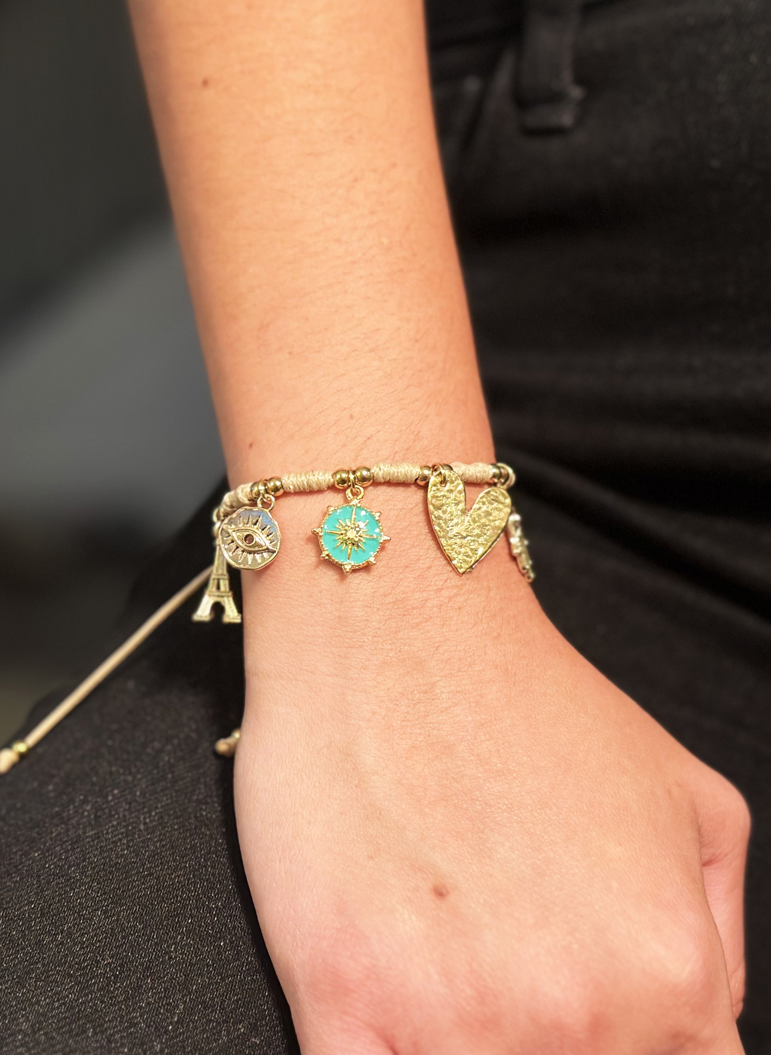 Pulsera hecha a mano, con balines en acero, con dijes en baño en oro de 24 kilates. Cordon ajustable.