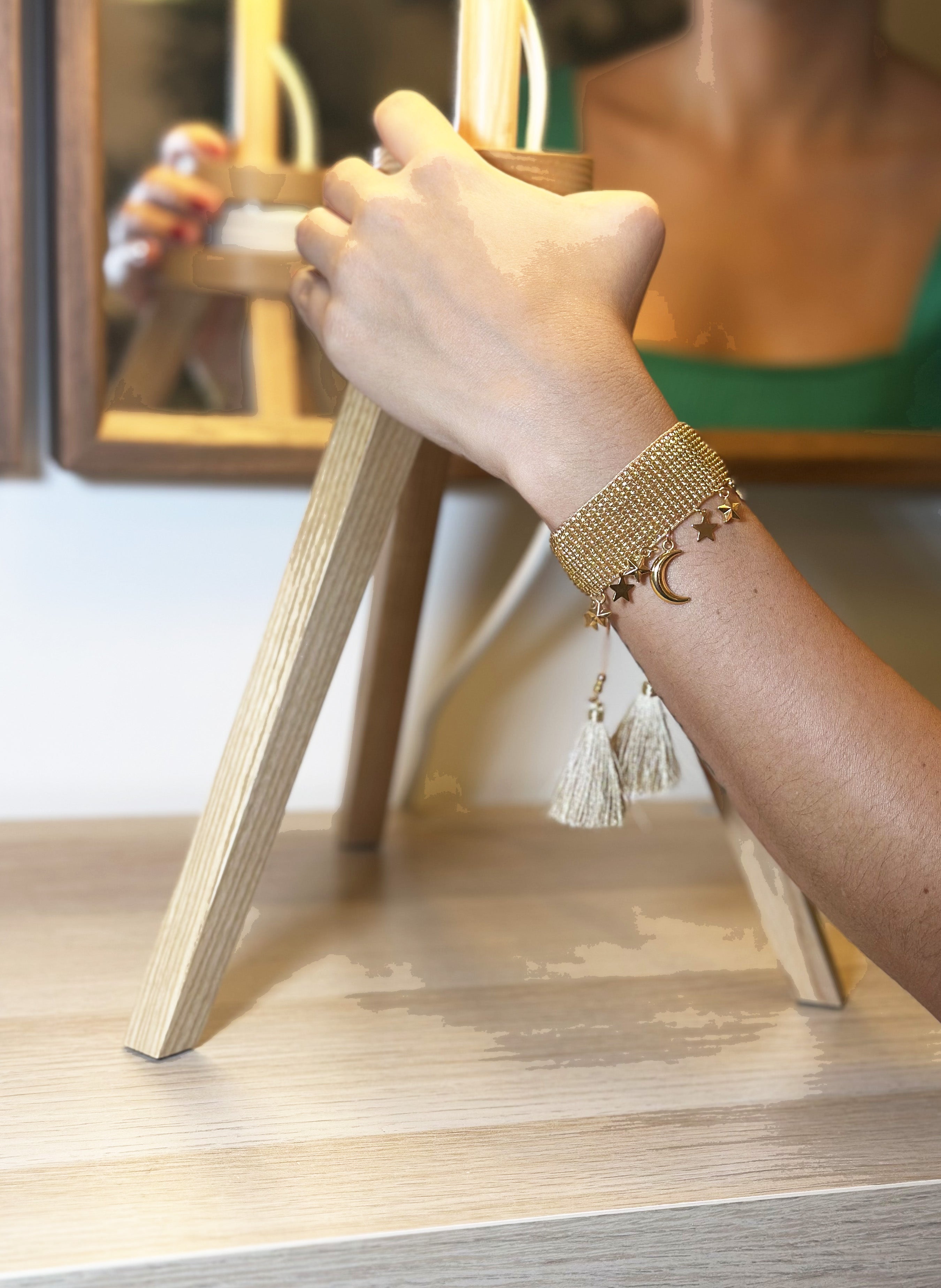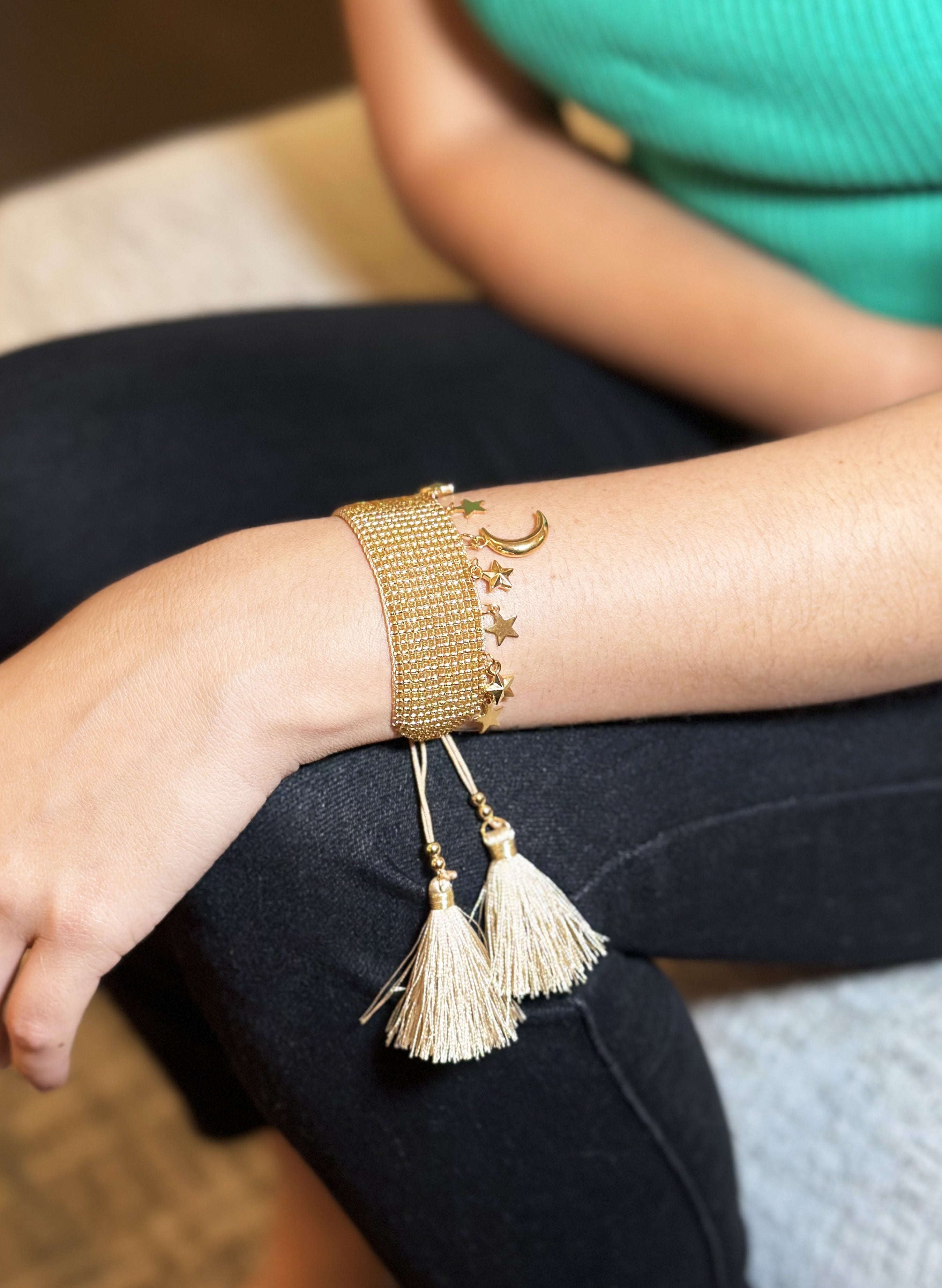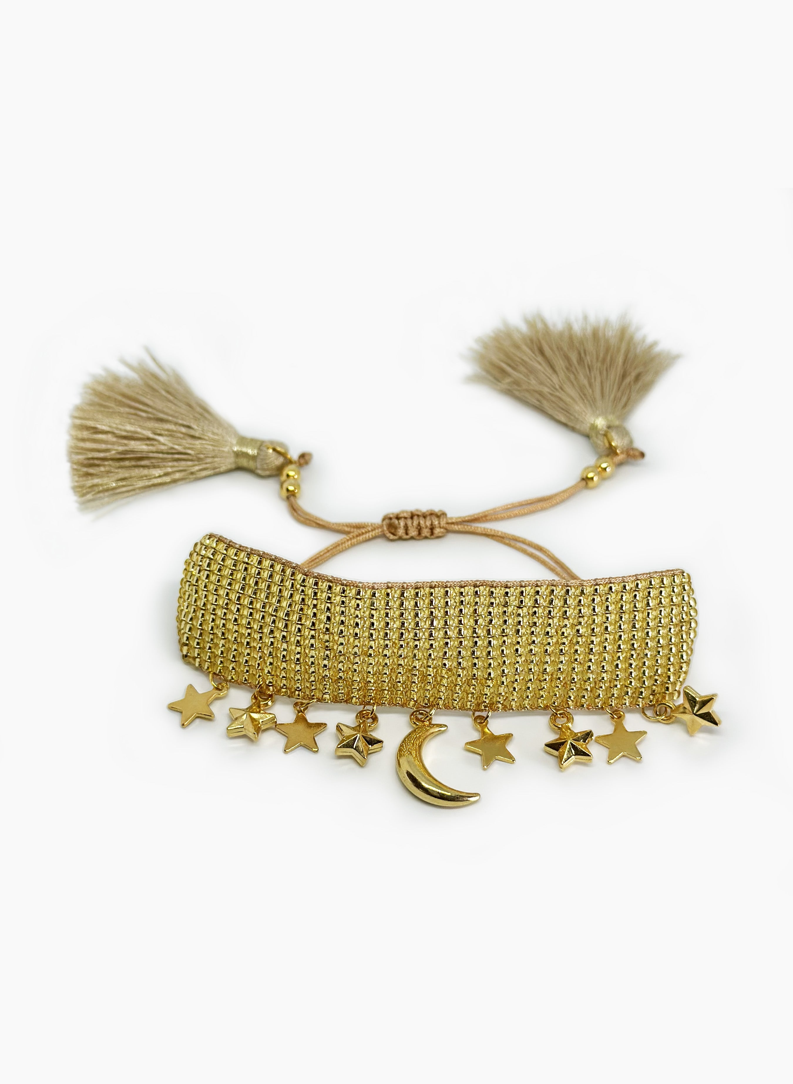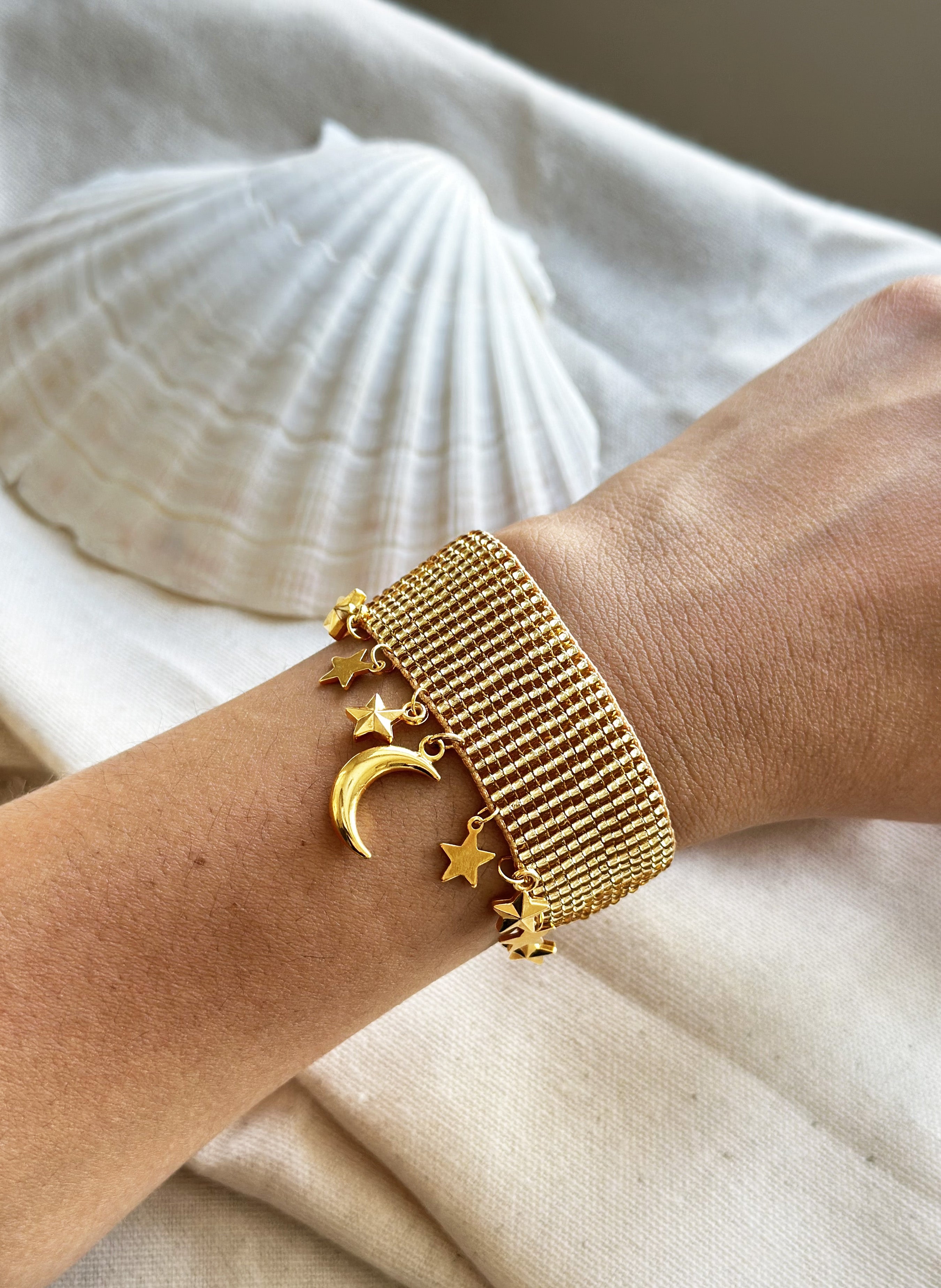 Pulsera hecha a mano, tejida con mostacilla checa con nudo corredizo. Dijes y acabados en oro gold filled.