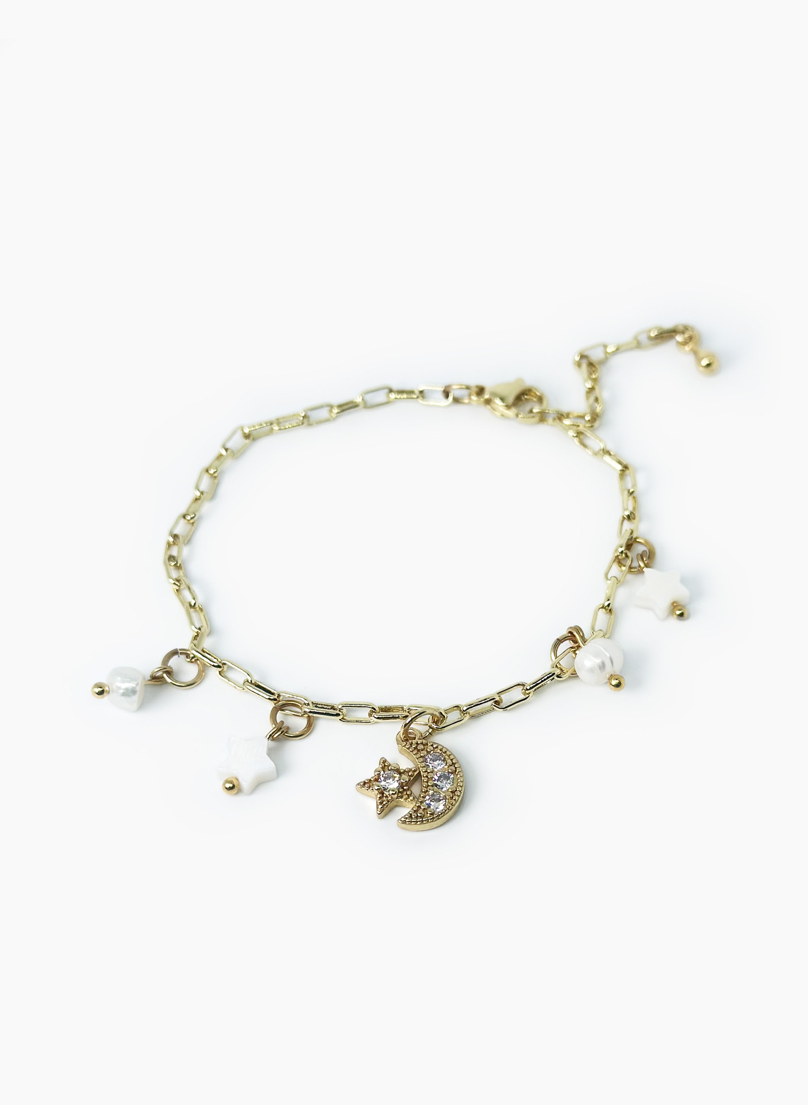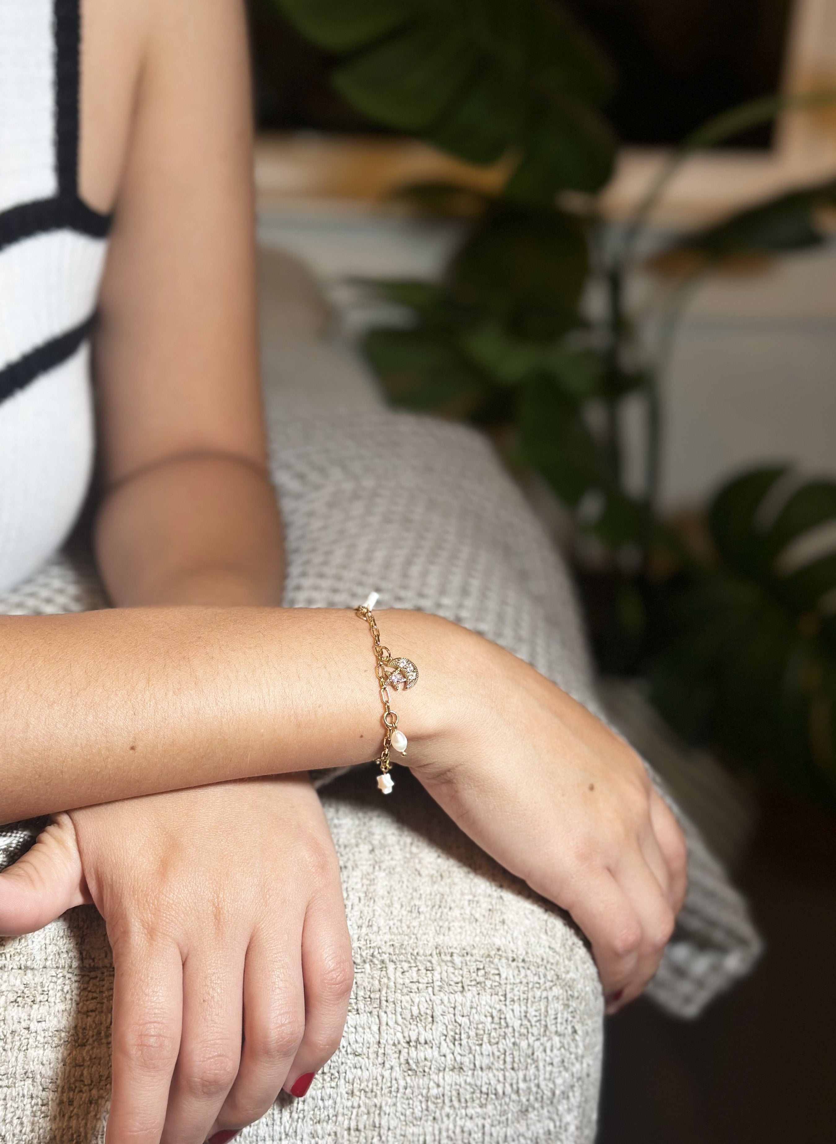 Pulsera ajustable hecha a mano, con dijes en acero rodinado, perlas dulces, y dijes en rodio y zircón con baño en oro,
