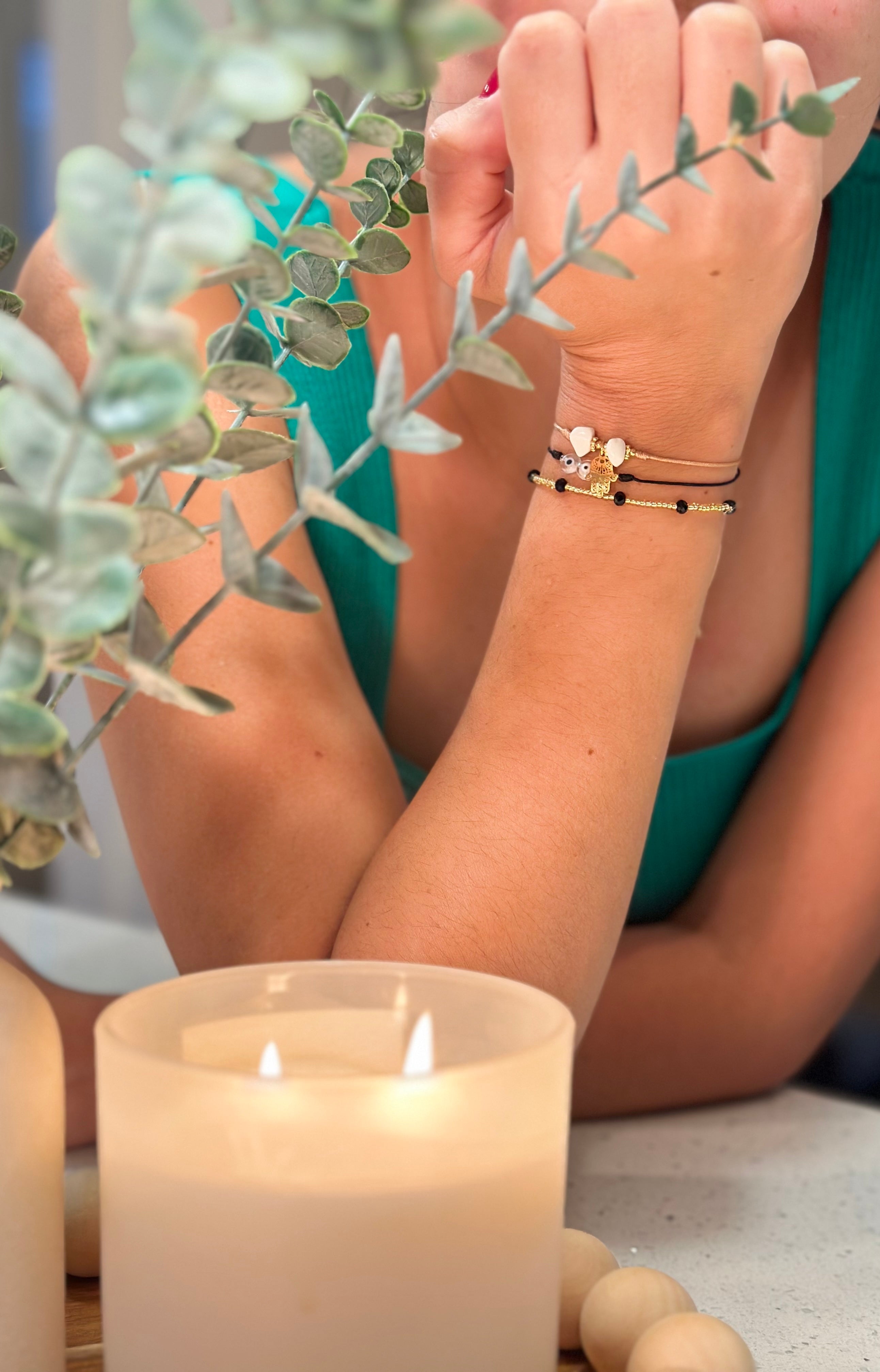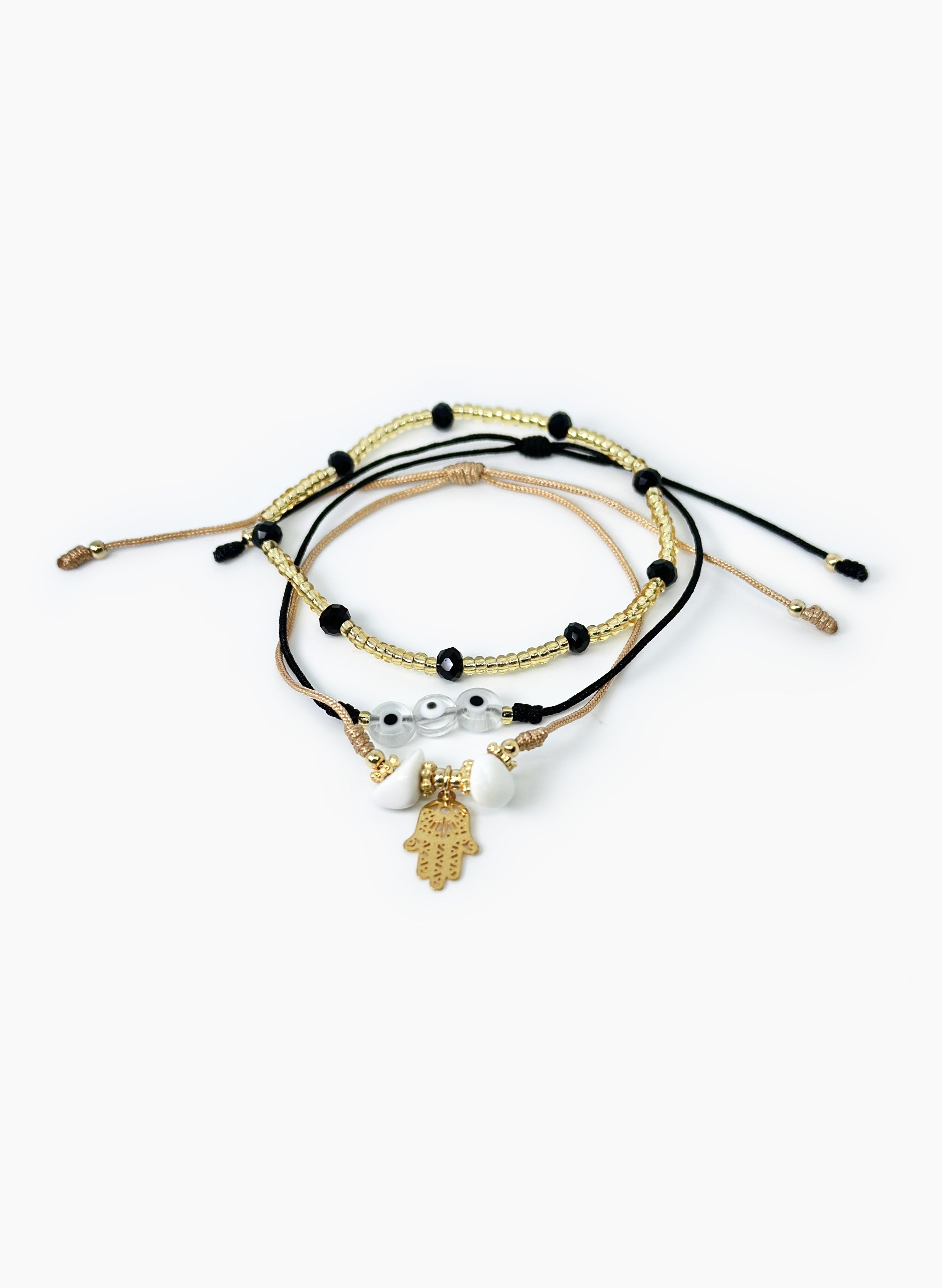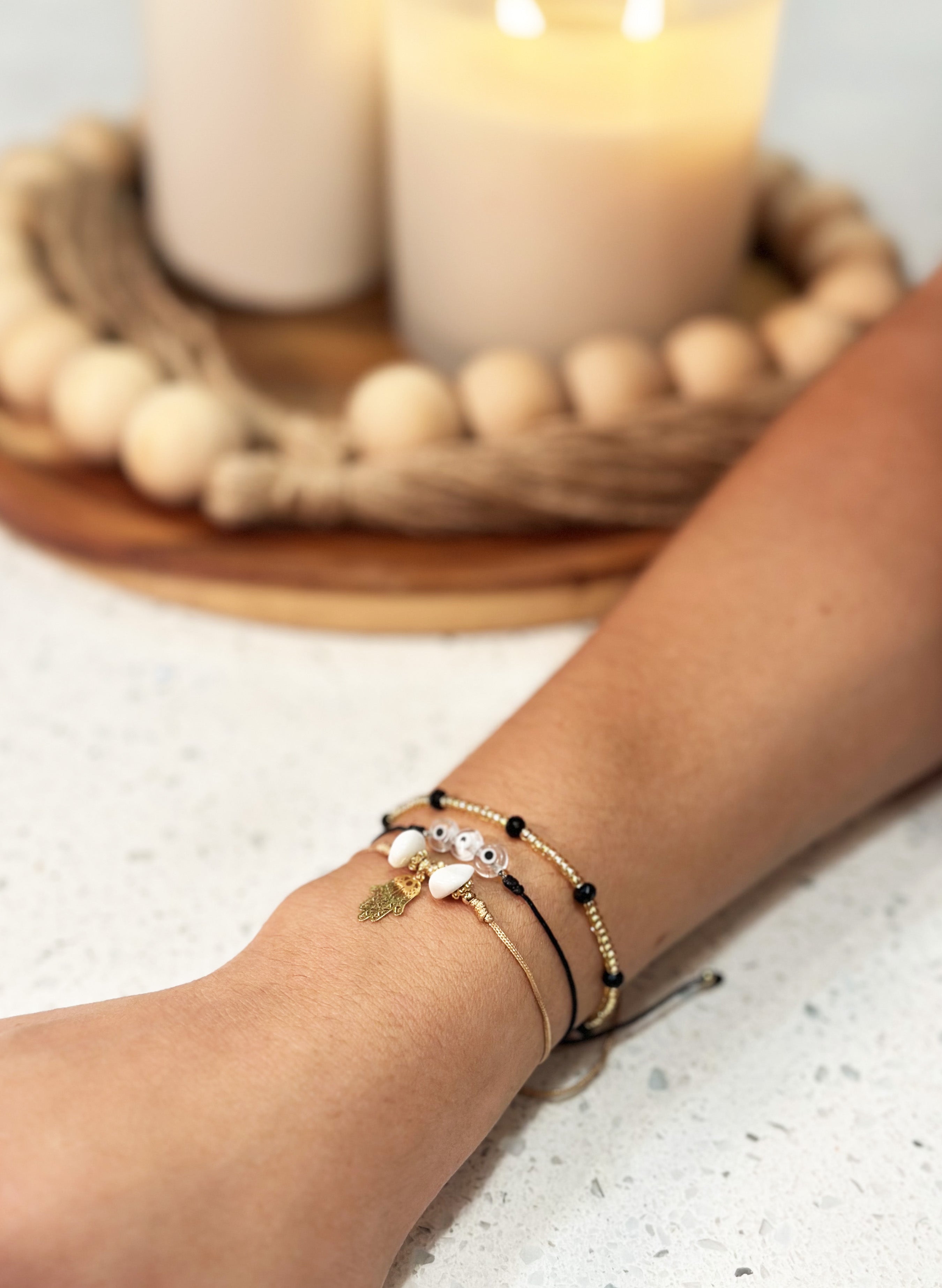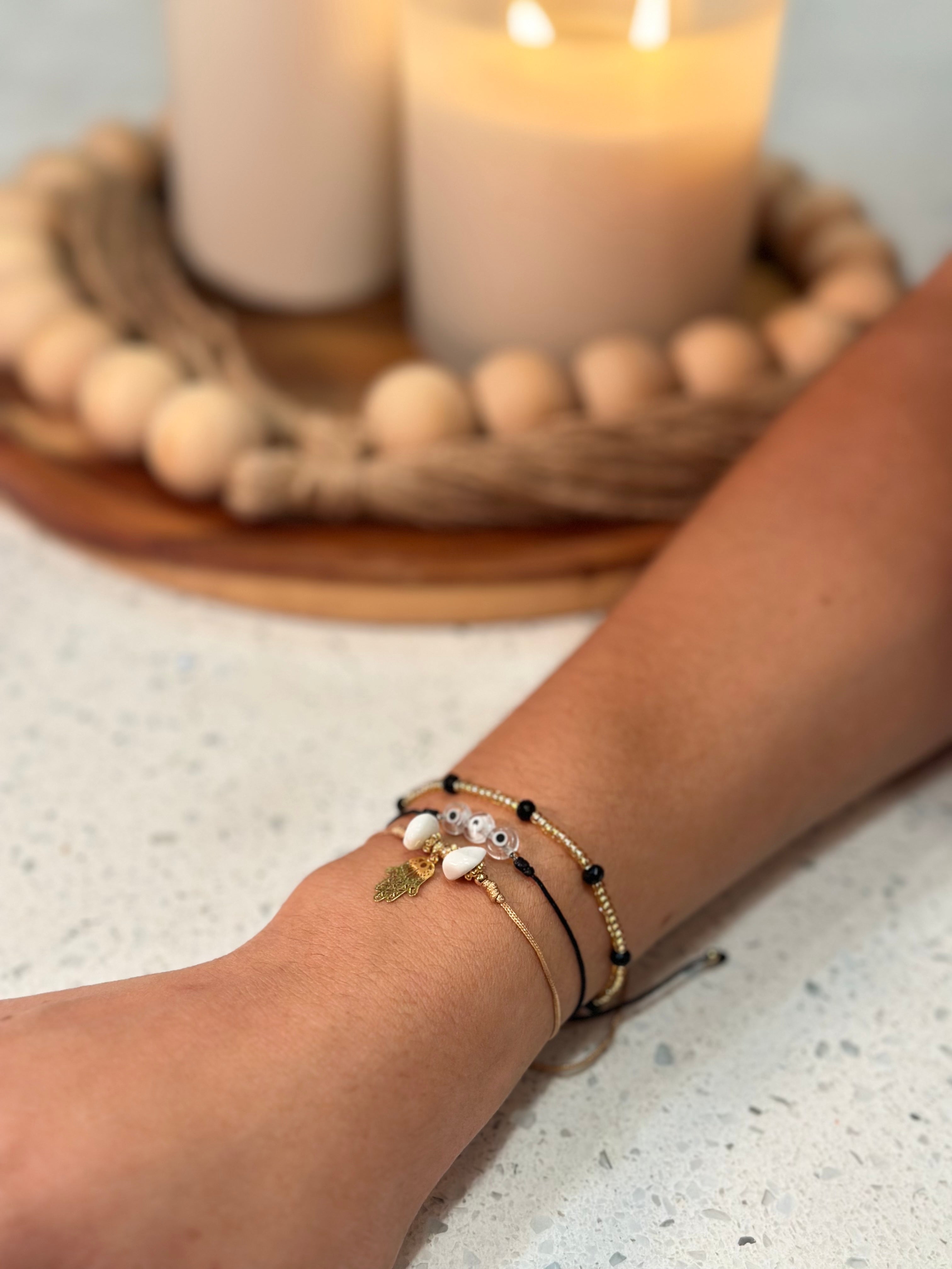 Set de 3 pulseras hechas a mano, dijes con baño en oro, piedras en murano e hilo chino ajustable