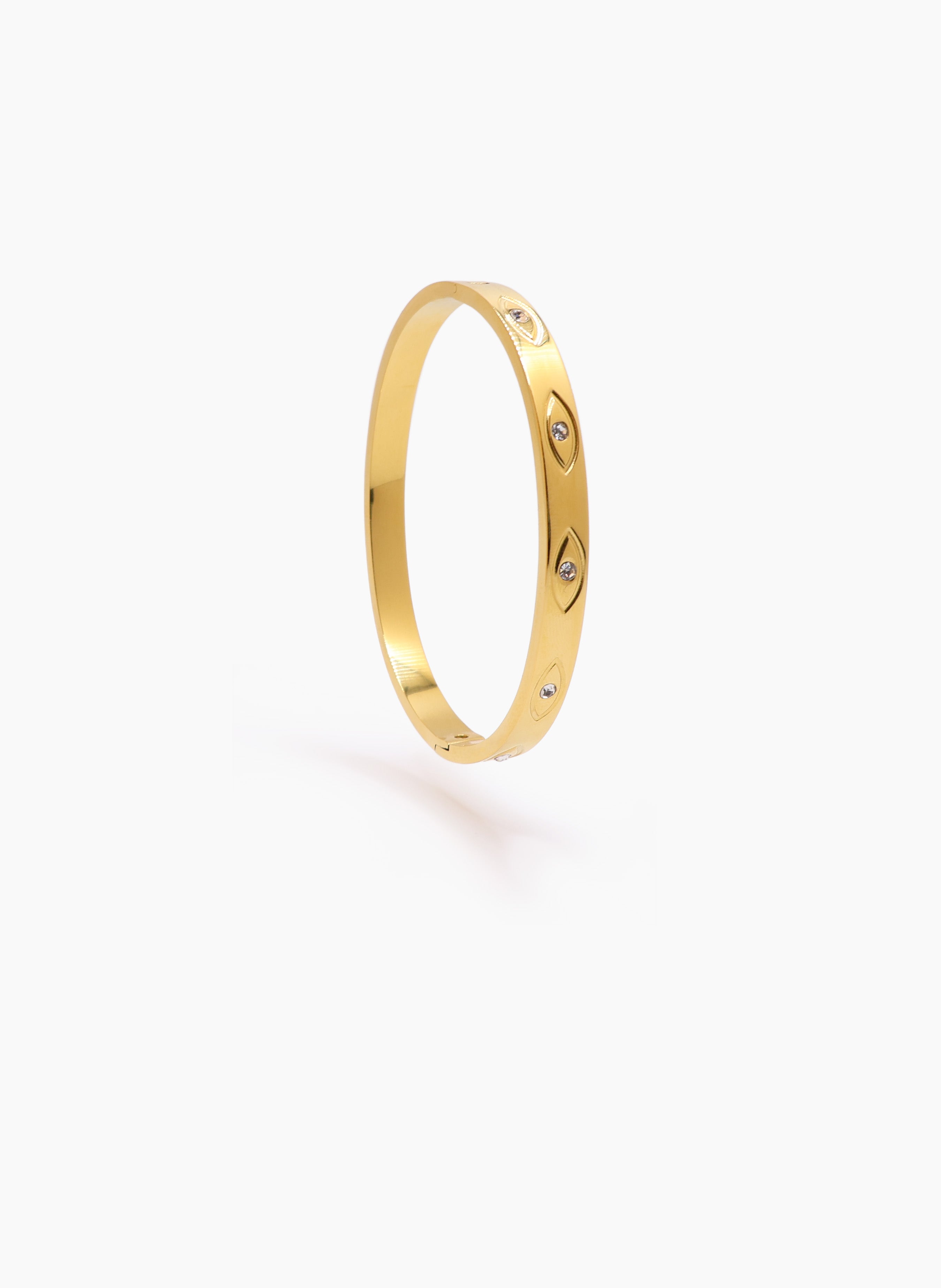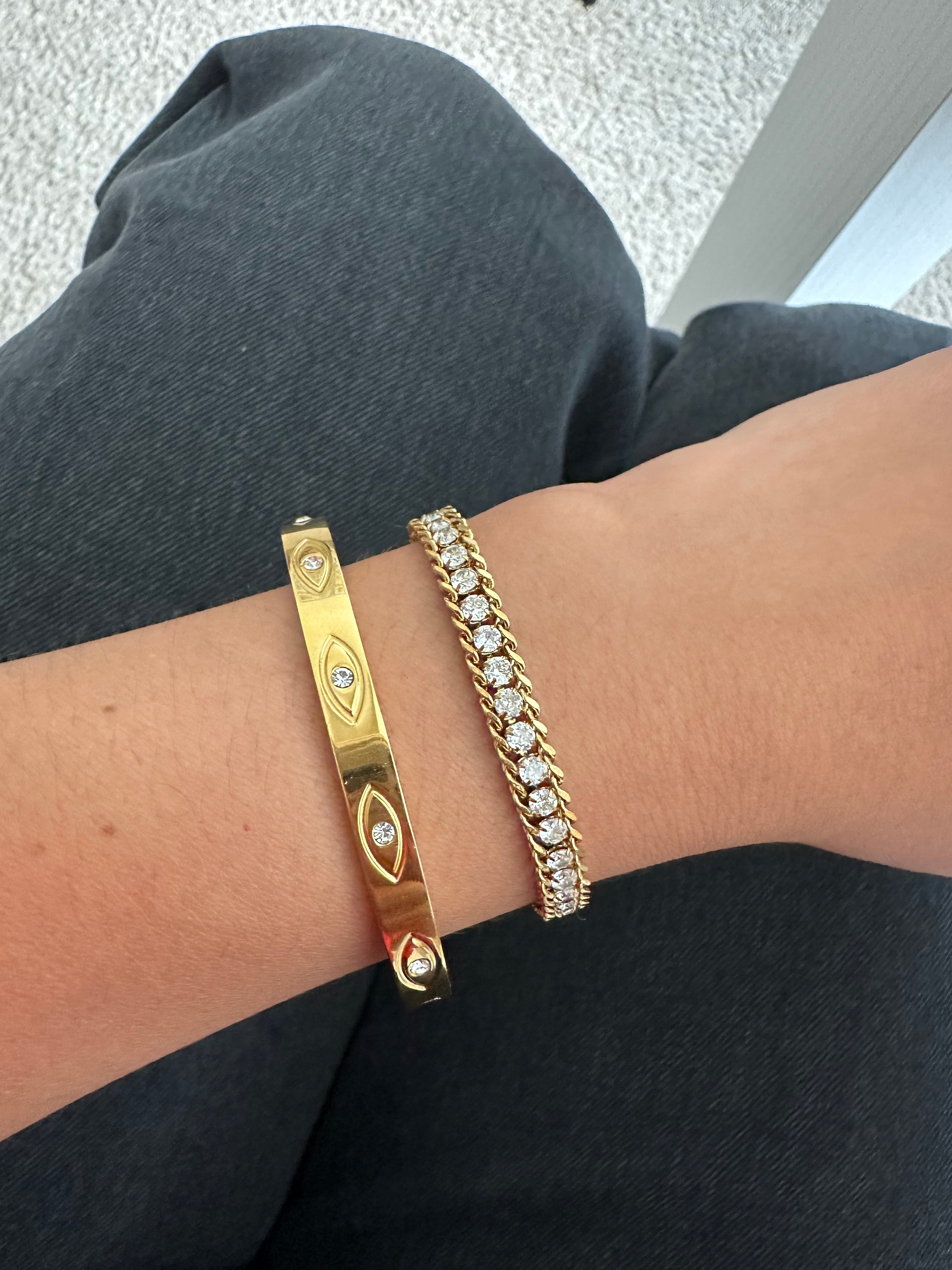 Brazalete rígido en acero inoxidable con circones brillantes.