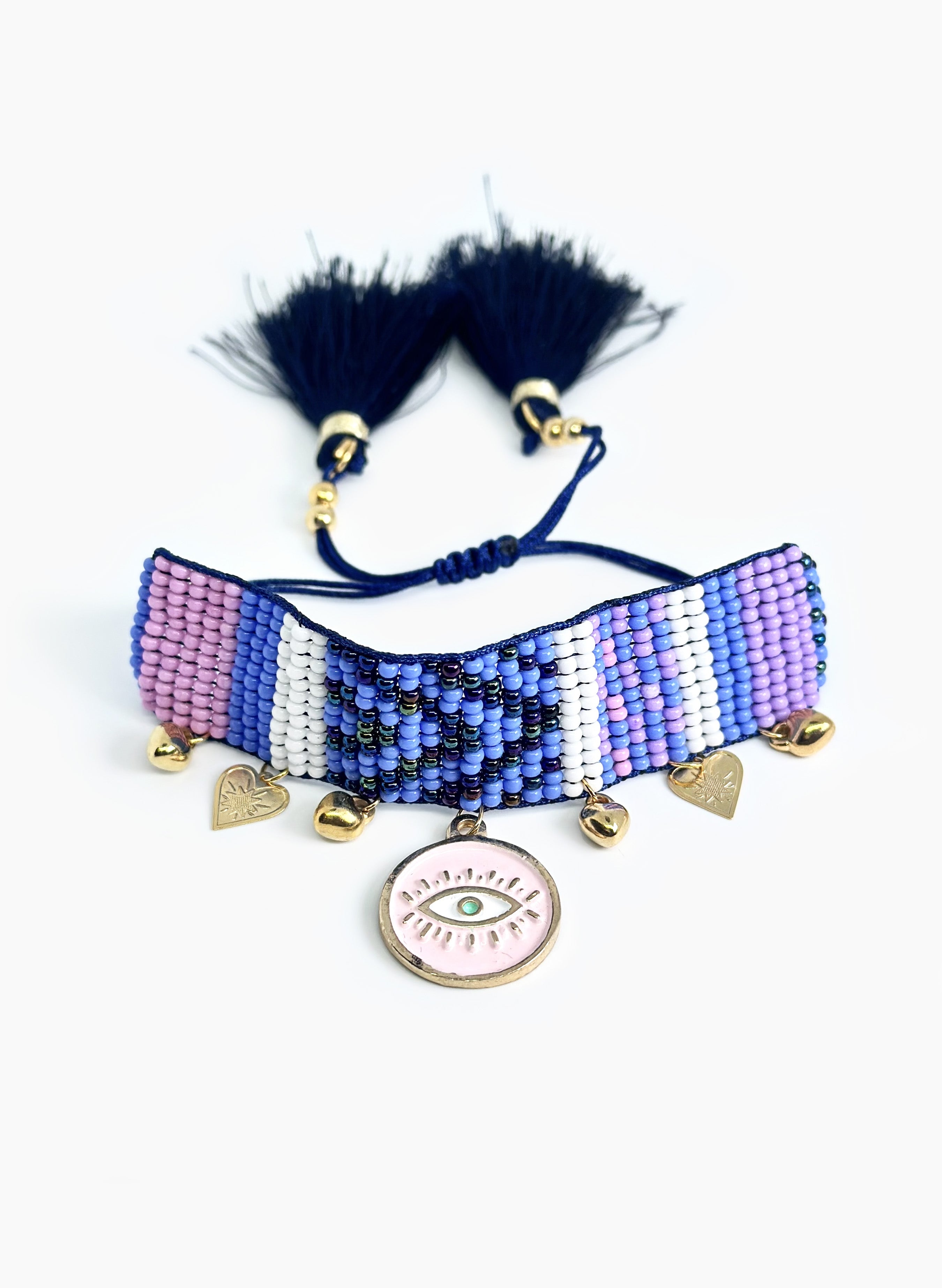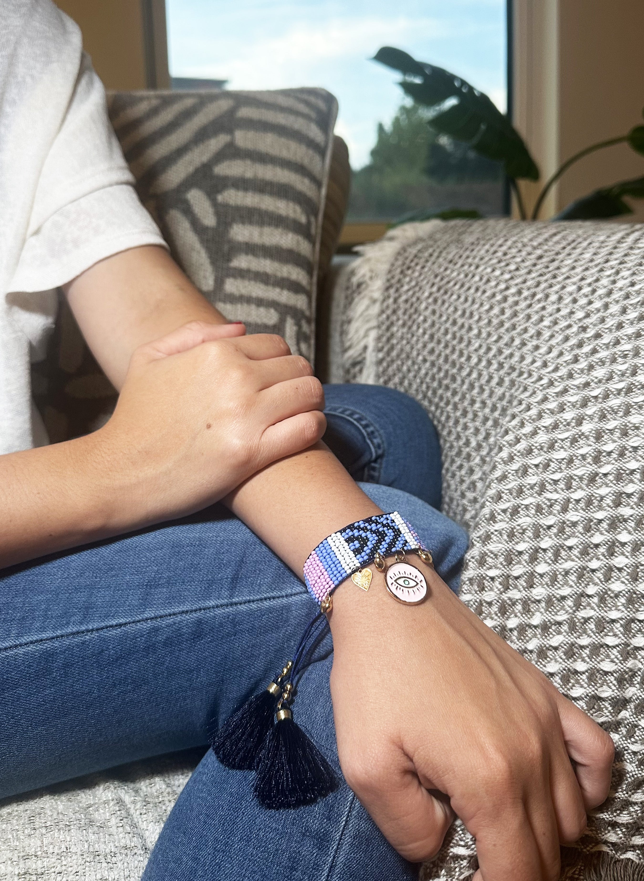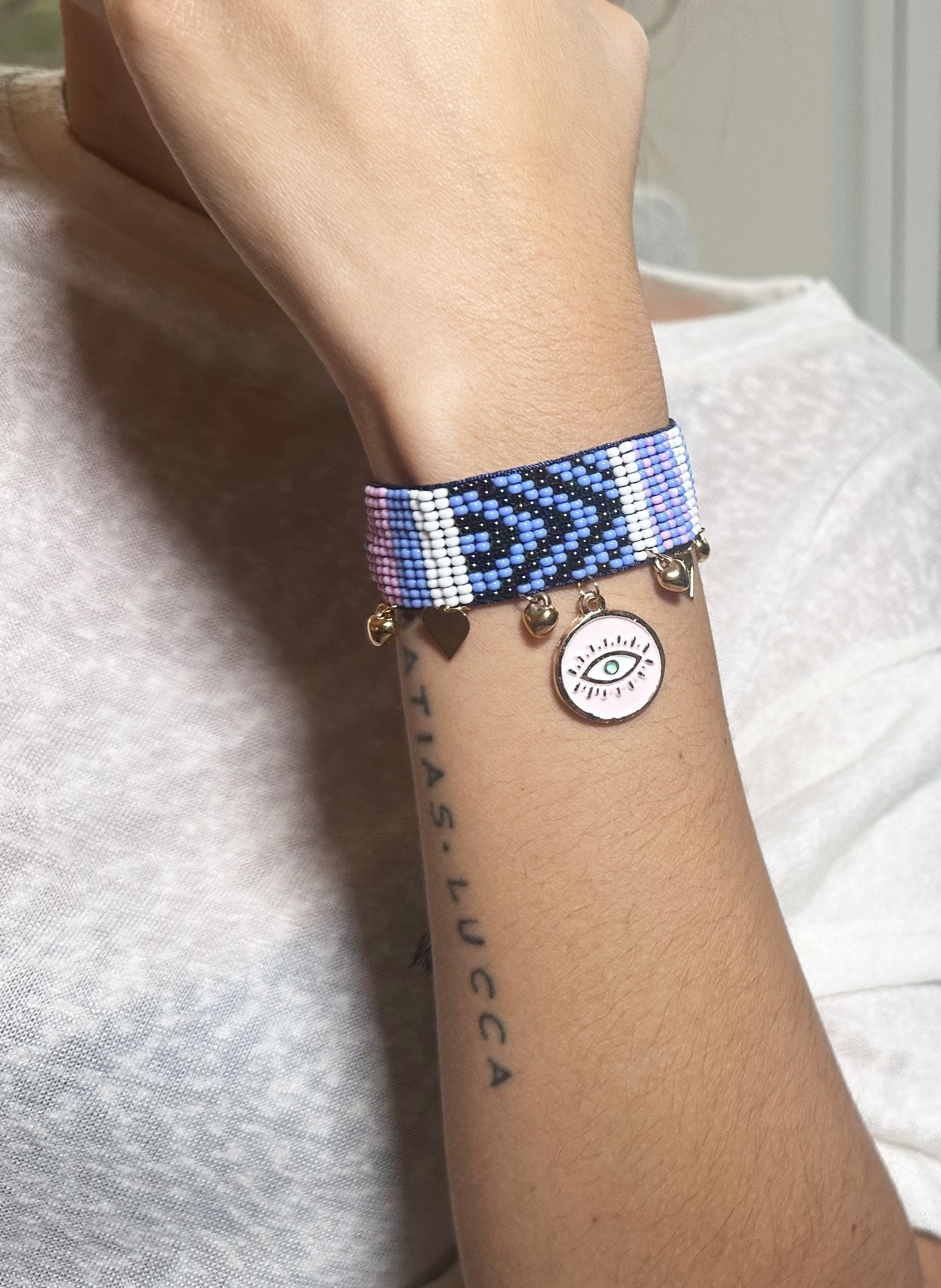 Pulsera hecha a mano, tejida con mostacilla checa con nudo corredizo. Dijes y acabados en oro gold filled.