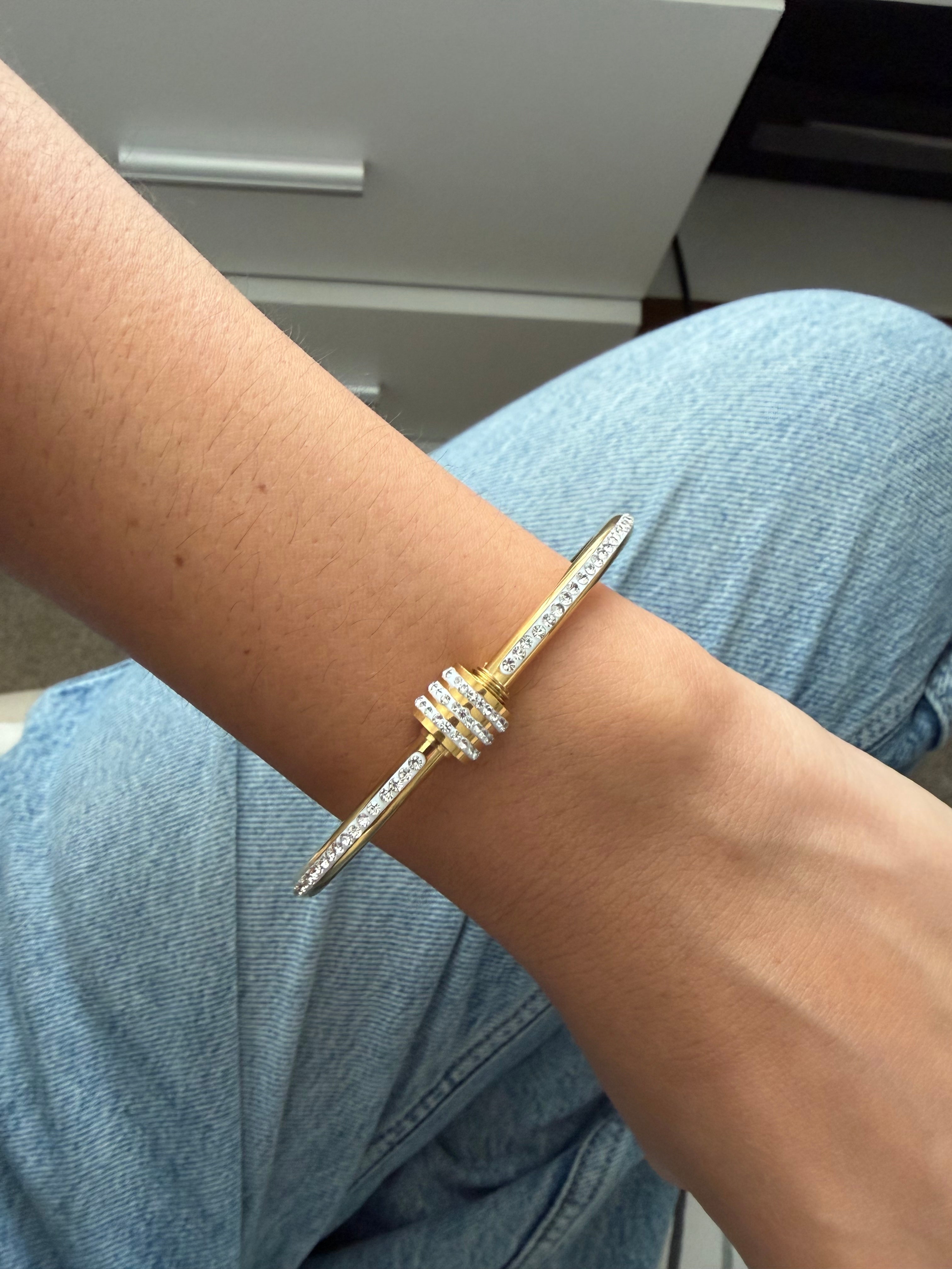 Este aro rígido dorado, fabricado en acero inoxidable, destaca por su diseño limpio y sofisticado, decorado con circones clear que aportan un brillo sutil y elegante. Su estructura rígida ofrece un ajuste firme y cómodo, ideal para el uso diario.