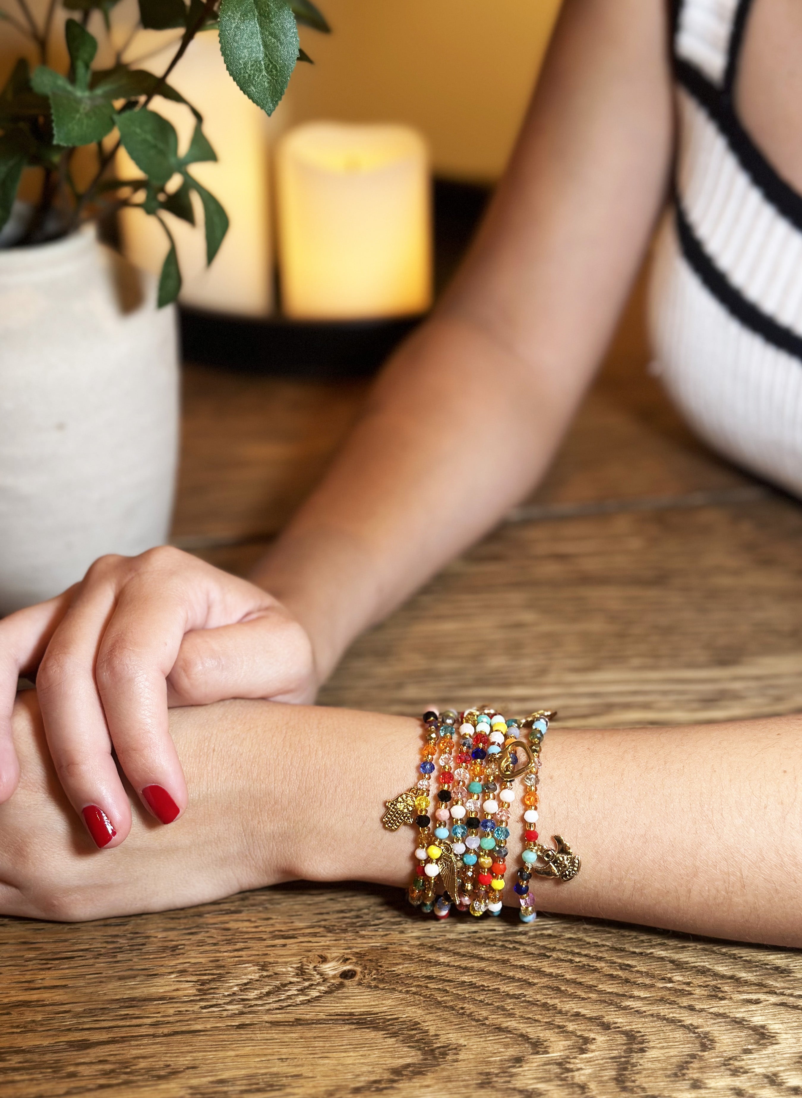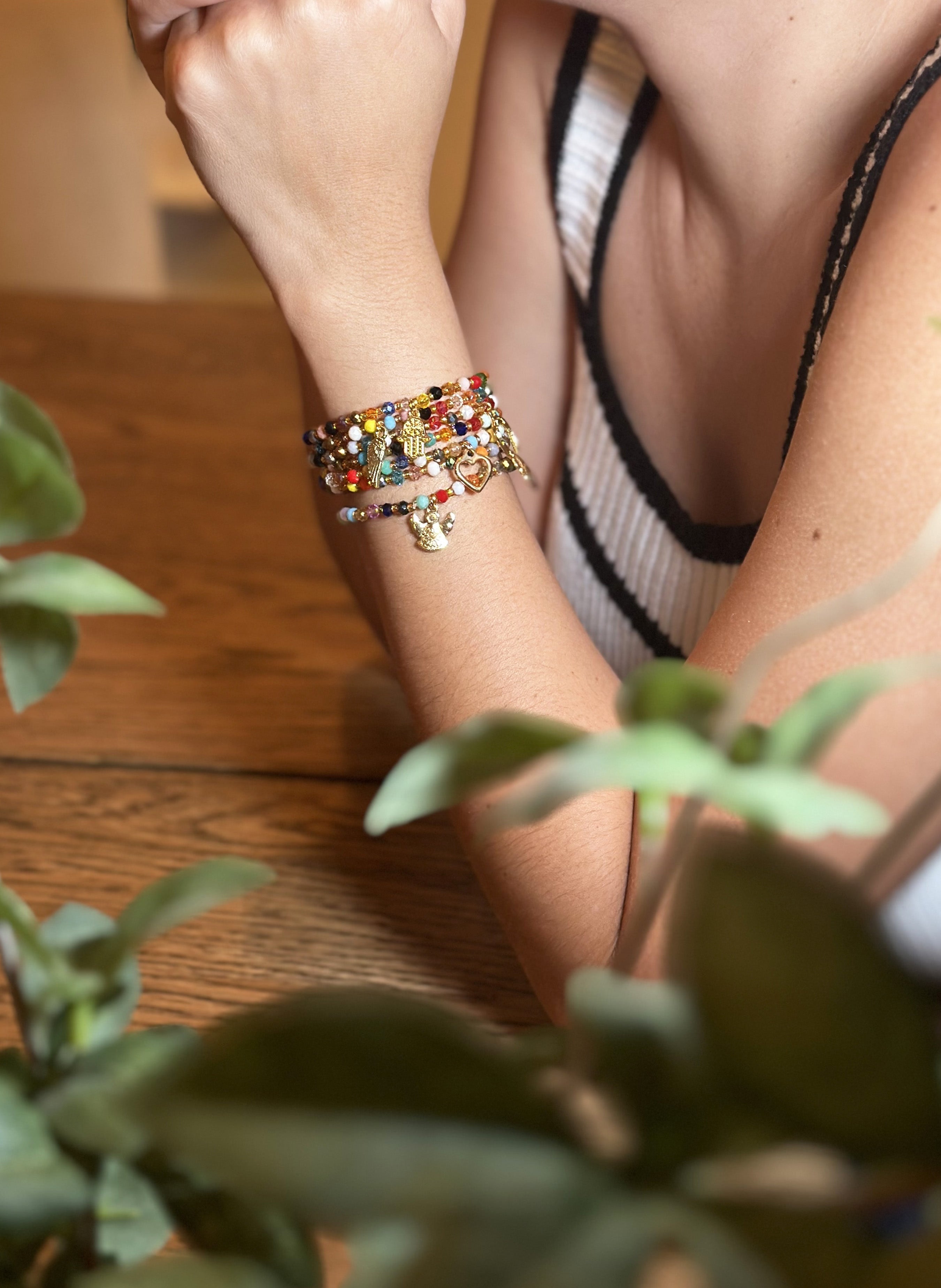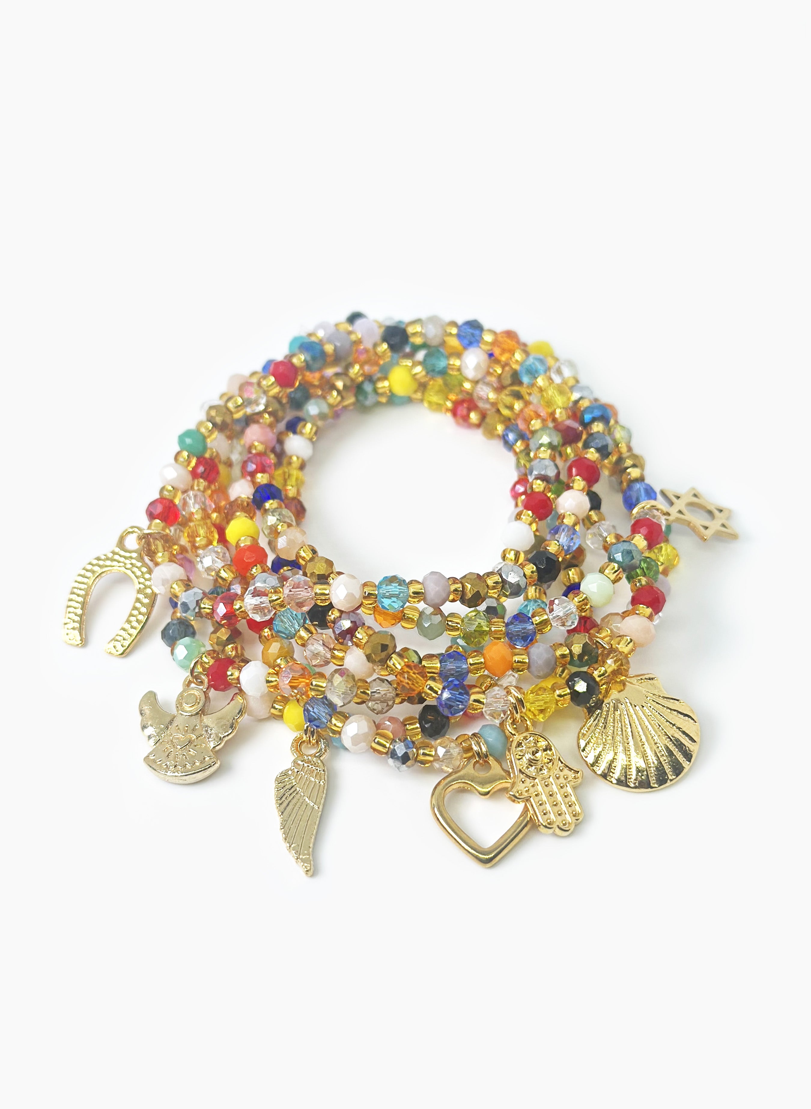 Set de 7 pulseras elásticas hechas a mano en cristales y mostacilla doradas con dijes rodinados con baño en oro de 24 kilates