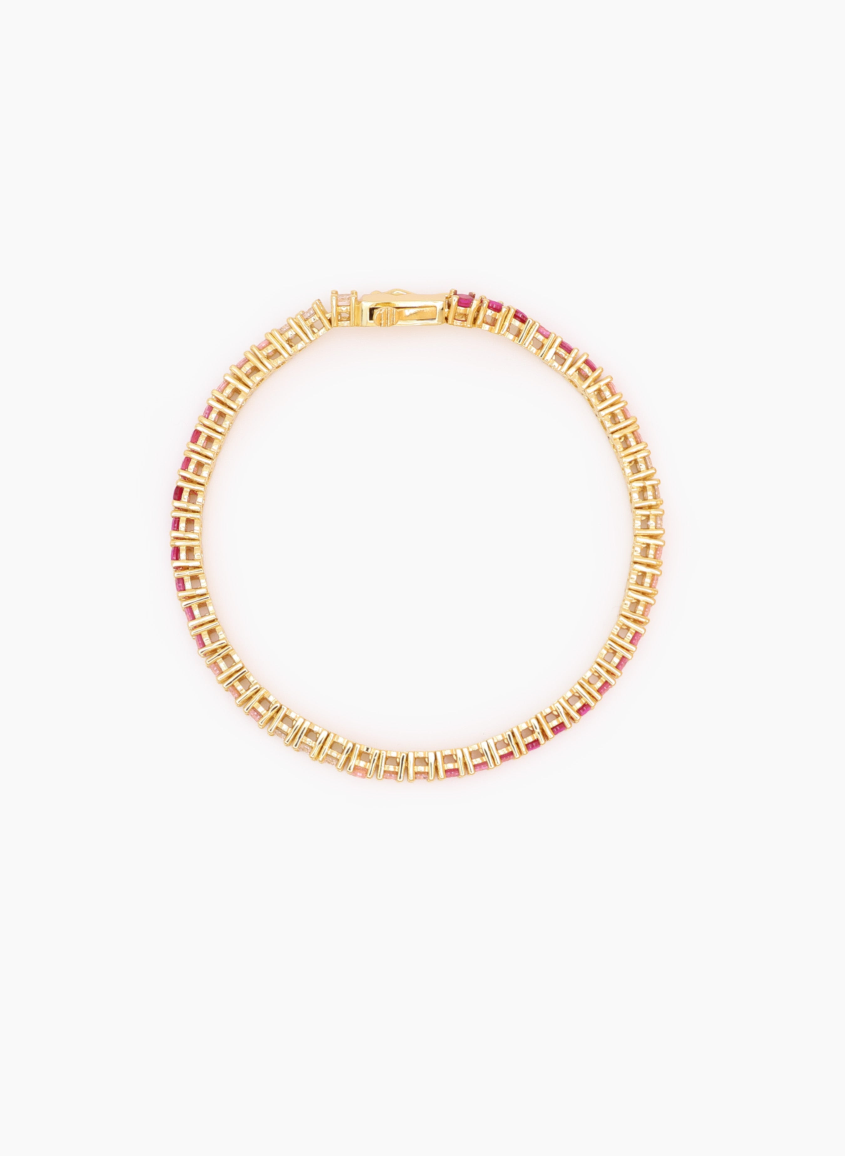 Pulsera estilo tennis bañada en oro, con circones en tonos rosados y clear que aportan brillo y un toque de color sutil. Un diseño versátil, ideal para elevar cualquier look, desde el día a día hasta ocasiones especiales.