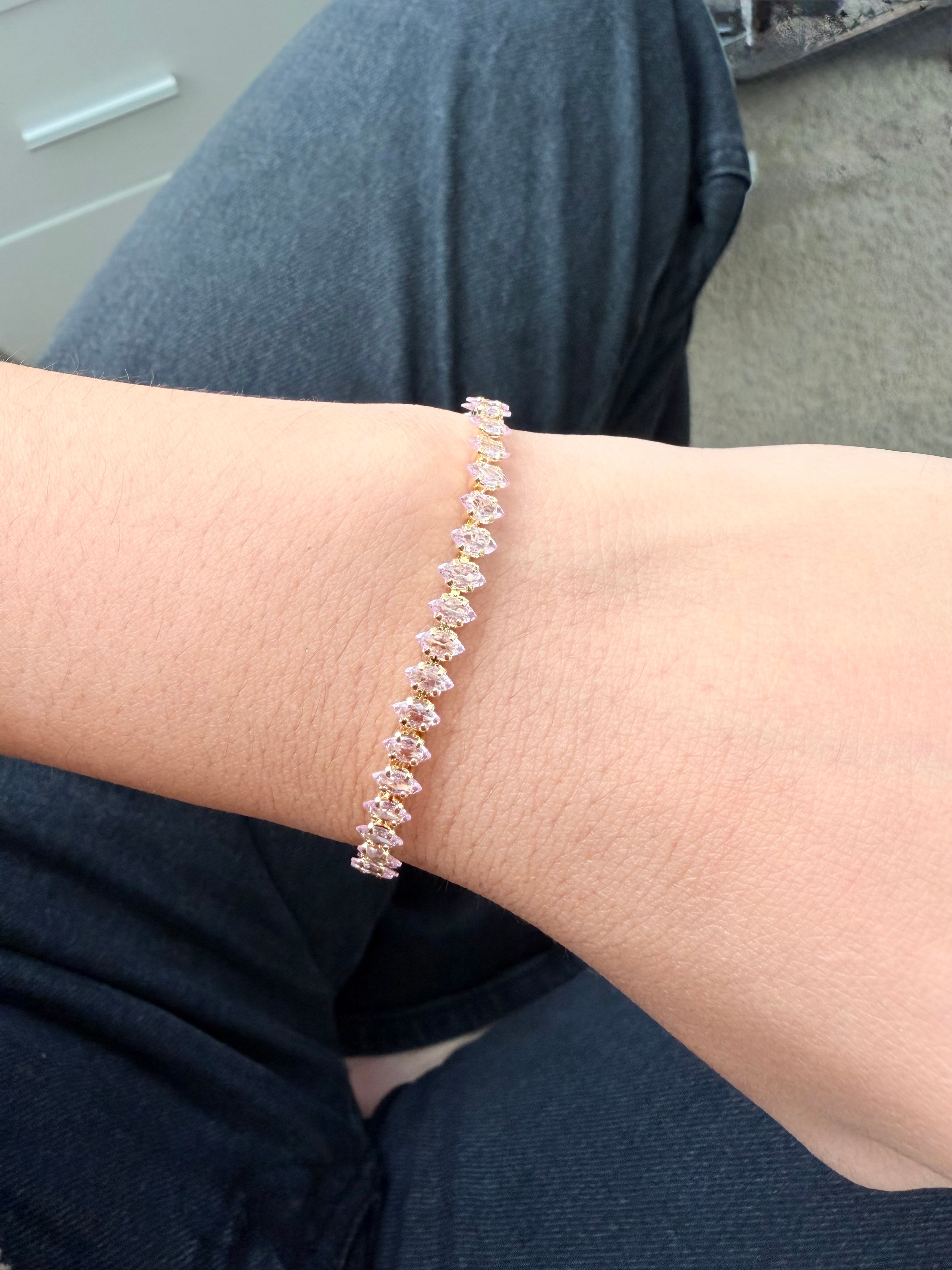 Pulsera bañada en oro con circones rosados, ideal para aportar un toque delicado y elegante.”