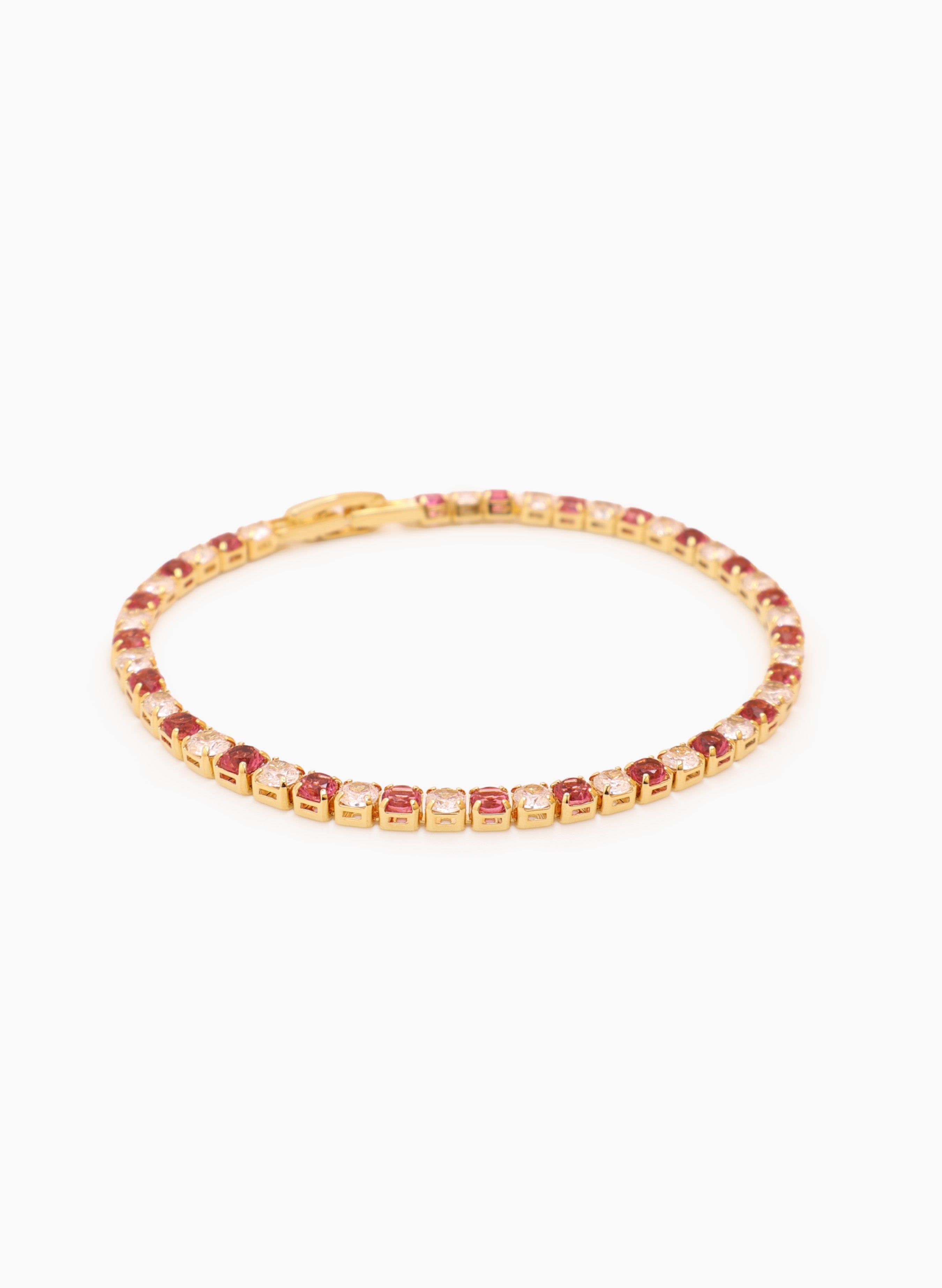 Pulsera estilo Tennis con baño en oro, diseñada en tonos rosado y clear que crean un brillo delicado y sofisticado. Su acabado elegante la hace ideal para elevar cualquier look, desde el día a día hasta ocasiones especiales. Mide 17 cm, un tamaño perfecto para lucirla sola o combinada con otras pulseras.