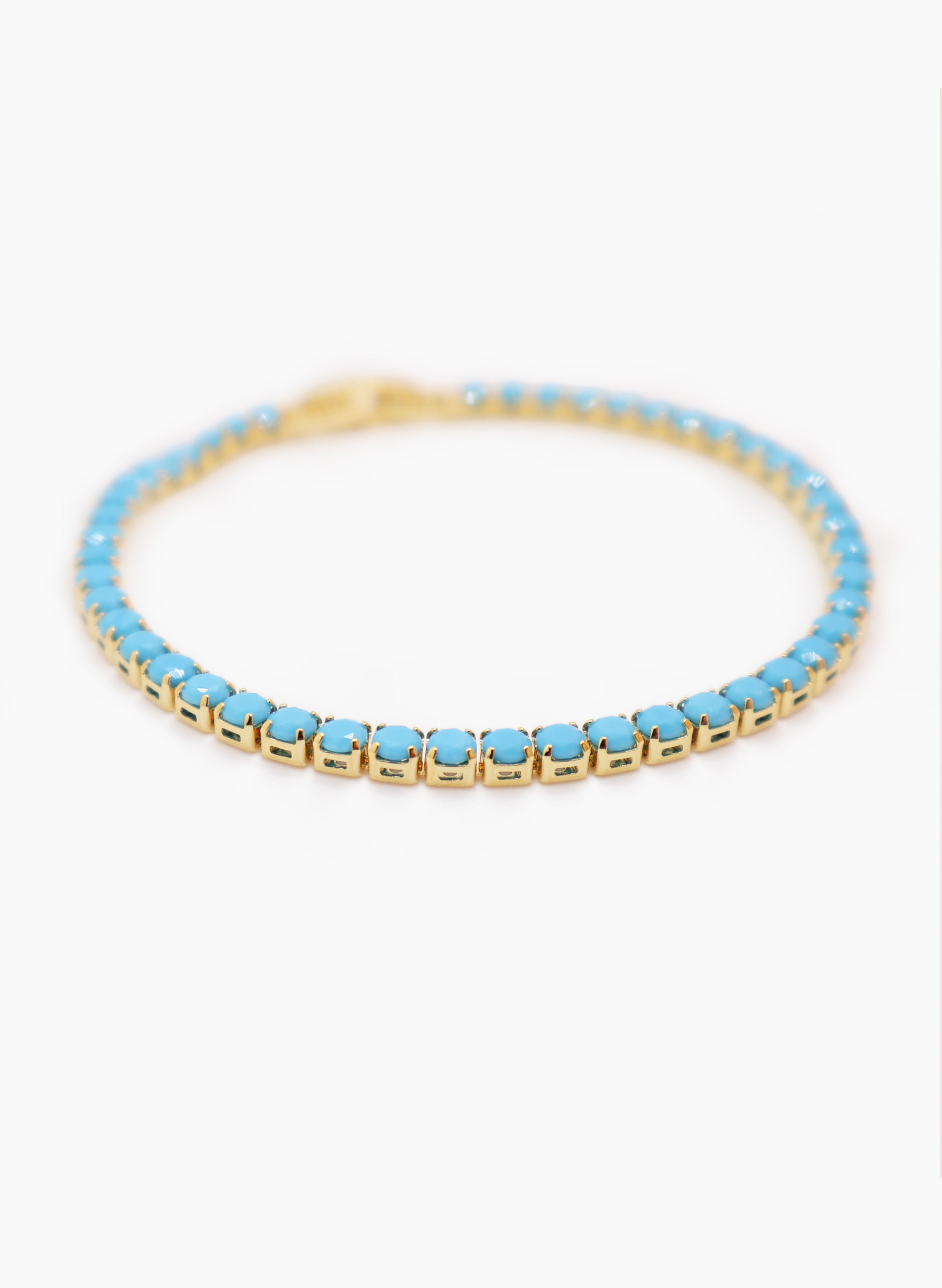 Pulsera con circones color turquesa y acabados con baño en oro de 18k.